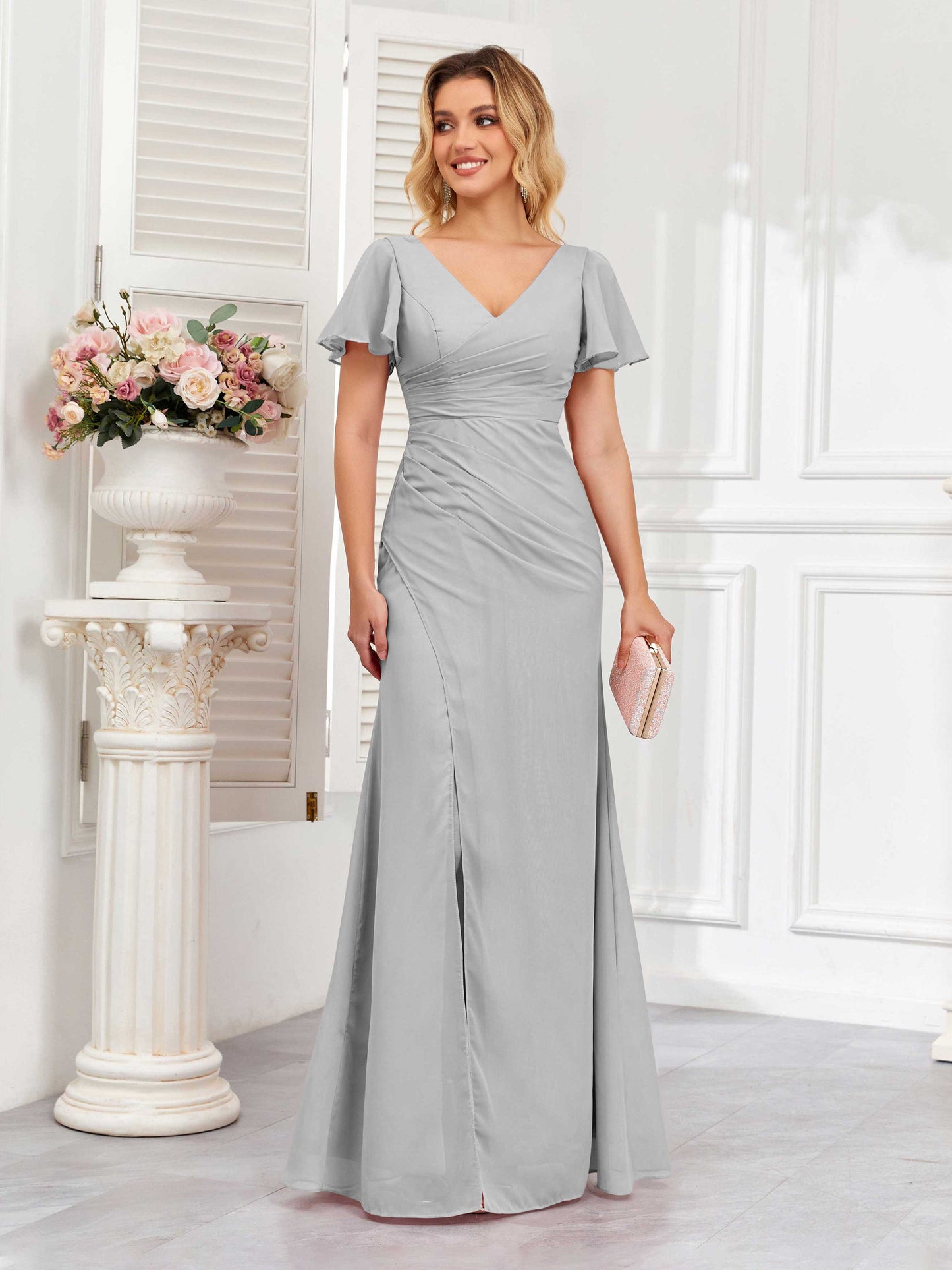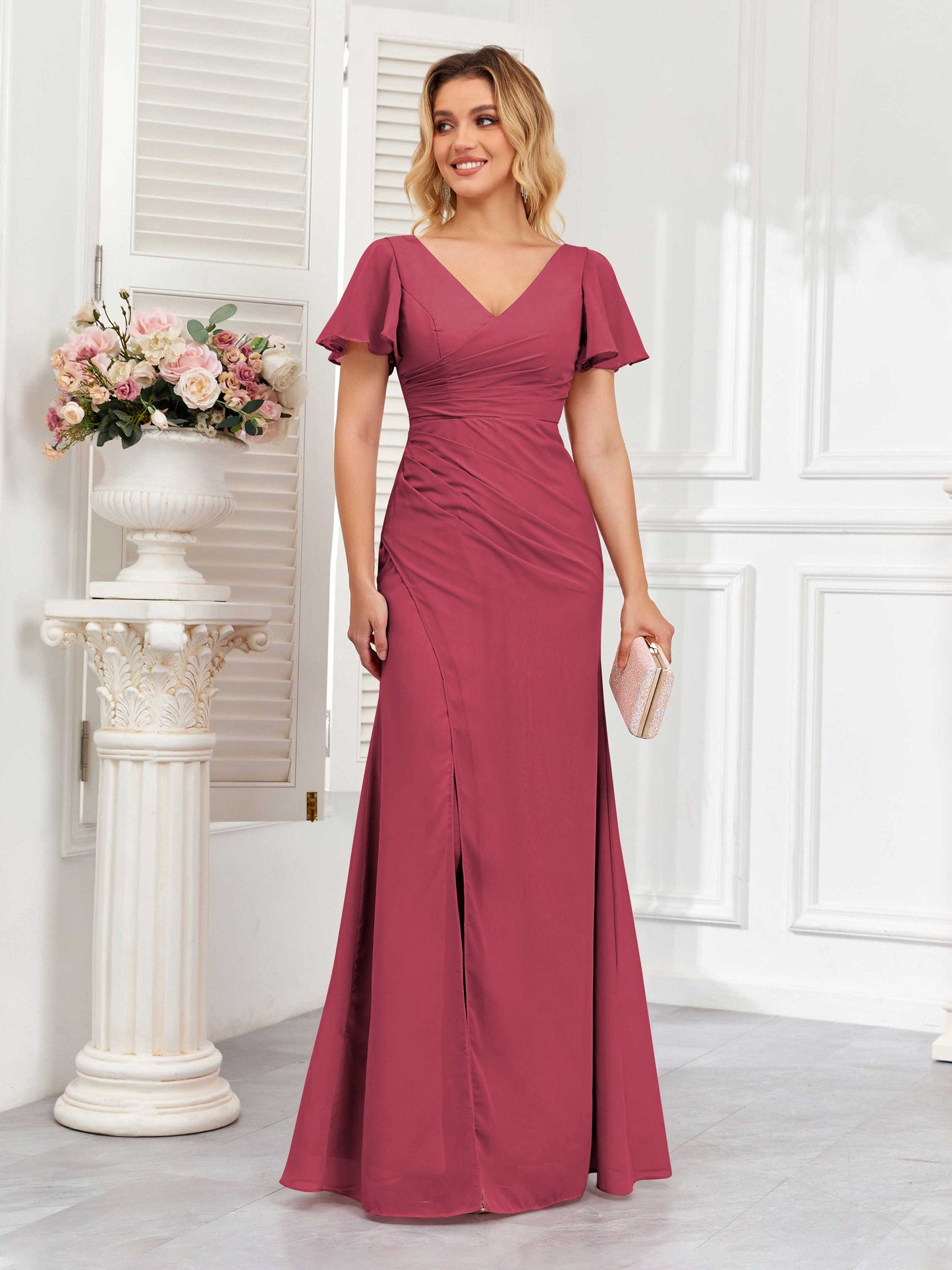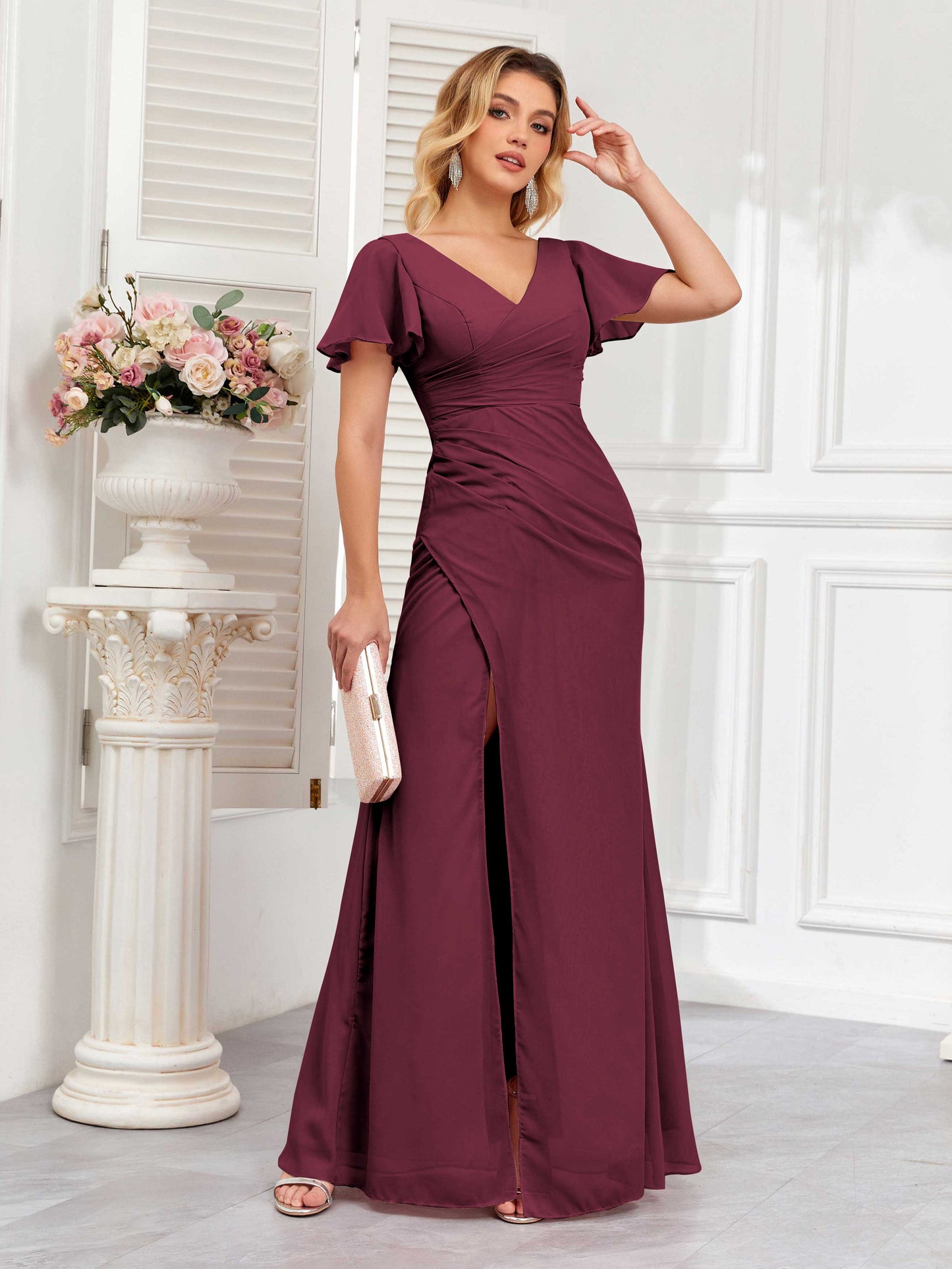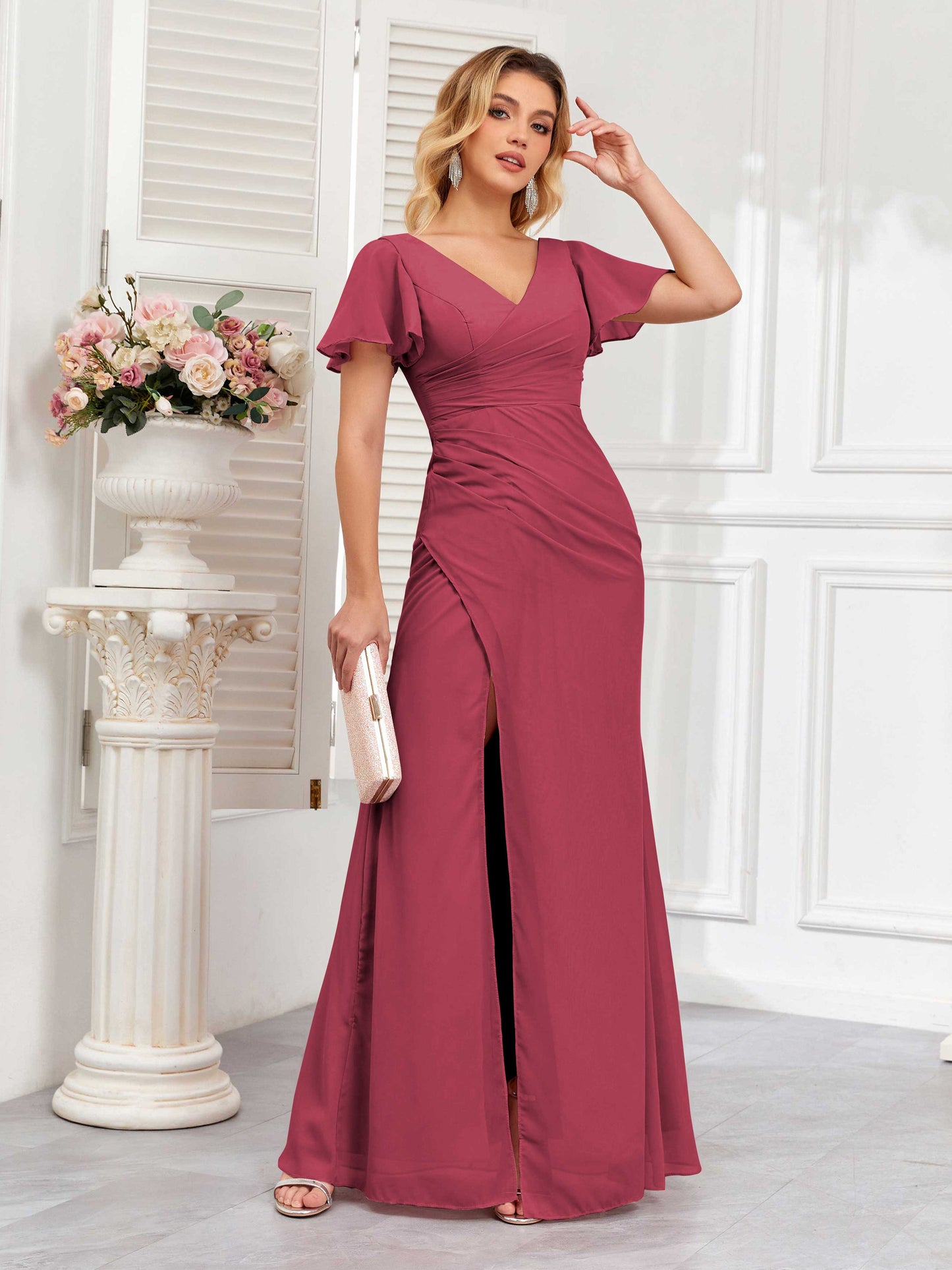• Glow with elegance in the Radiant V-Neck Sheath Slit Ruched Long Chiffon Bridesmaid Dress from Mollyevers. Featuring a flattering V-neck, ruched bodice, and a sleek sheath silhouette with a daring side slit, this long chiffon dress offers a sophisticated yet striking look for your bridesmaids.
