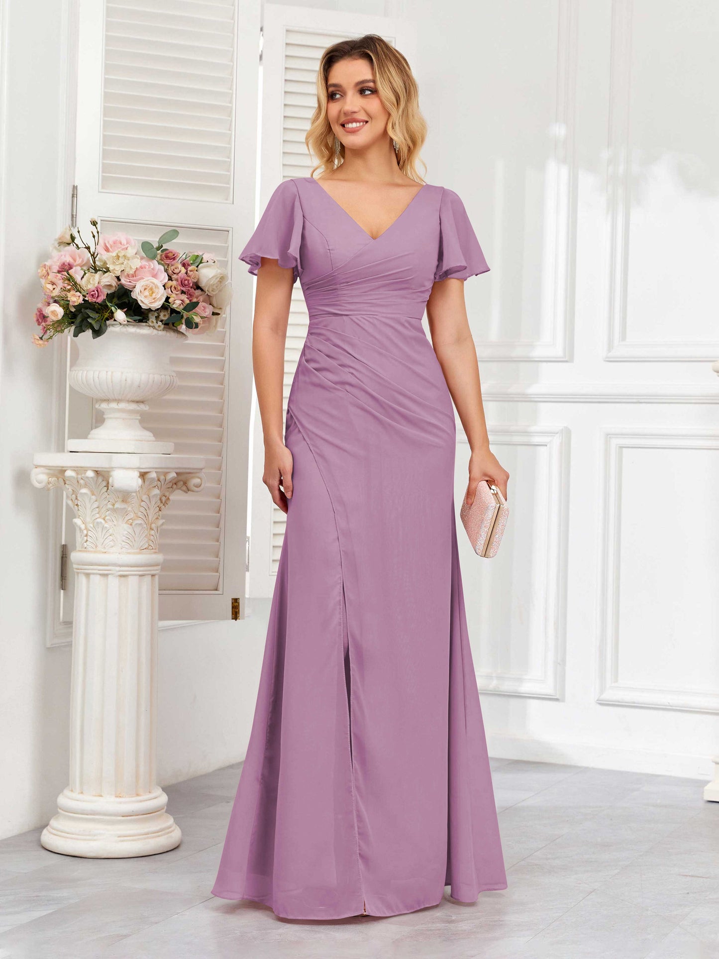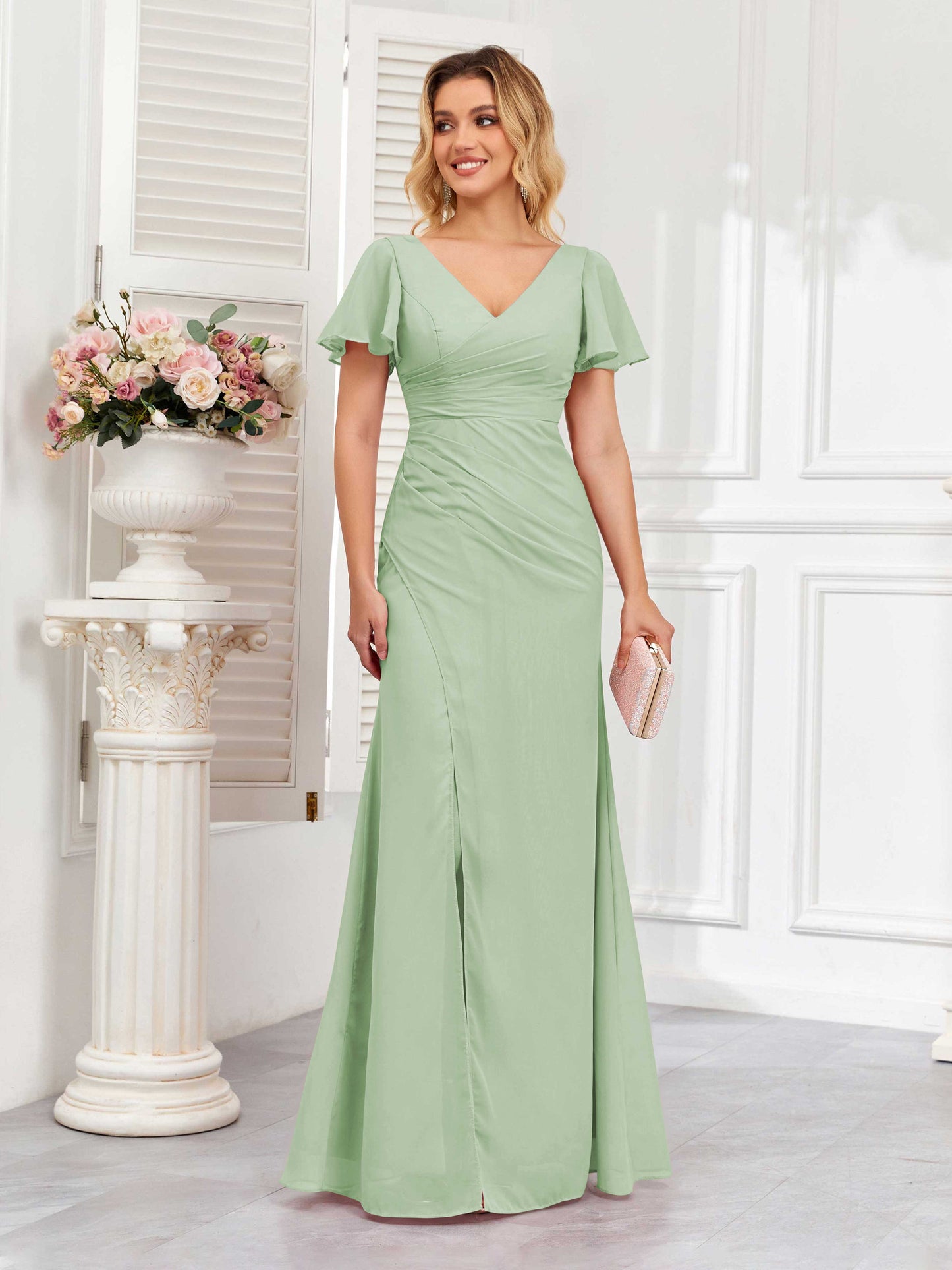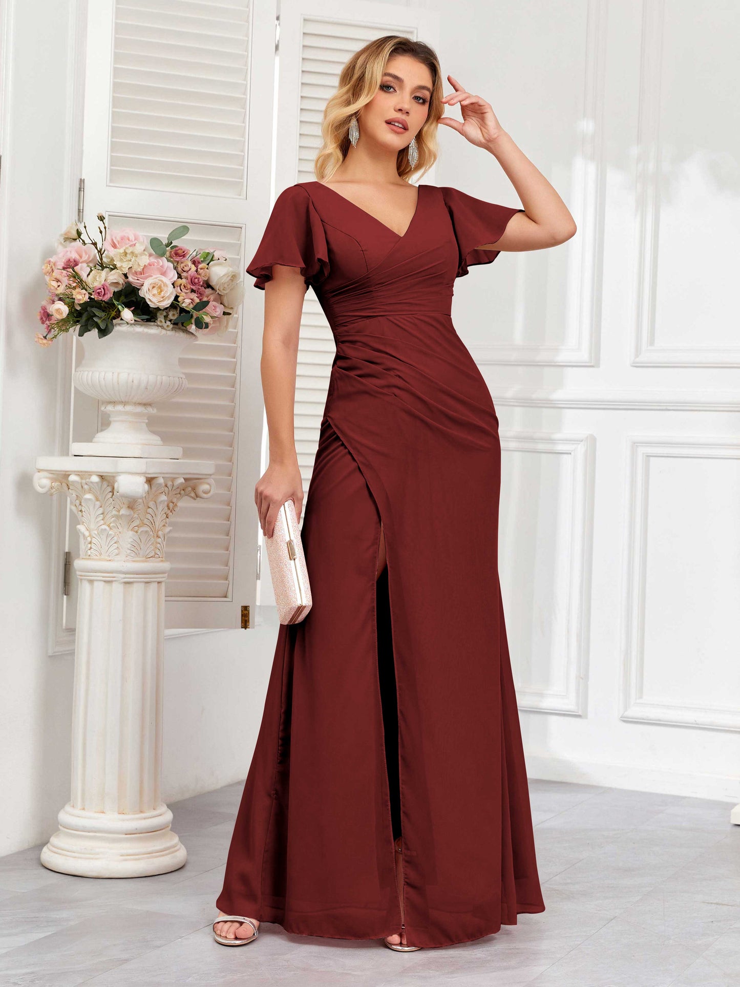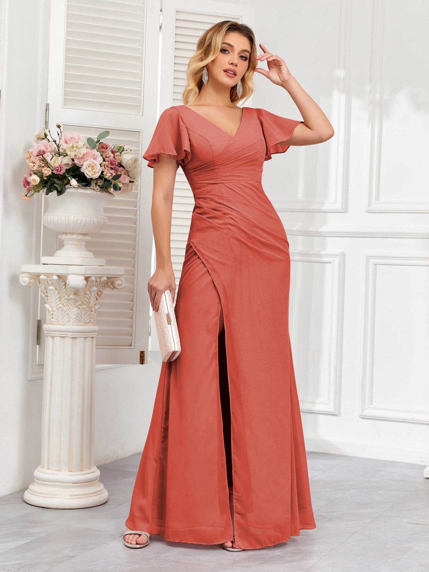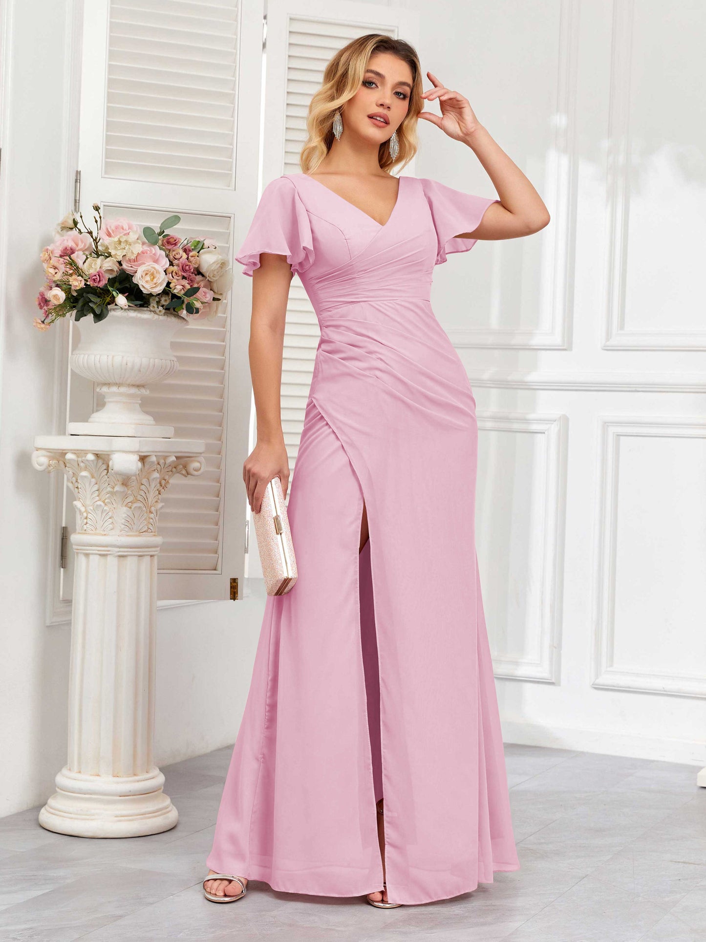 • Glow with elegance in the Radiant V-Neck Sheath Slit Ruched Long Chiffon Bridesmaid Dress from Mollyevers. Featuring a flattering V-neck, ruched bodice, and a sleek sheath silhouette with a daring side slit, this long chiffon dress offers a sophisticated yet striking look for your bridesmaids.