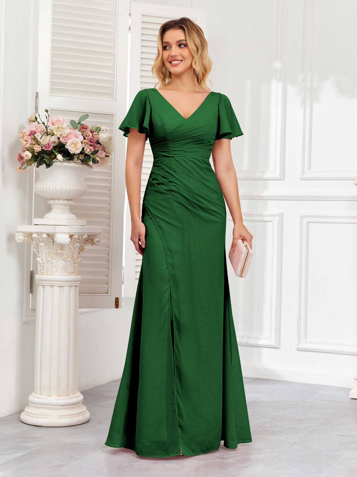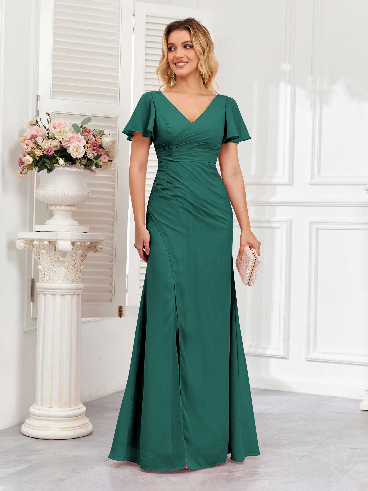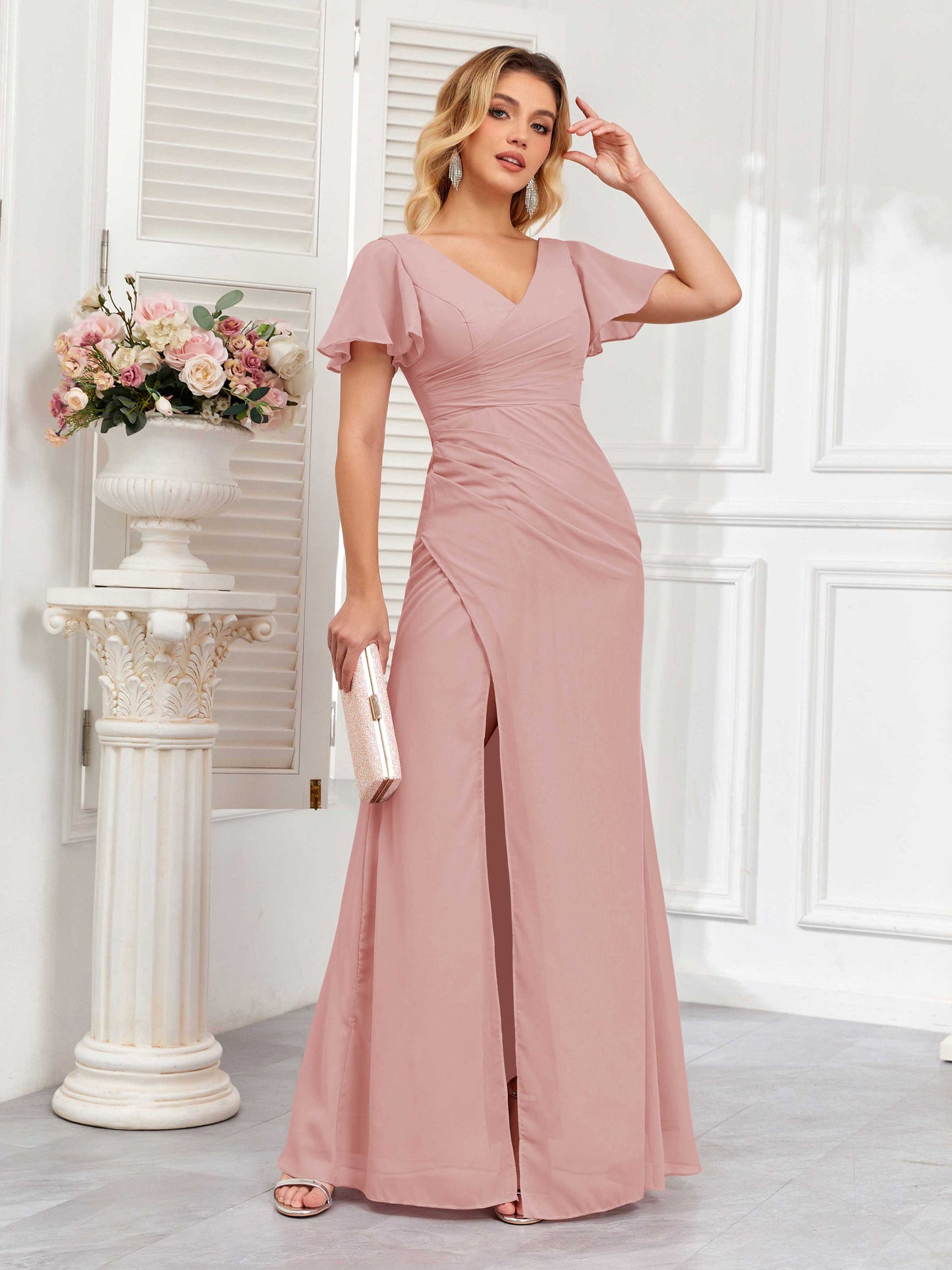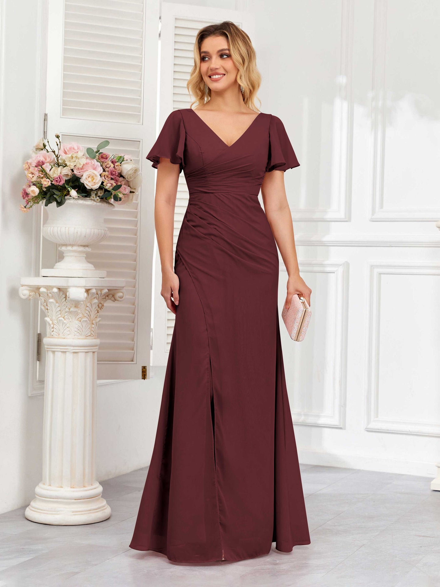 • Glow with elegance in the Radiant V-Neck Sheath Slit Ruched Long Chiffon Bridesmaid Dress from Mollyevers. Featuring a flattering V-neck, ruched bodice, and a sleek sheath silhouette with a daring side slit, this long chiffon dress offers a sophisticated yet striking look for your bridesmaids.