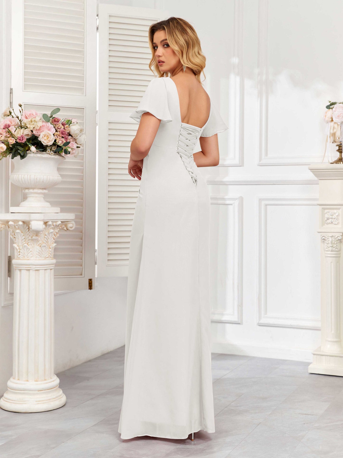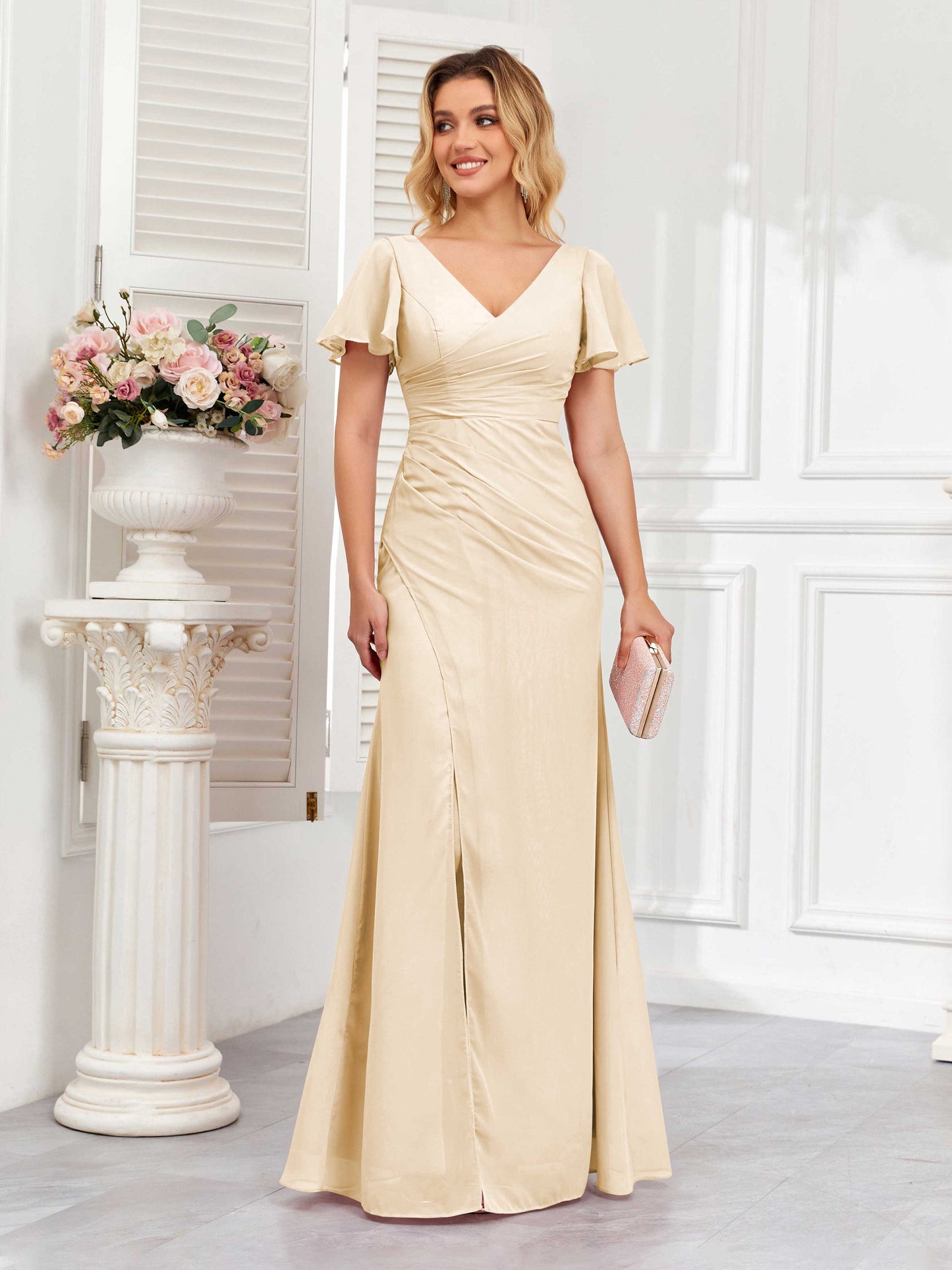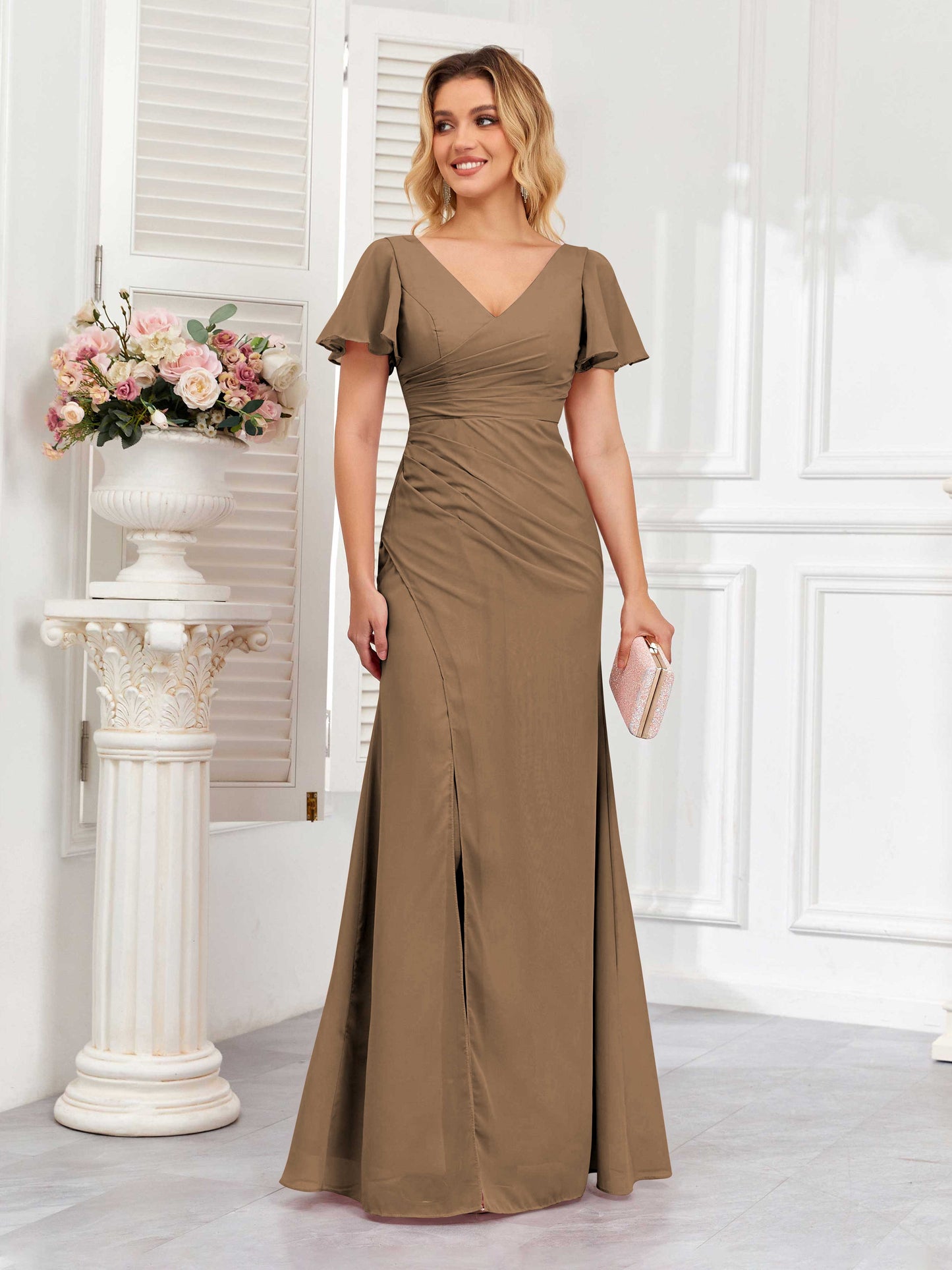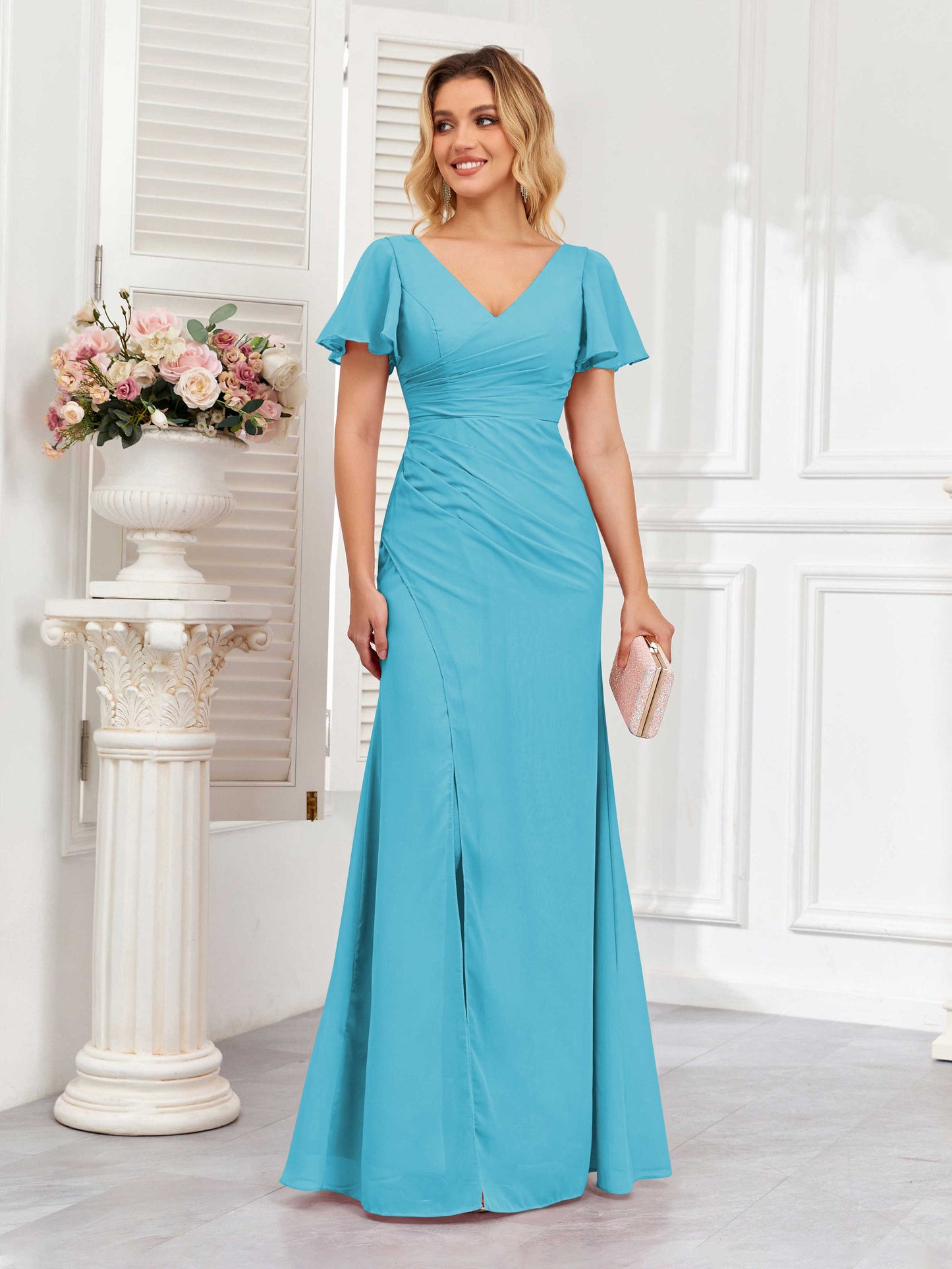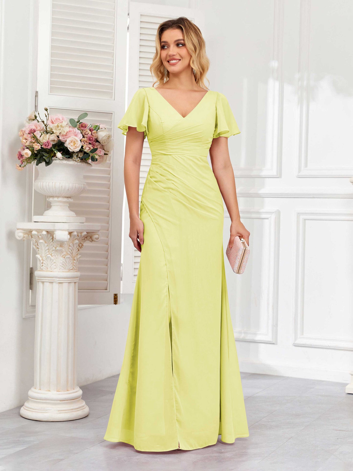 • Glow with elegance in the Radiant V-Neck Sheath Slit Ruched Long Chiffon Bridesmaid Dress from Mollyevers. Featuring a flattering V-neck, ruched bodice, and a sleek sheath silhouette with a daring side slit, this long chiffon dress offers a sophisticated yet striking look for your bridesmaids.