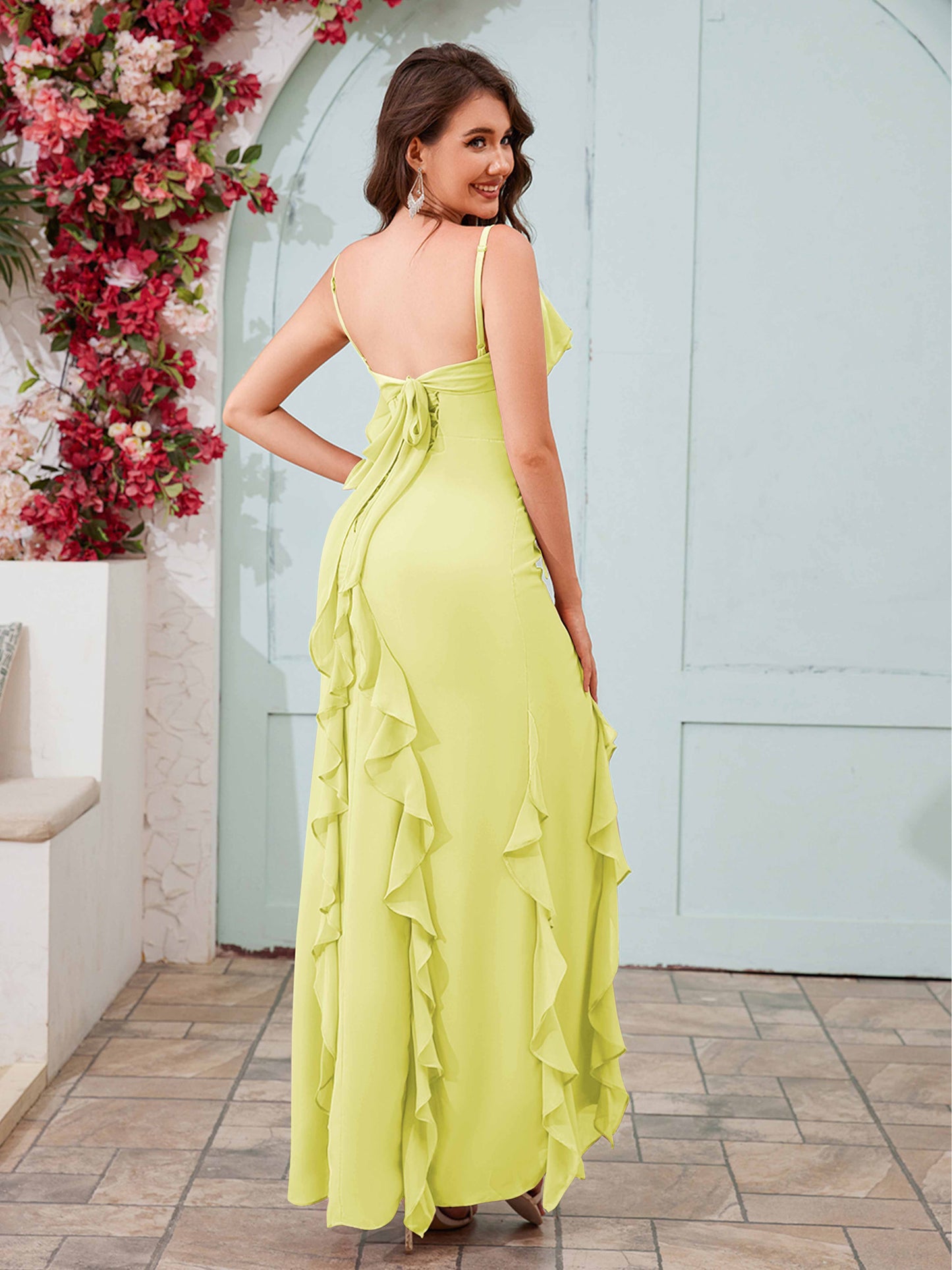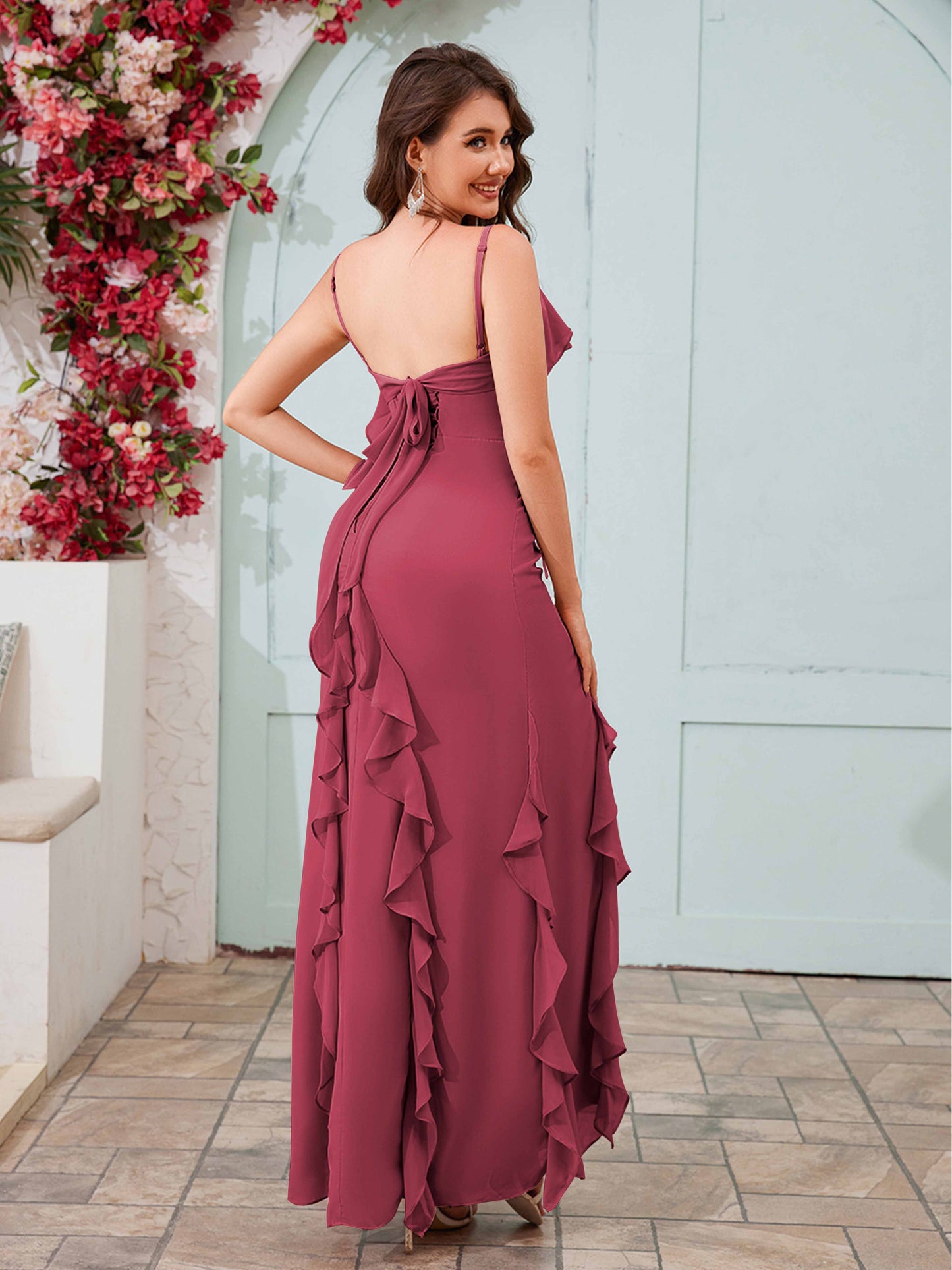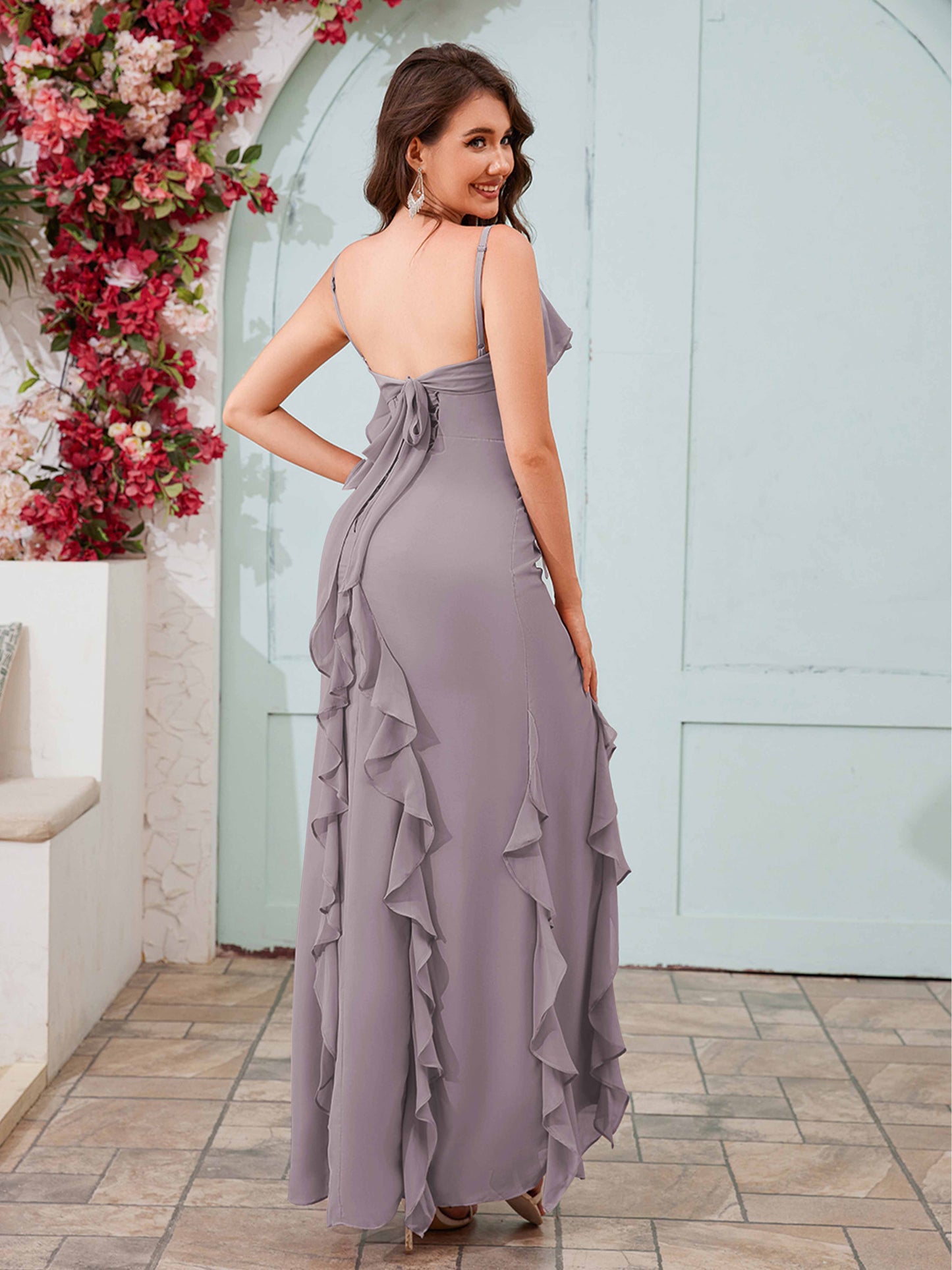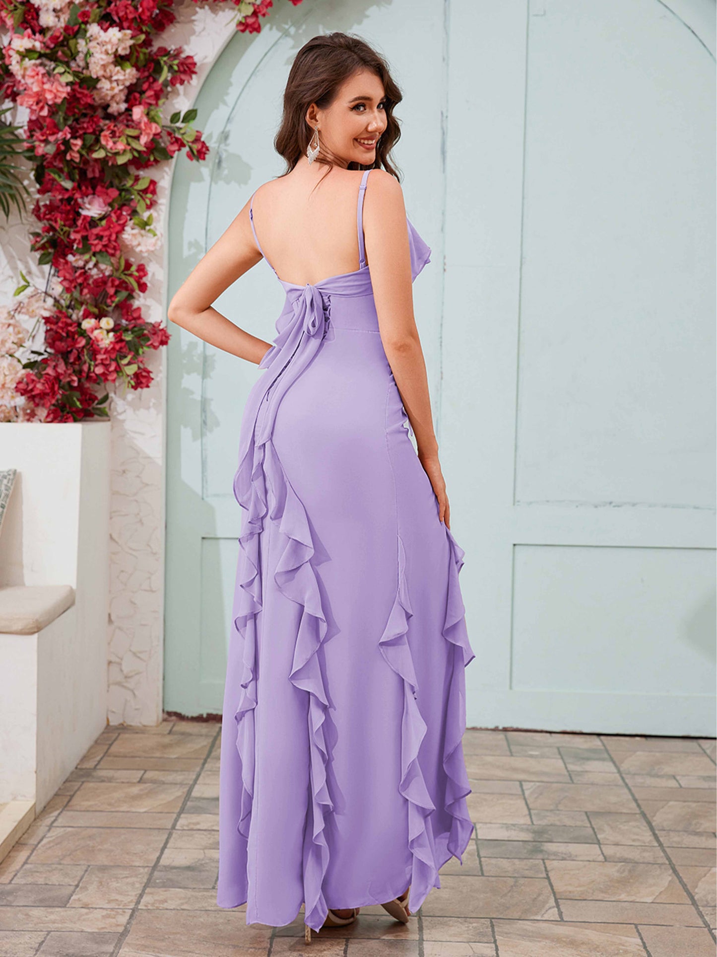 • Fall in love with Mollyevers' Romantic Ruffles Slit Bow Back Long Chiffon Bridesmaid Dresses. Adorned with delicate ruffles, a stylish slit, and an elegant bow back detail, this flowing chiffon gown is the perfect choice for a graceful and timeless look at weddings or special occasions.