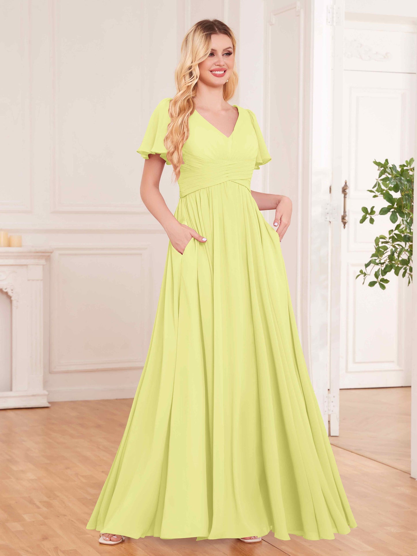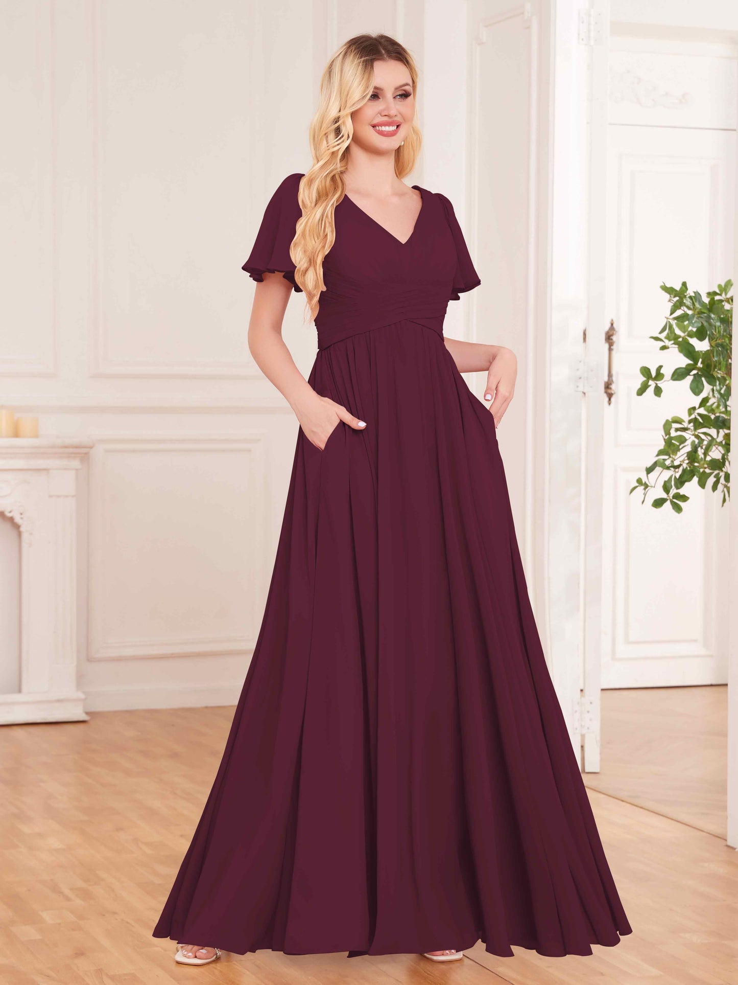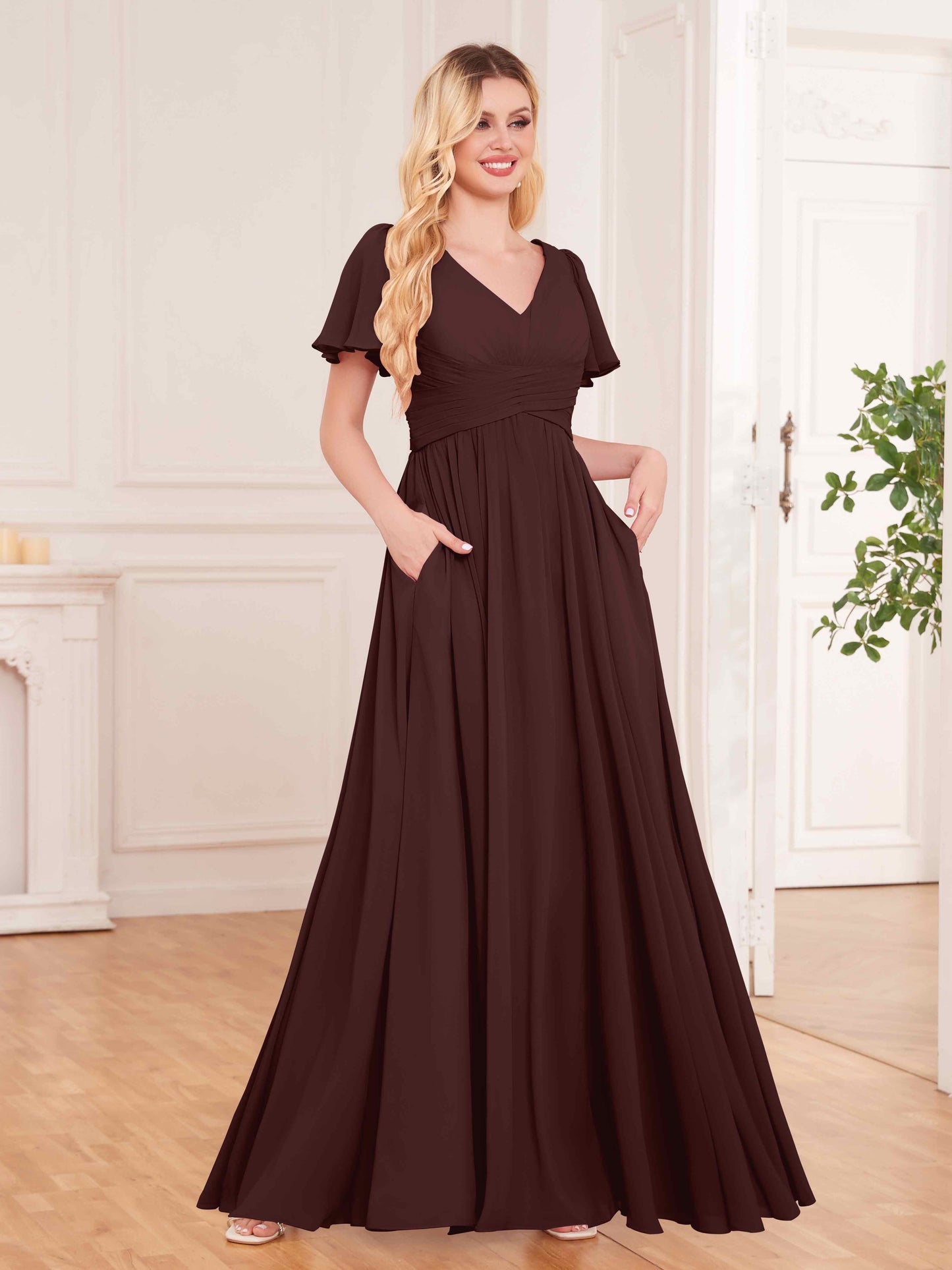 Simple Short Sleeves Floor Length Chiffon Bridesmaid Dresses UK With Pockets
