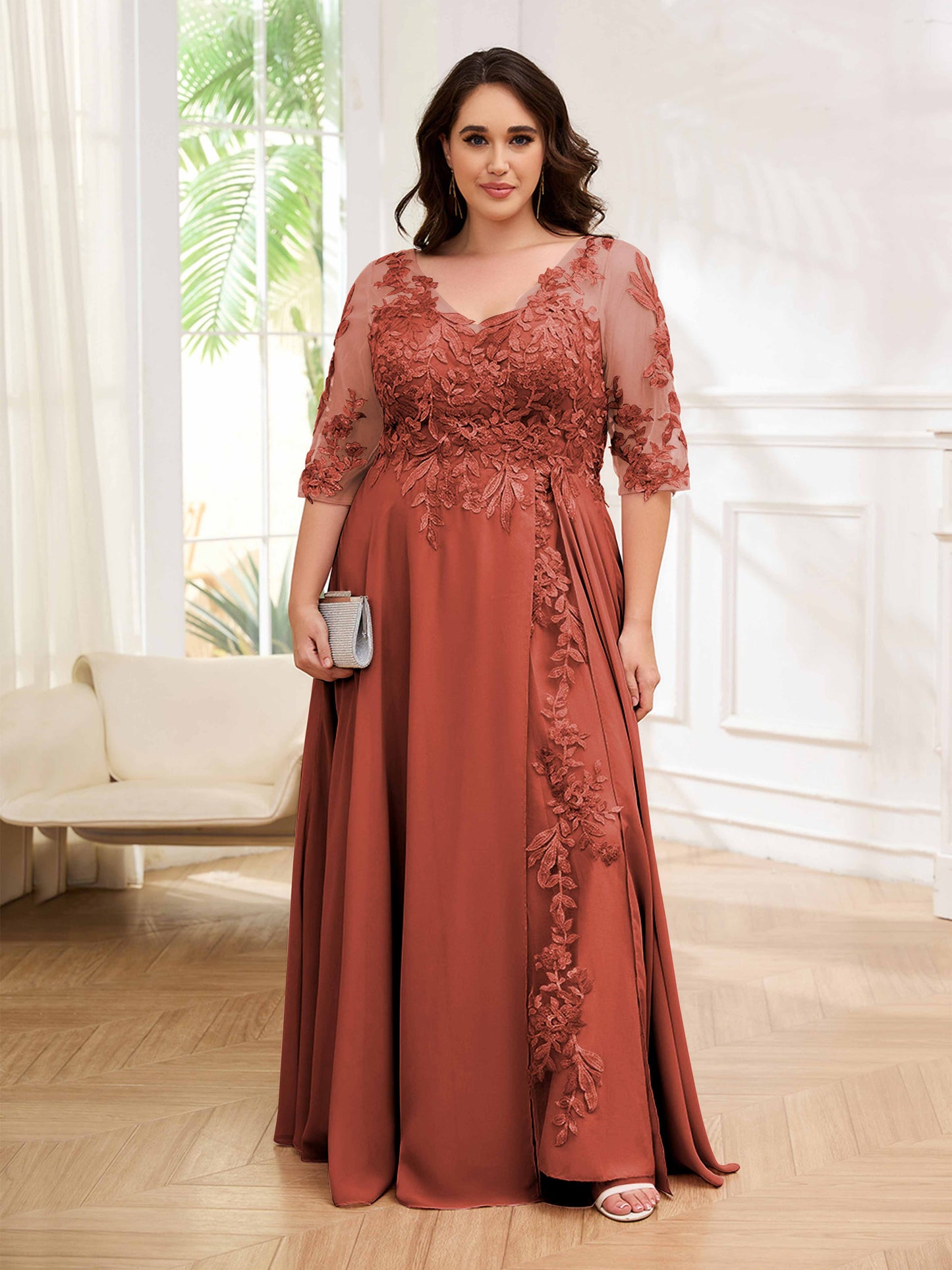 • Turn heads with this stunning applique floor-length chiffon mother of the bride dress. Designed for UK plus-size women, this dress offers a dramatic and elegant look. Perfect for a formal wedding, this dress will make you look stunning.