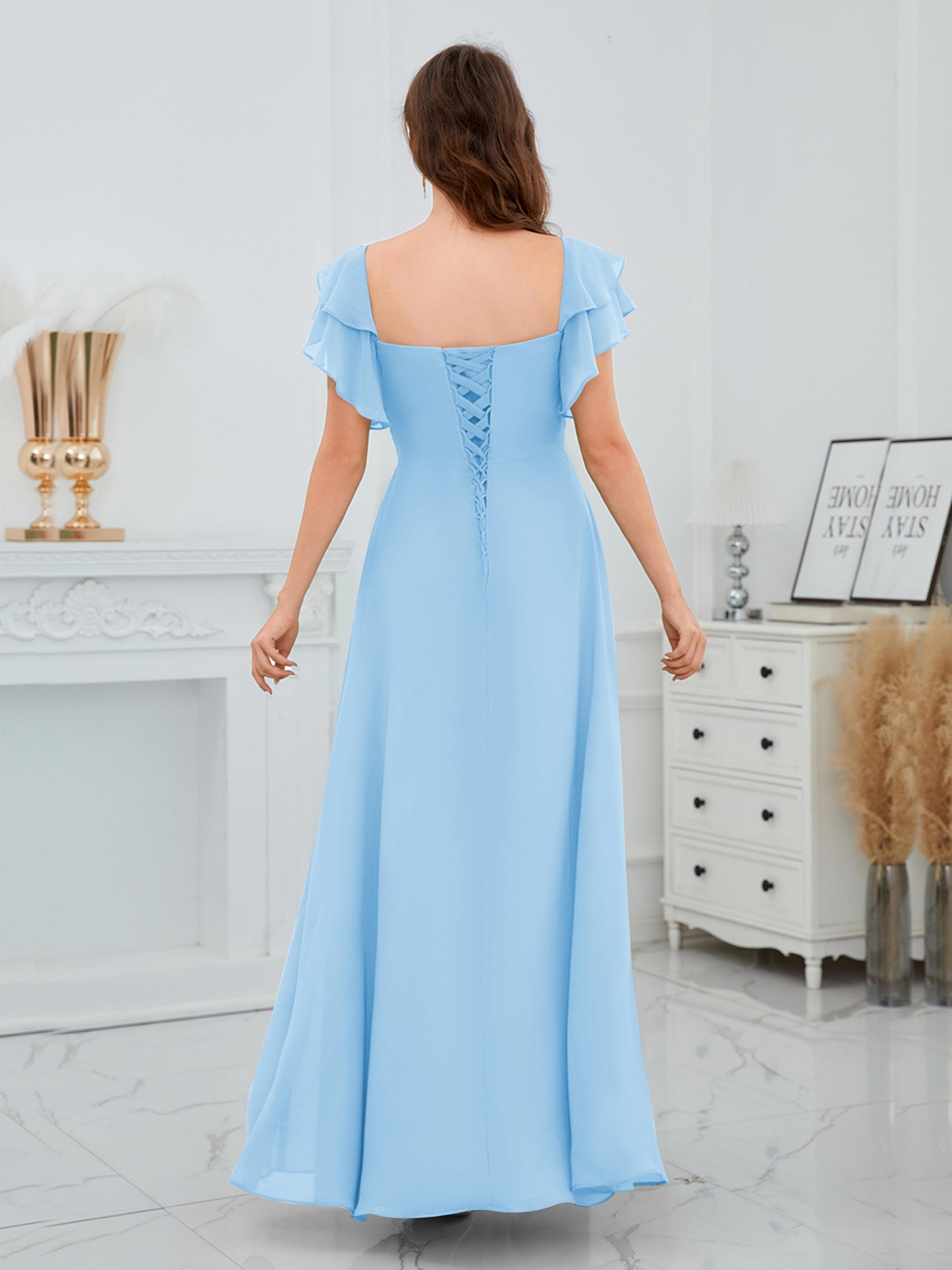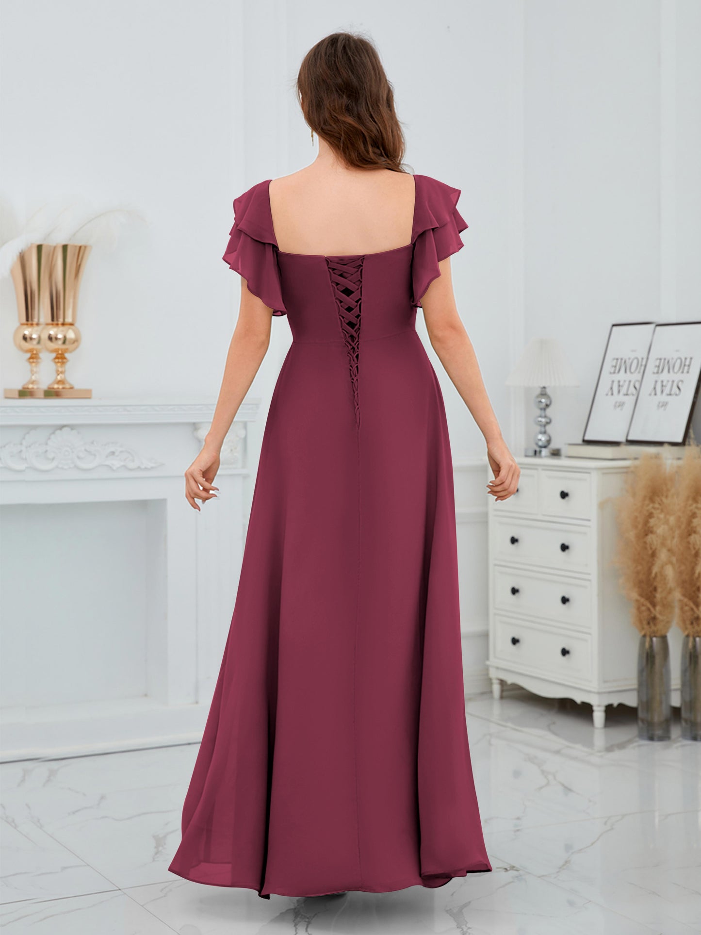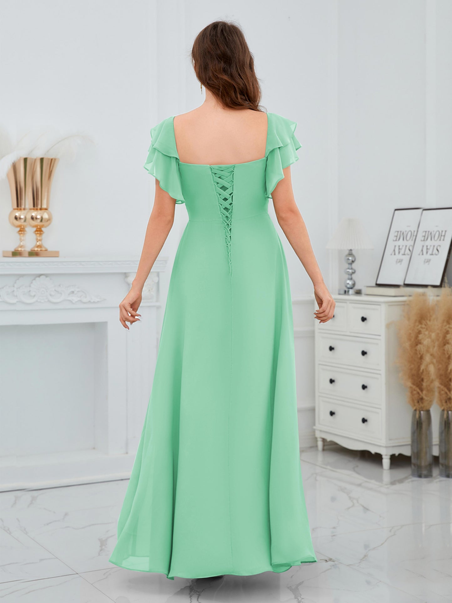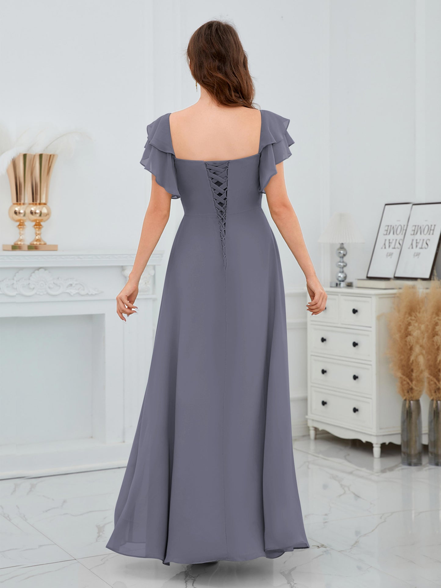 Stunning Short Sleeves Square Neck Slit Long Chiffon Bridesmaid Dresses UK