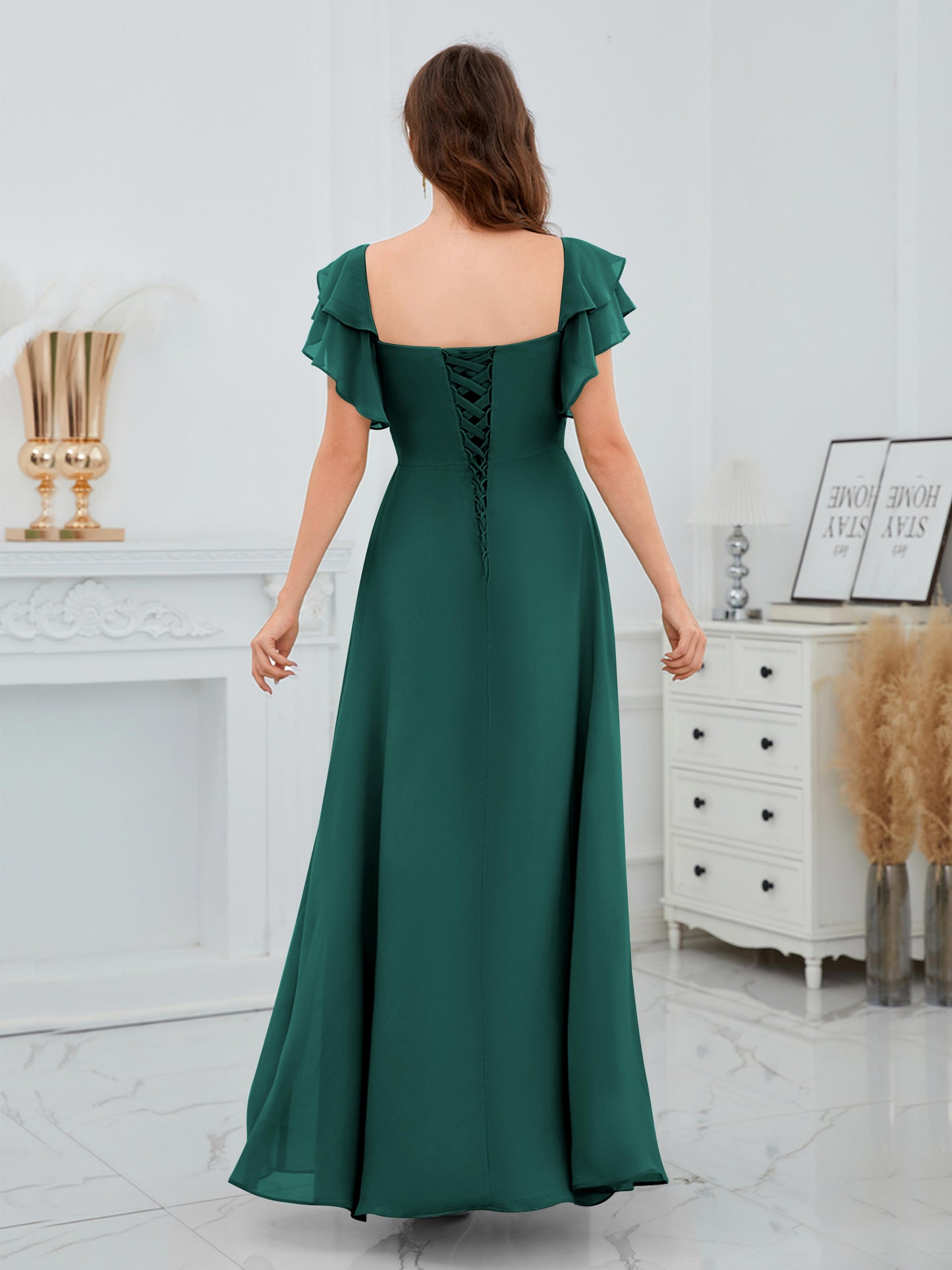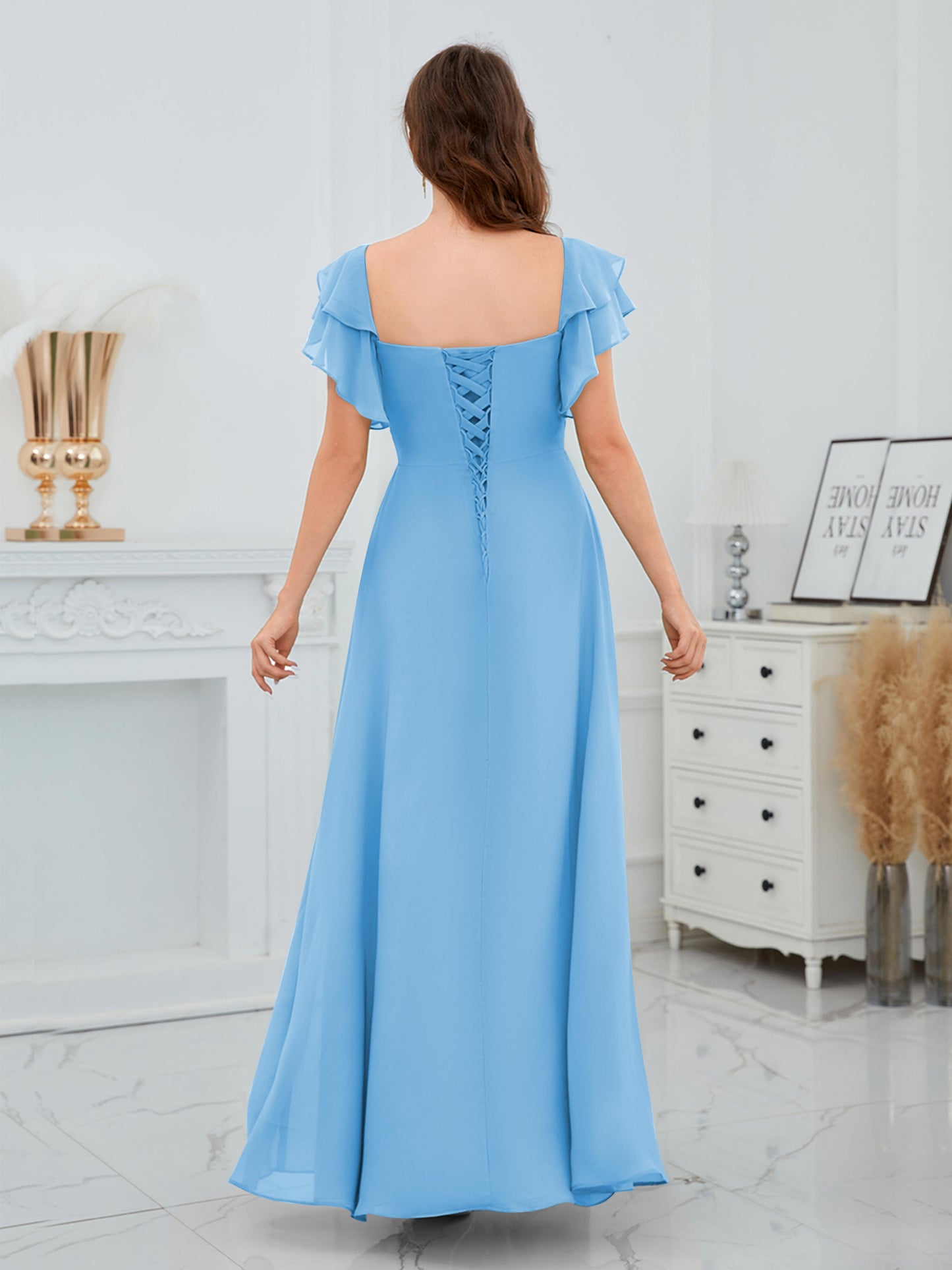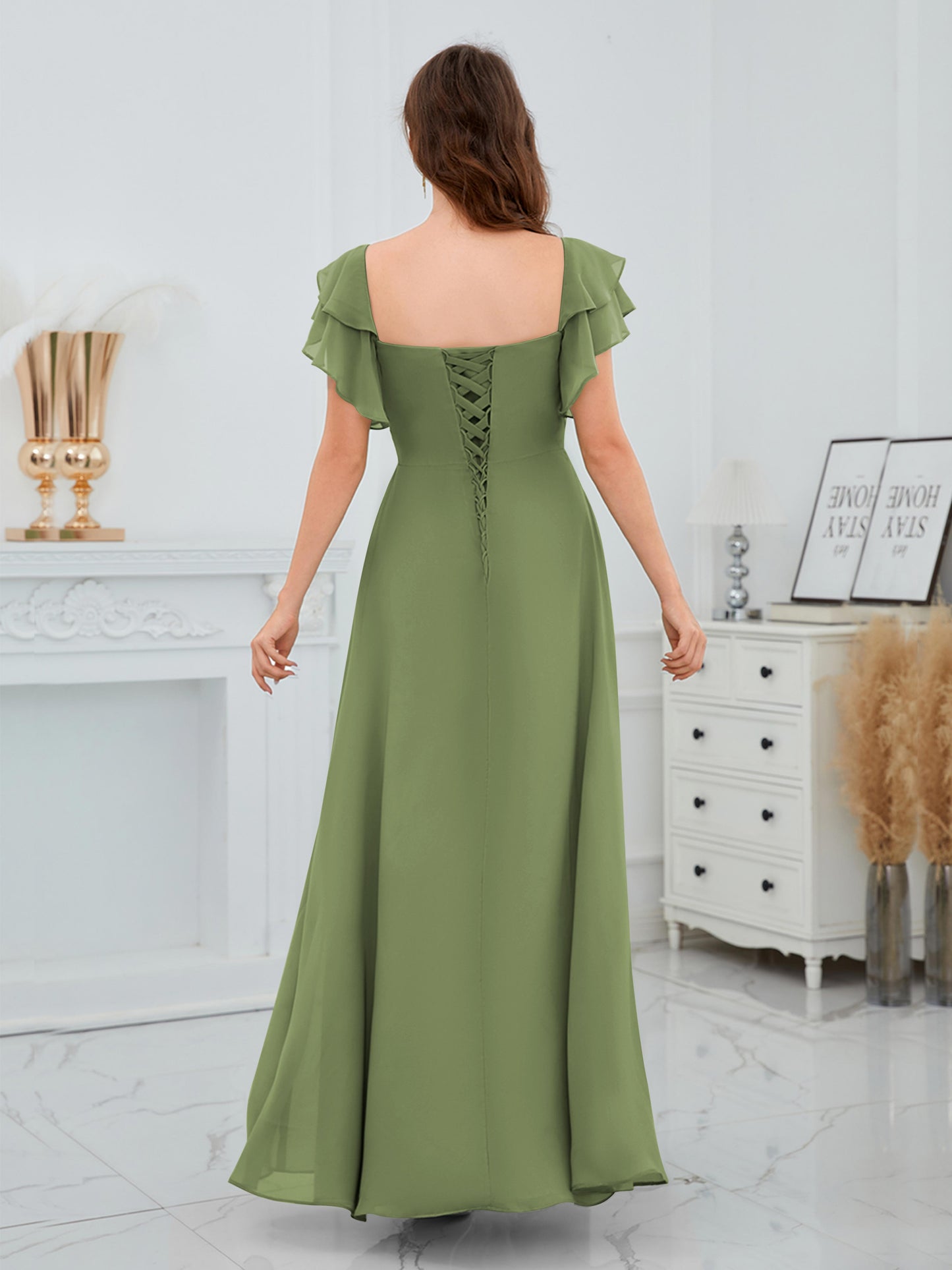 Stunning Short Sleeves Square Neck Slit Long Chiffon Bridesmaid Dresses UK