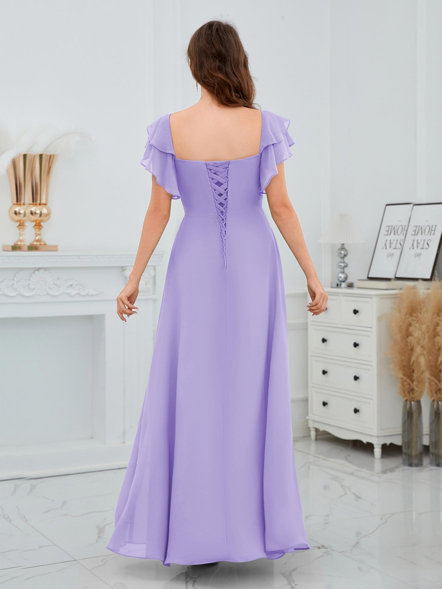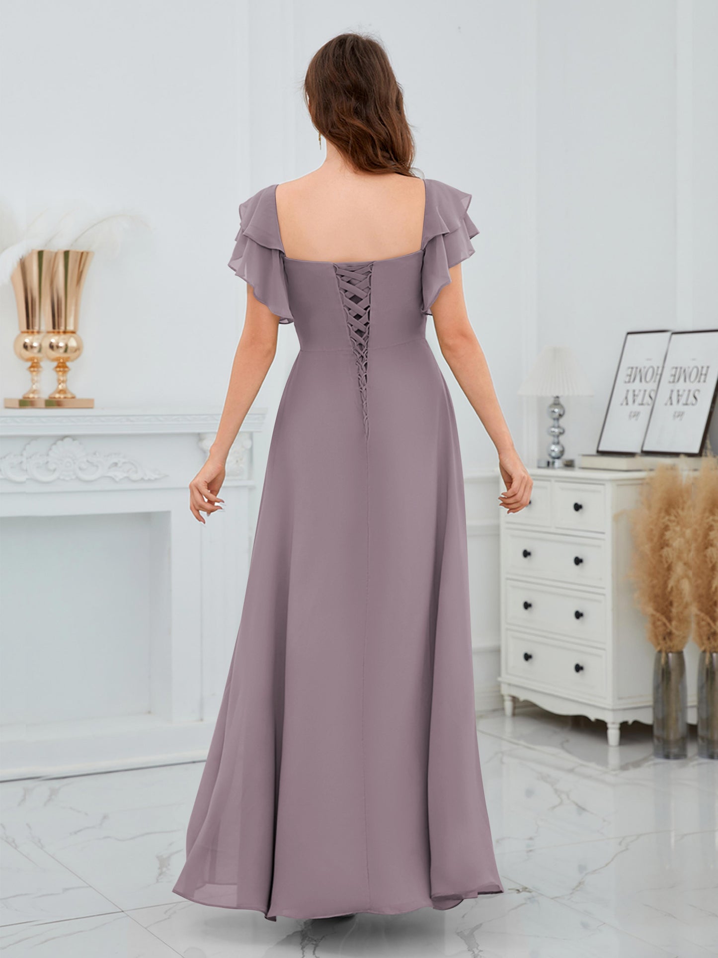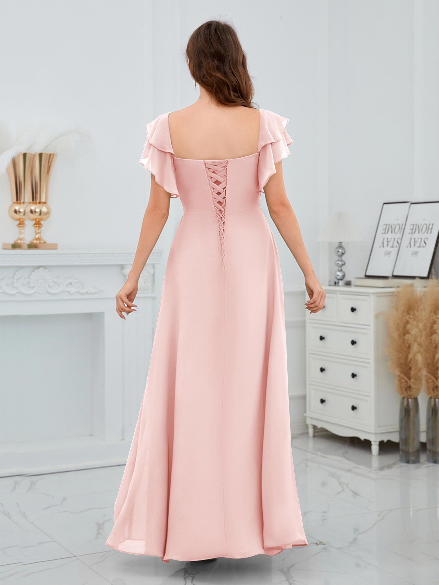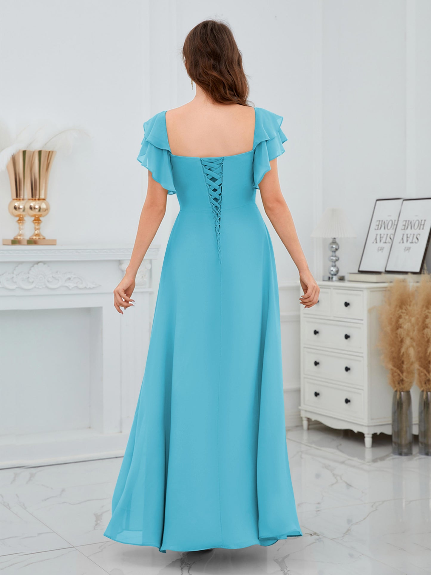 Stunning Short Sleeves Square Neck Slit Long Chiffon Bridesmaid Dresses UK