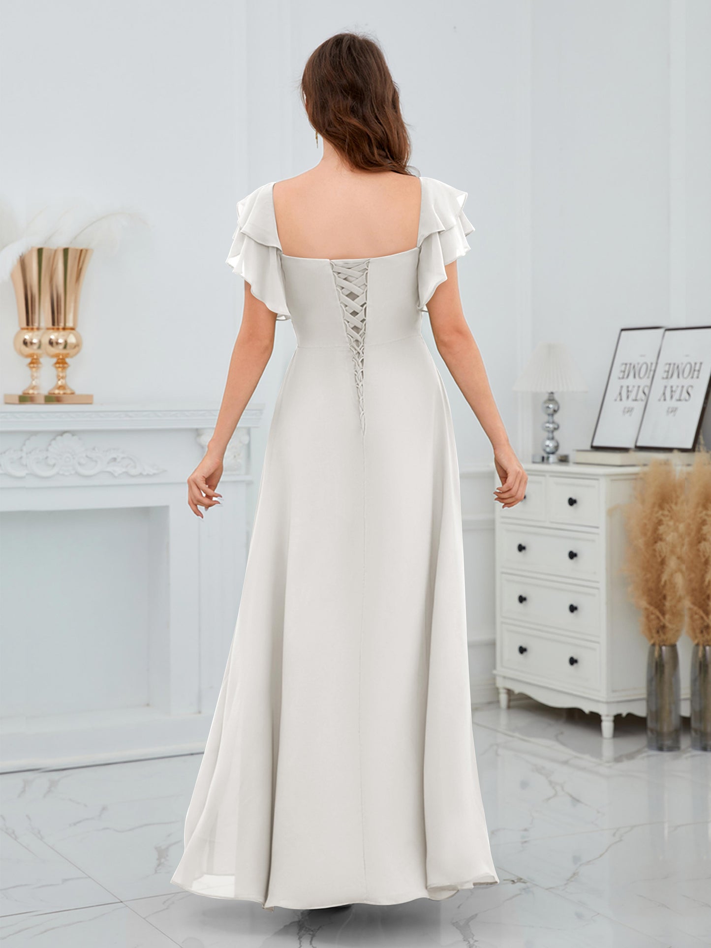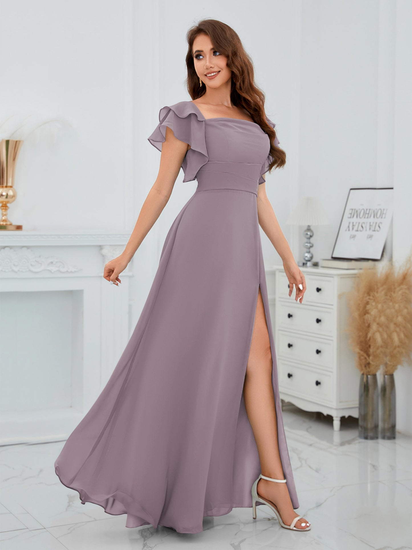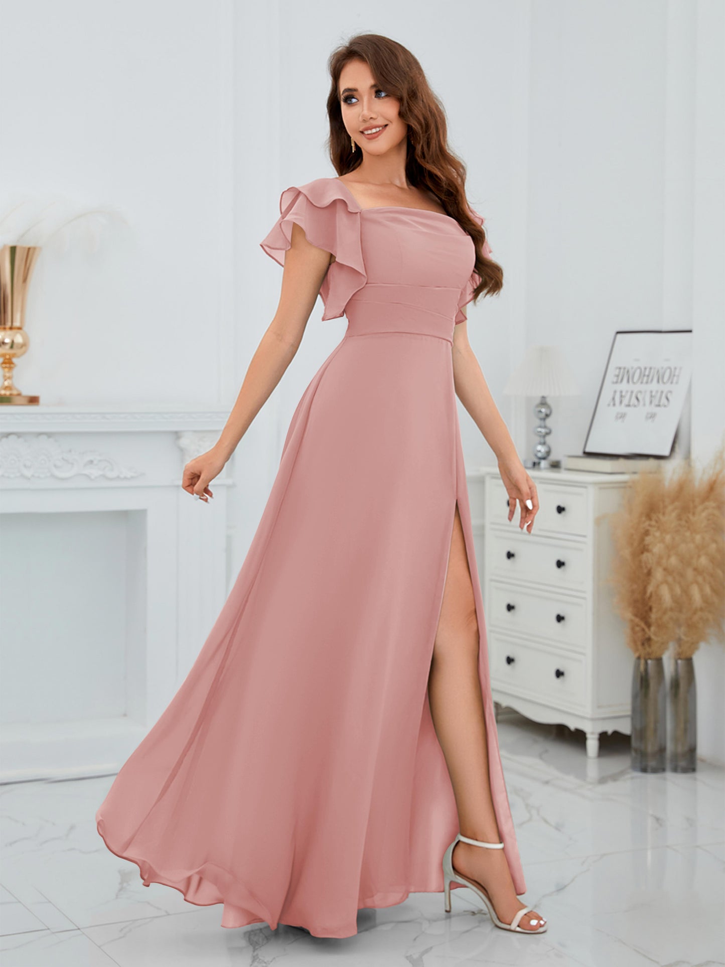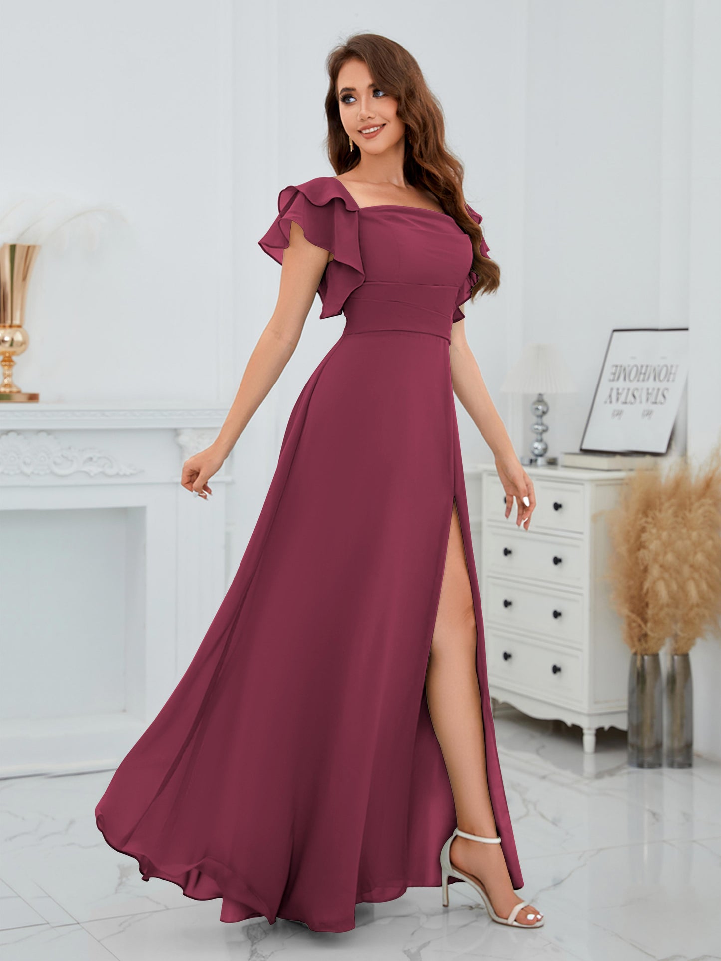 • Exude elegance in the Stunning Short Sleeves Square Neck Slit Long Chiffon Bridesmaid Dress from Mollyevers. With a chic square neckline, short sleeves, and a flattering side slit, this floor-length chiffon dress offers a perfect blend of sophistication and comfort, making it an ideal choice for bridesmaids at any wedding.