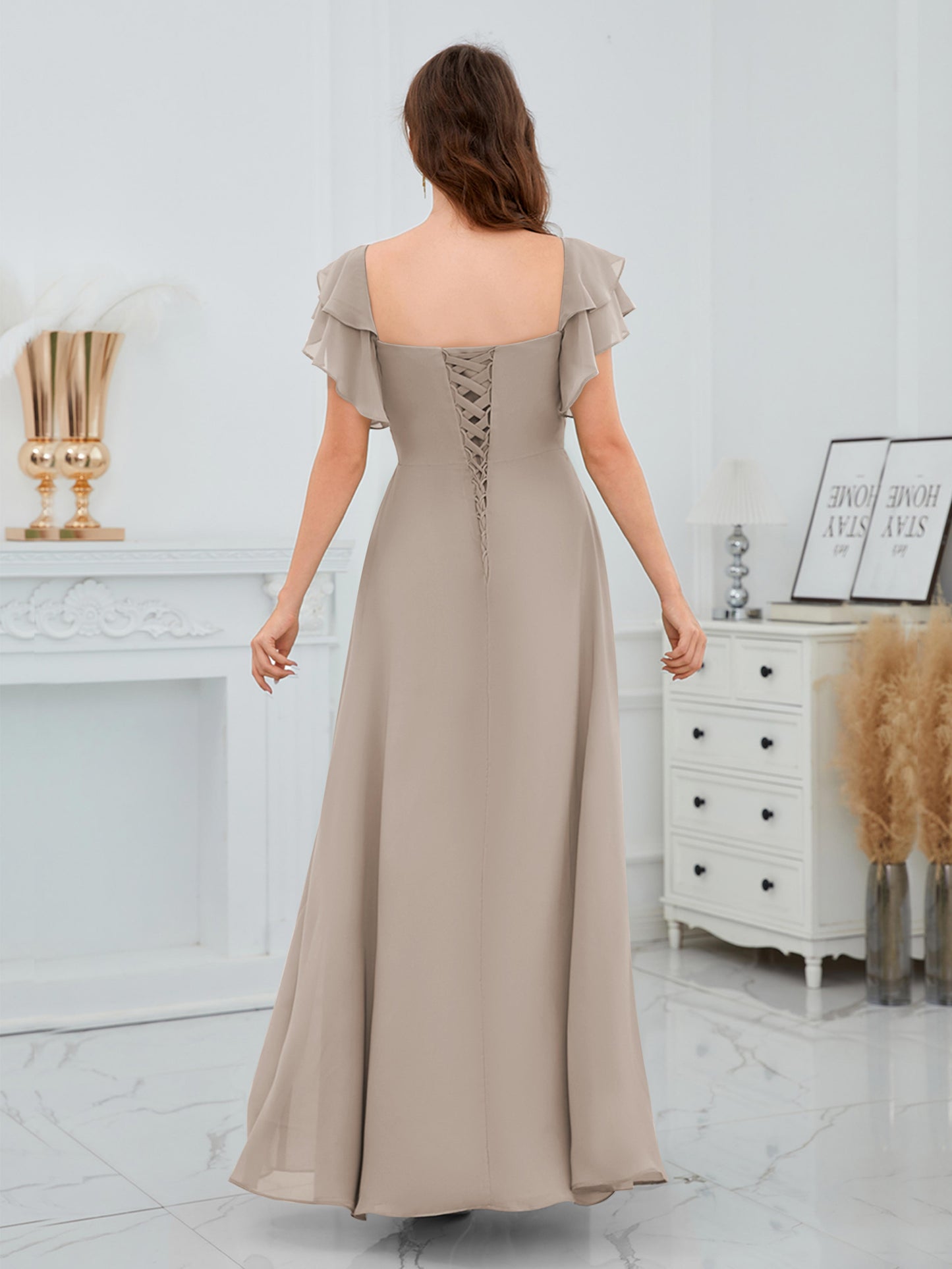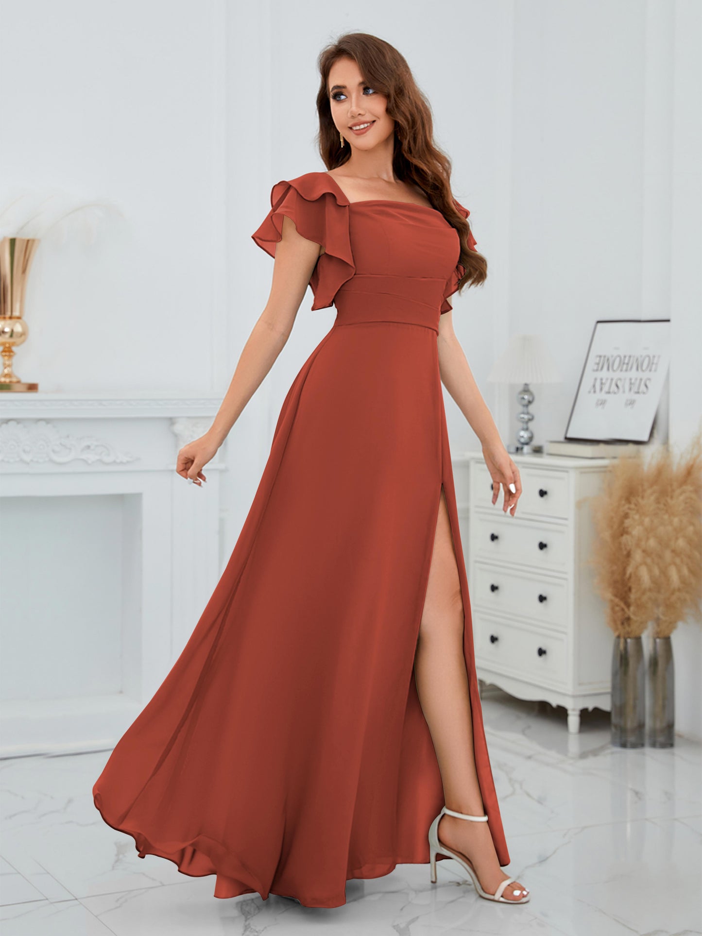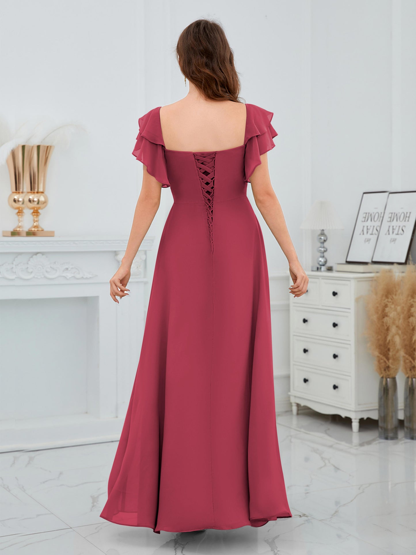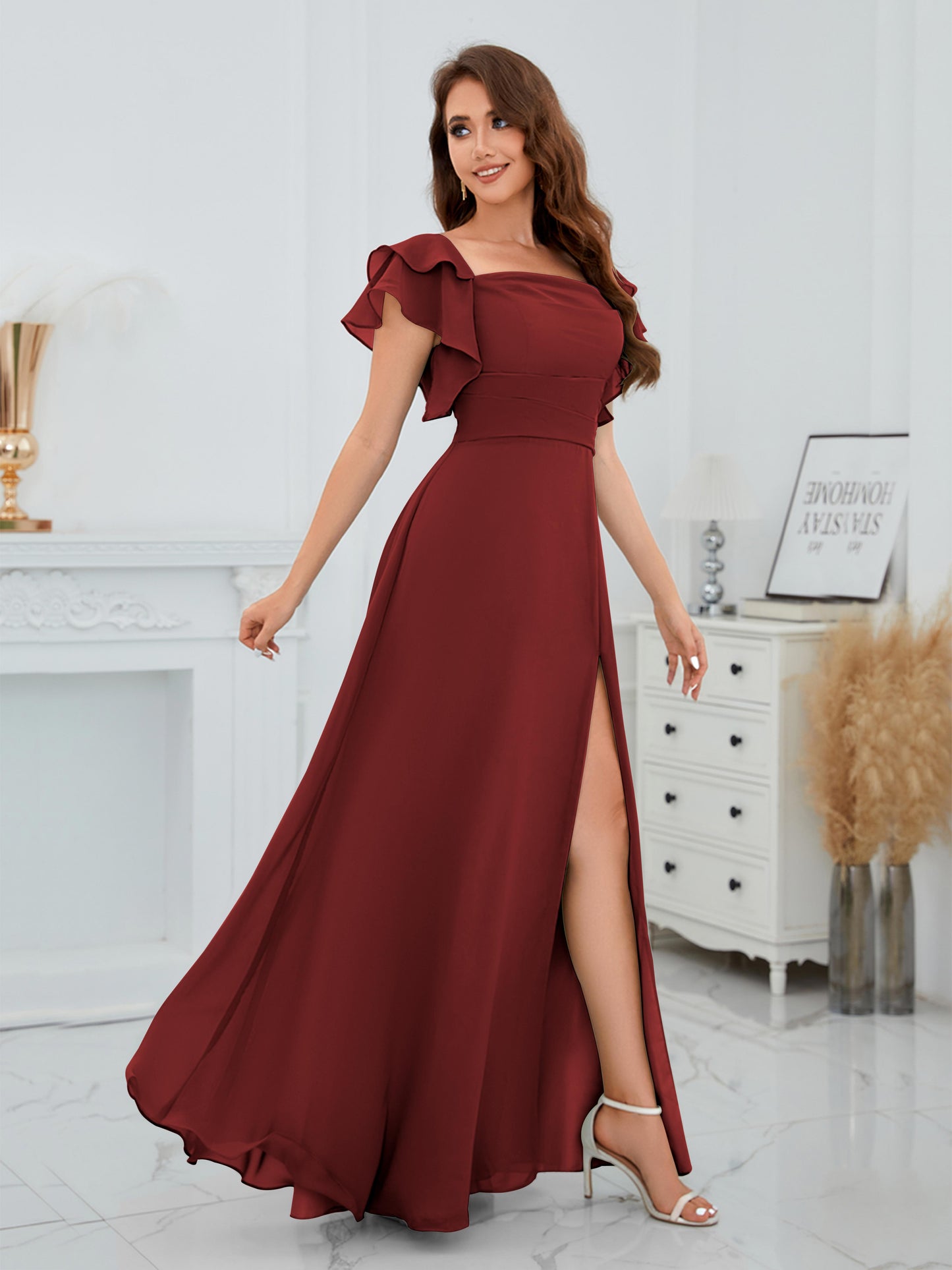 • Exude elegance in the Stunning Short Sleeves Square Neck Slit Long Chiffon Bridesmaid Dress from Mollyevers. With a chic square neckline, short sleeves, and a flattering side slit, this floor-length chiffon dress offers a perfect blend of sophistication and comfort, making it an ideal choice for bridesmaids at any wedding.