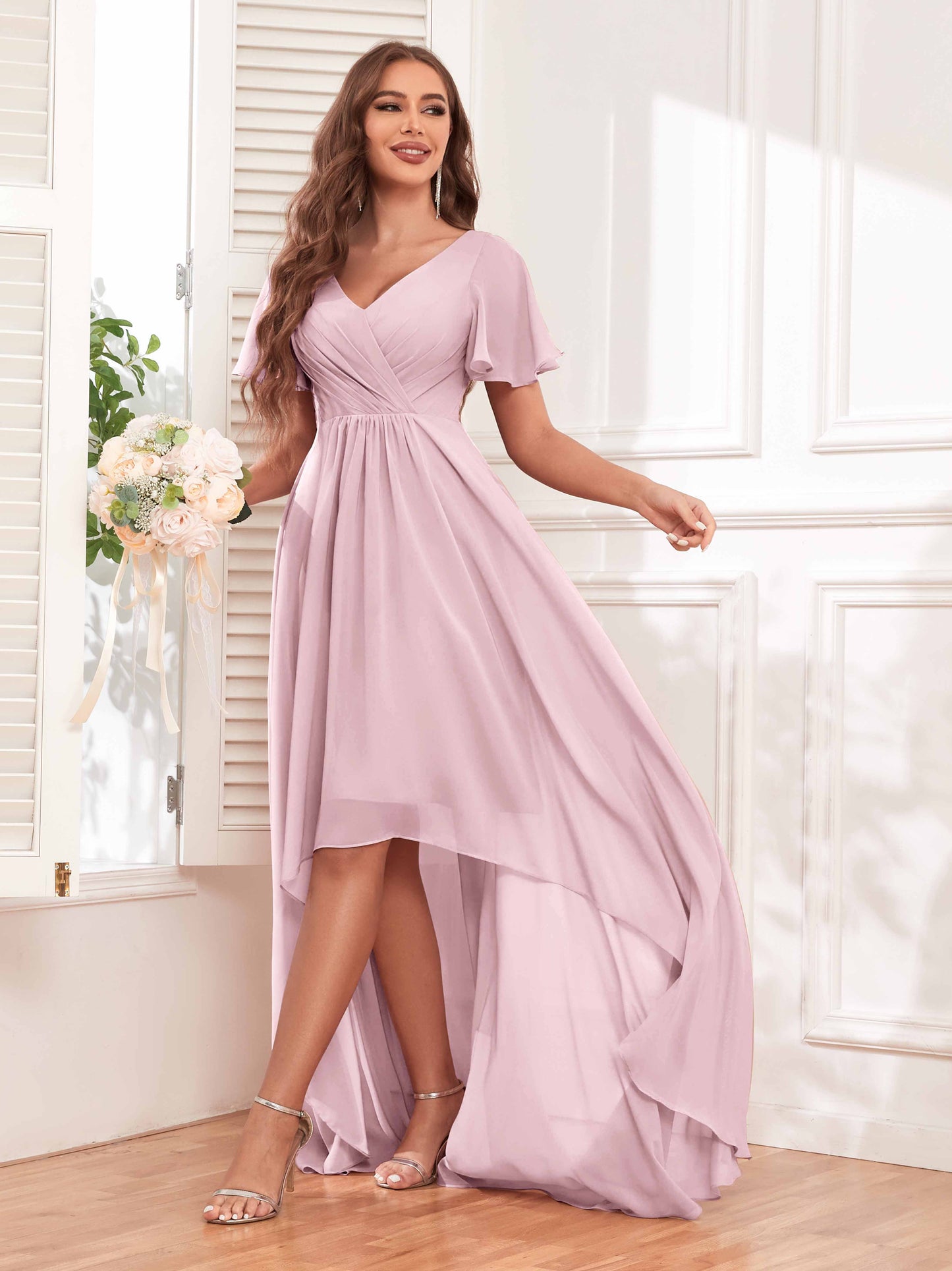 Stunning V Neck High Low Chiffon Bridesmaid Dresses UK