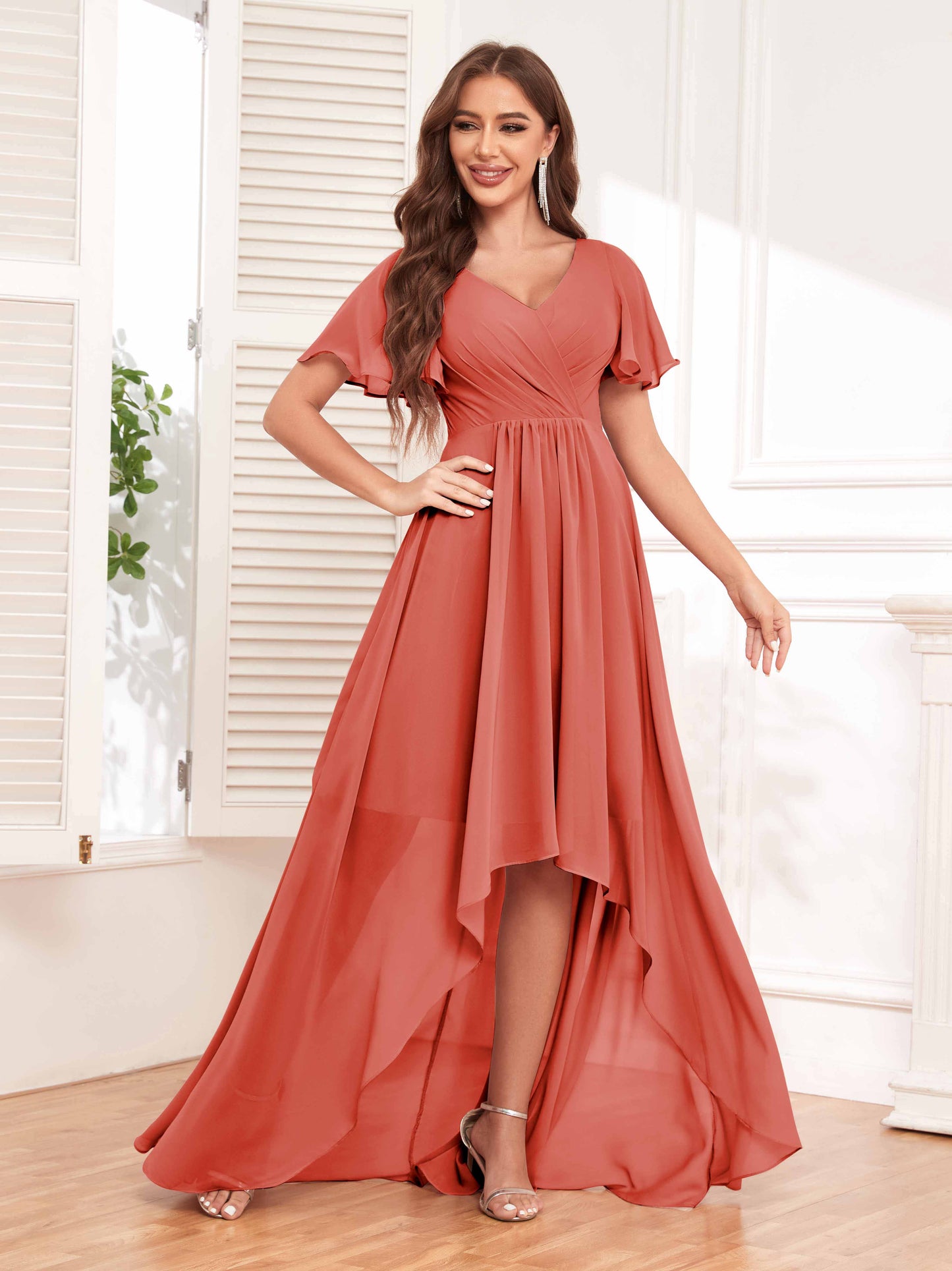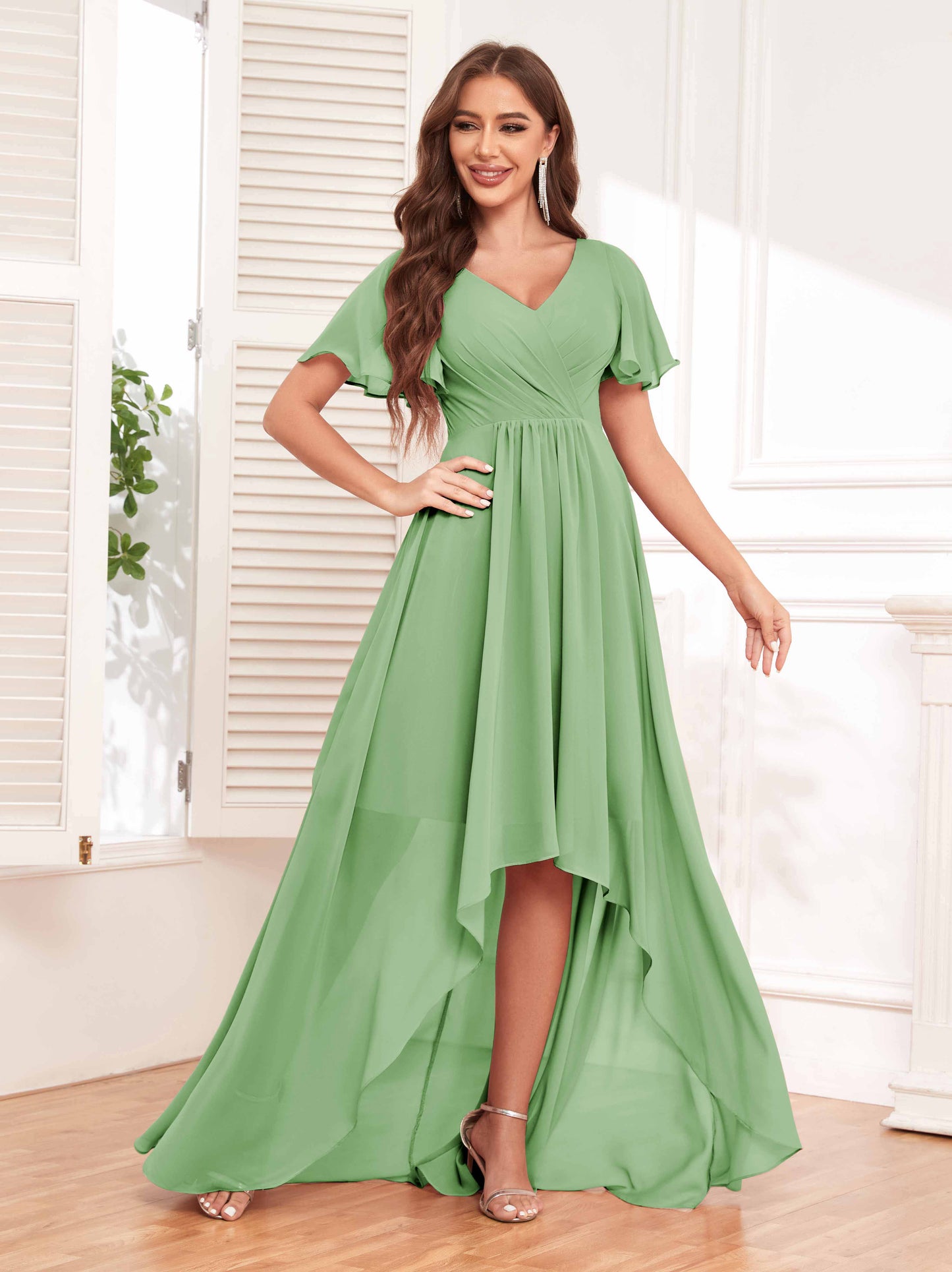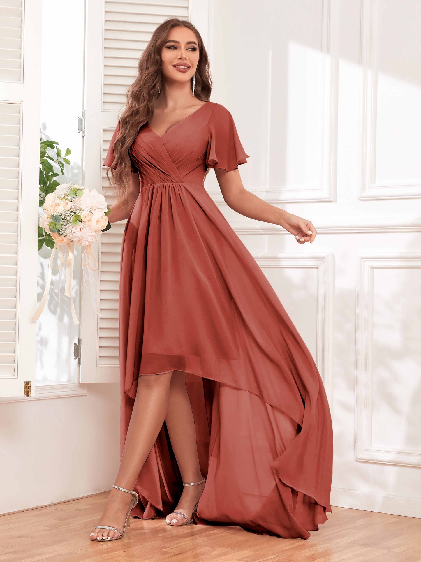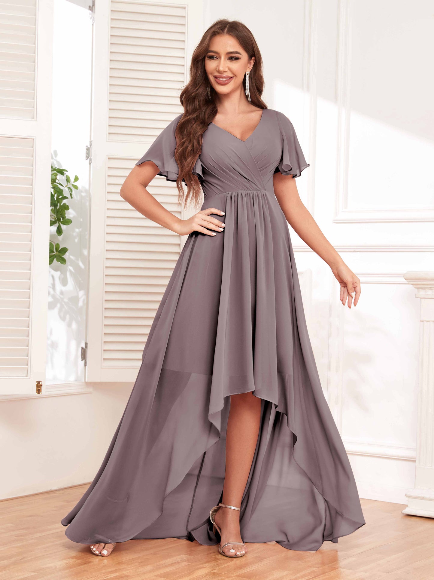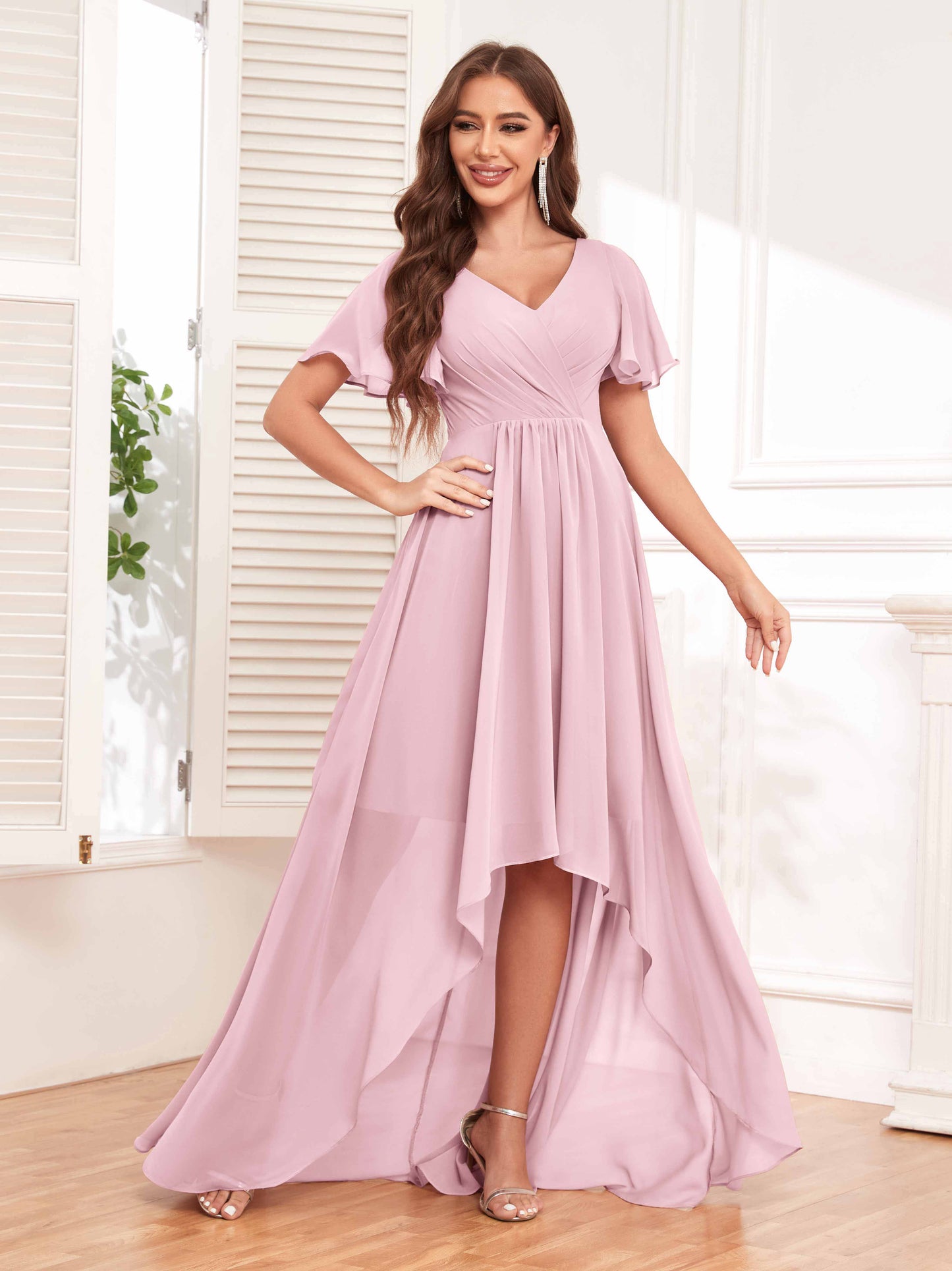 • Make a stunning statement with Mollyevers' V-neck high-low chiffon bridesmaid dress. The V-neckline adds a touch of sophistication, while the high-low hemline creates a modern and dynamic look. This dress is perfect for those who want to look effortlessly chic and stand out from the crowd.