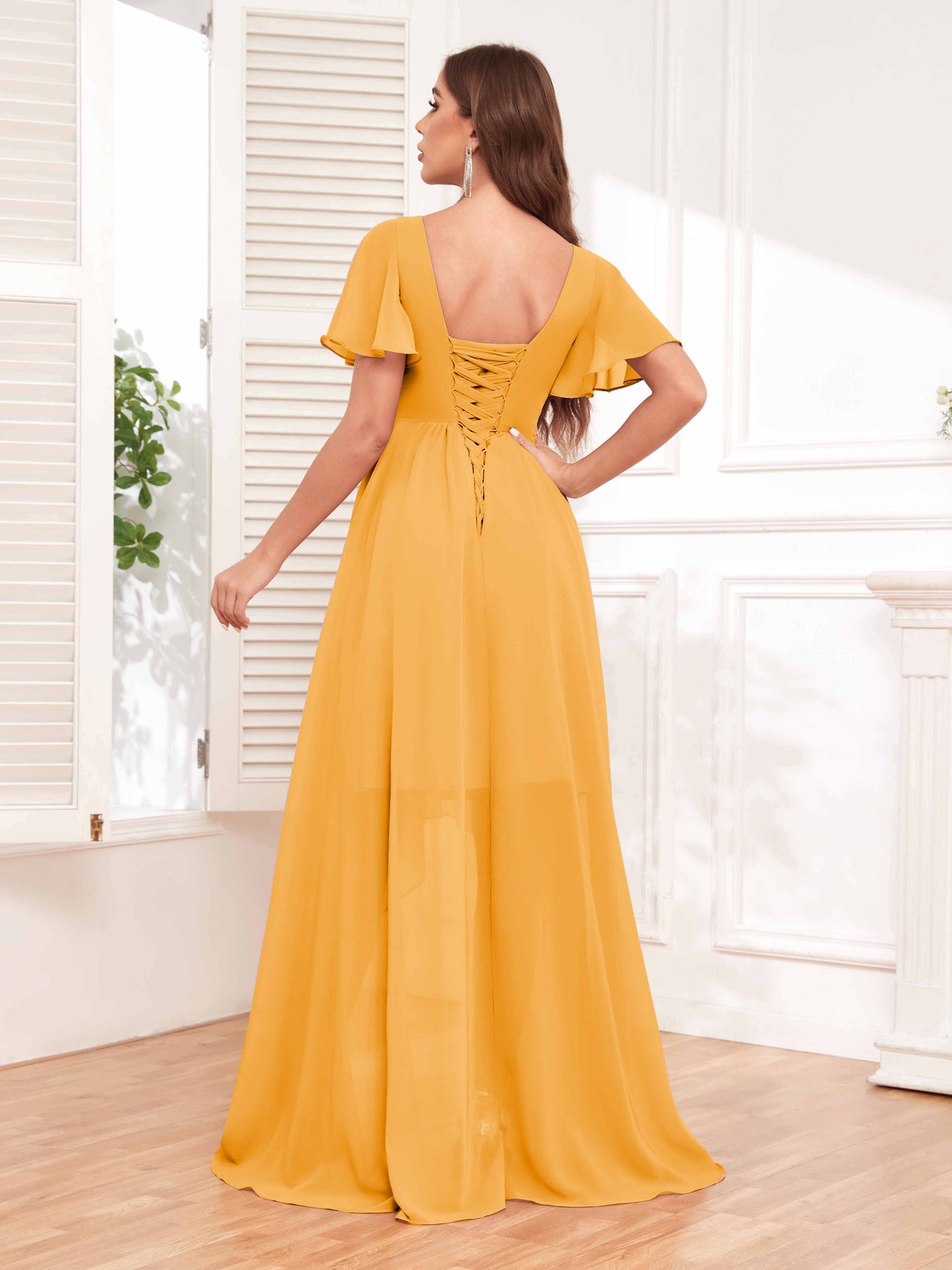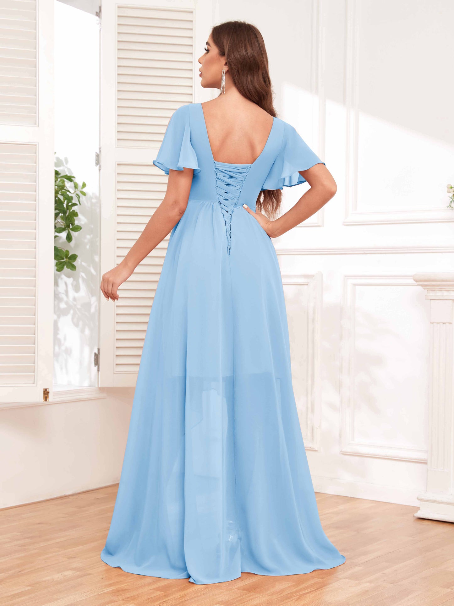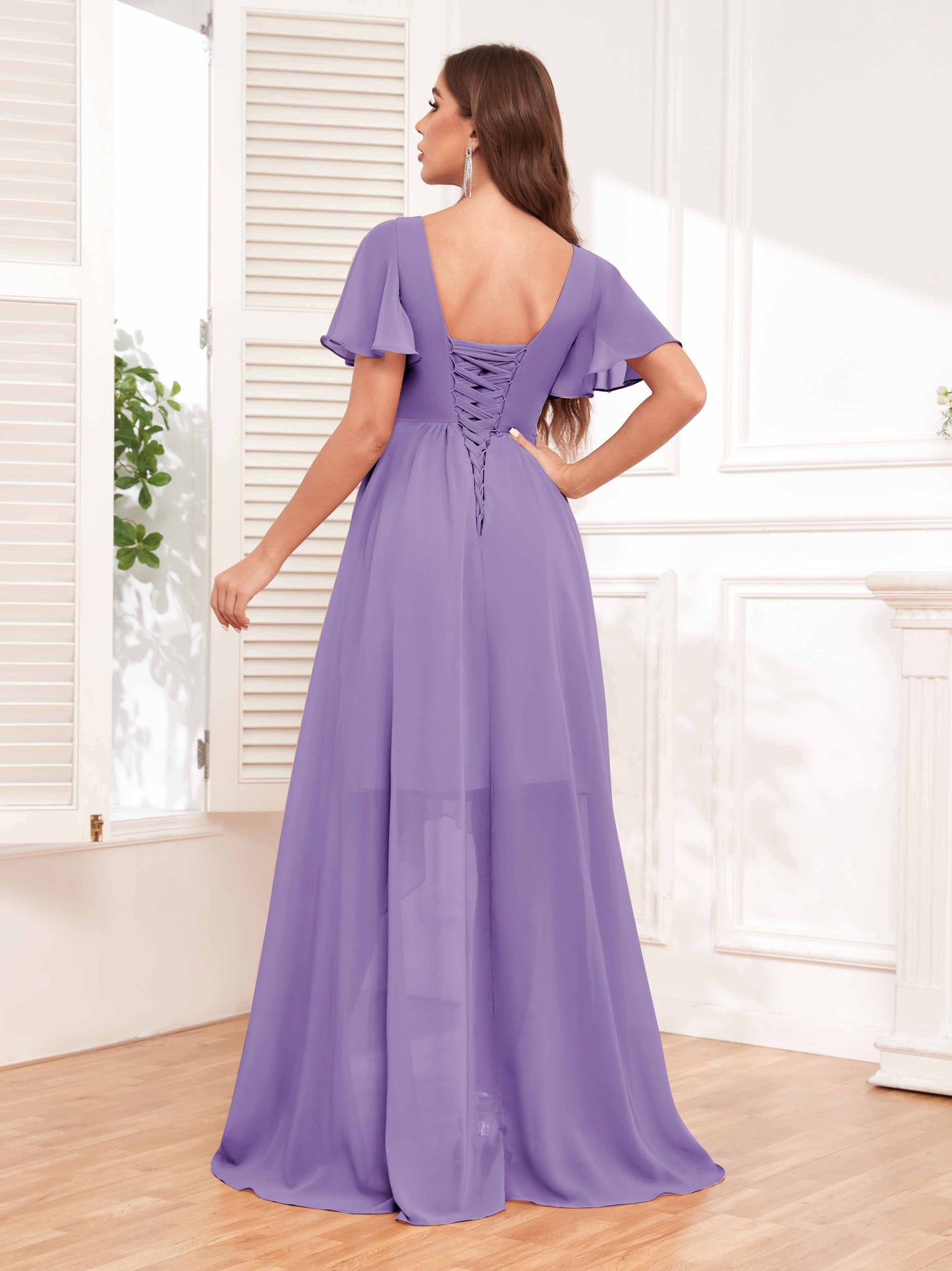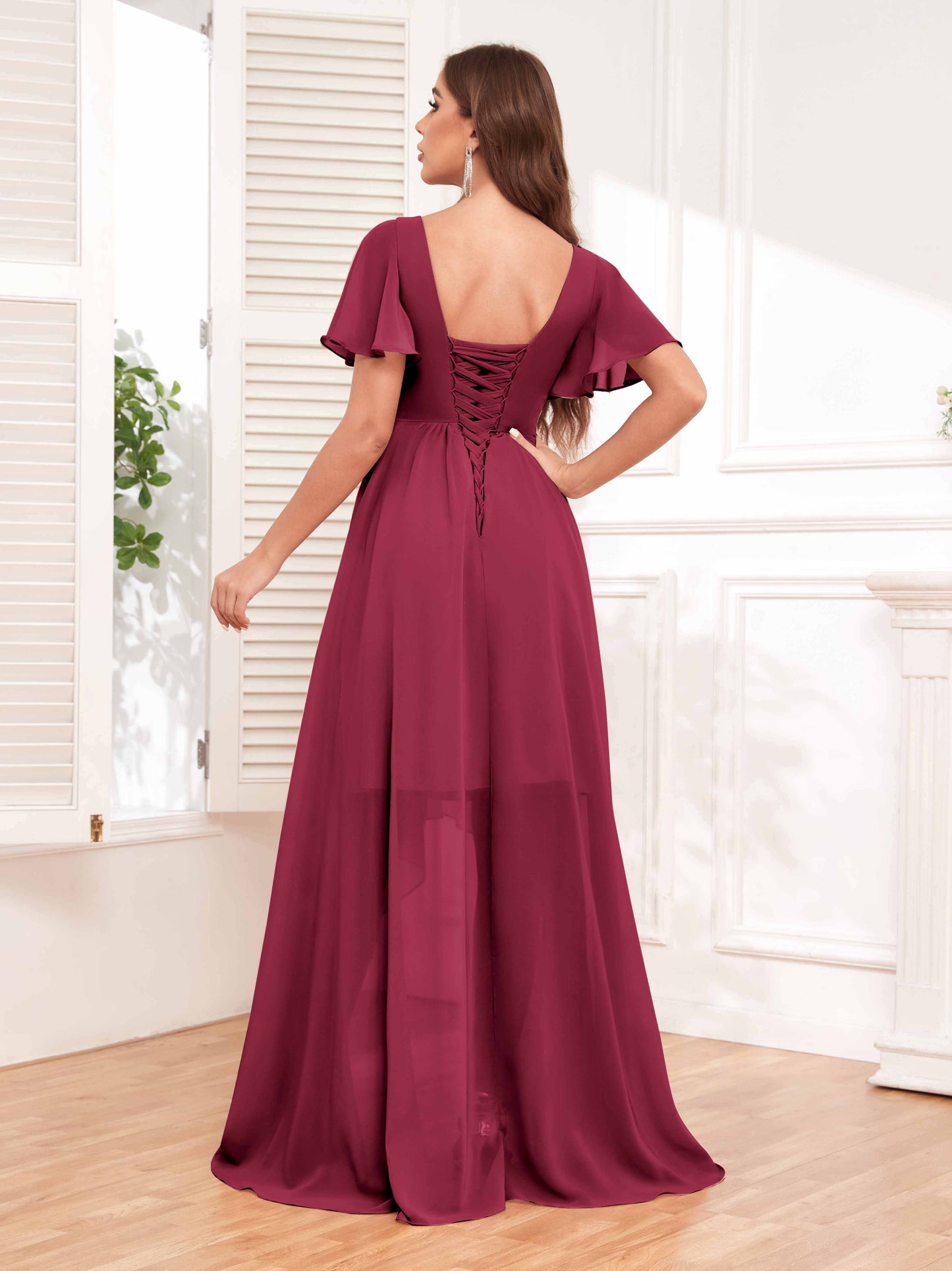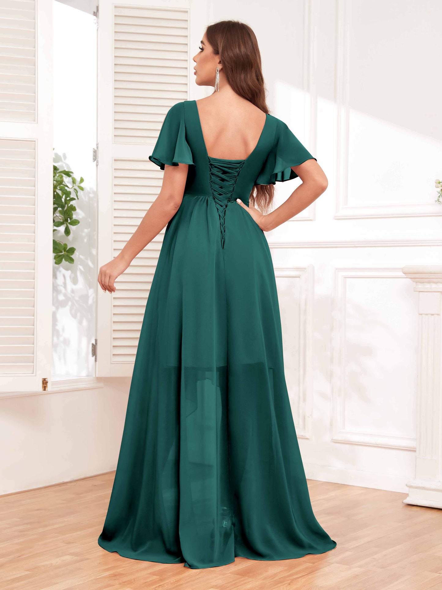 • Make a stunning statement with Mollyevers' V-neck high-low chiffon bridesmaid dress. The V-neckline adds a touch of sophistication, while the high-low hemline creates a modern and dynamic look. This dress is perfect for those who want to look effortlessly chic and stand out from the crowd.