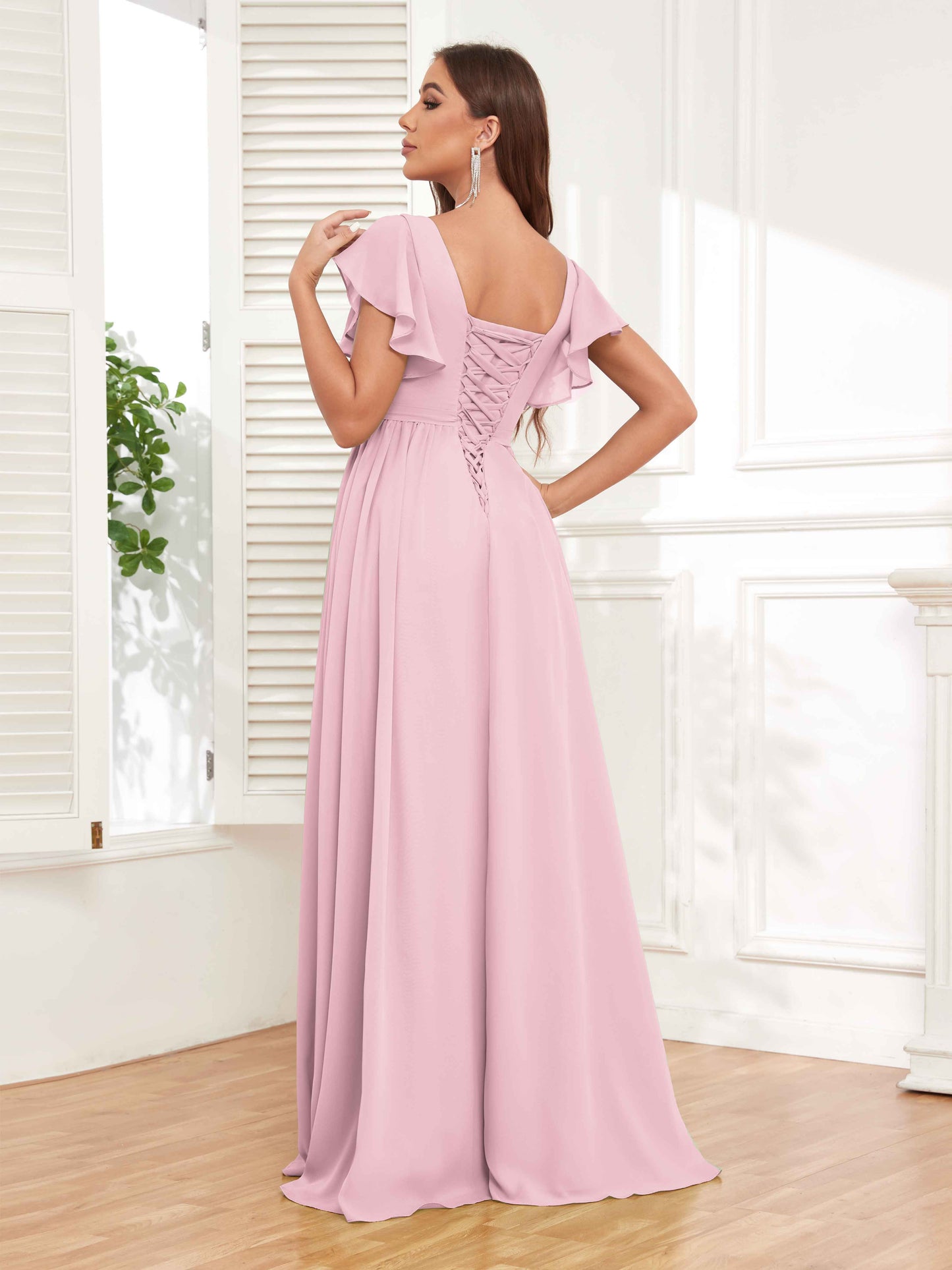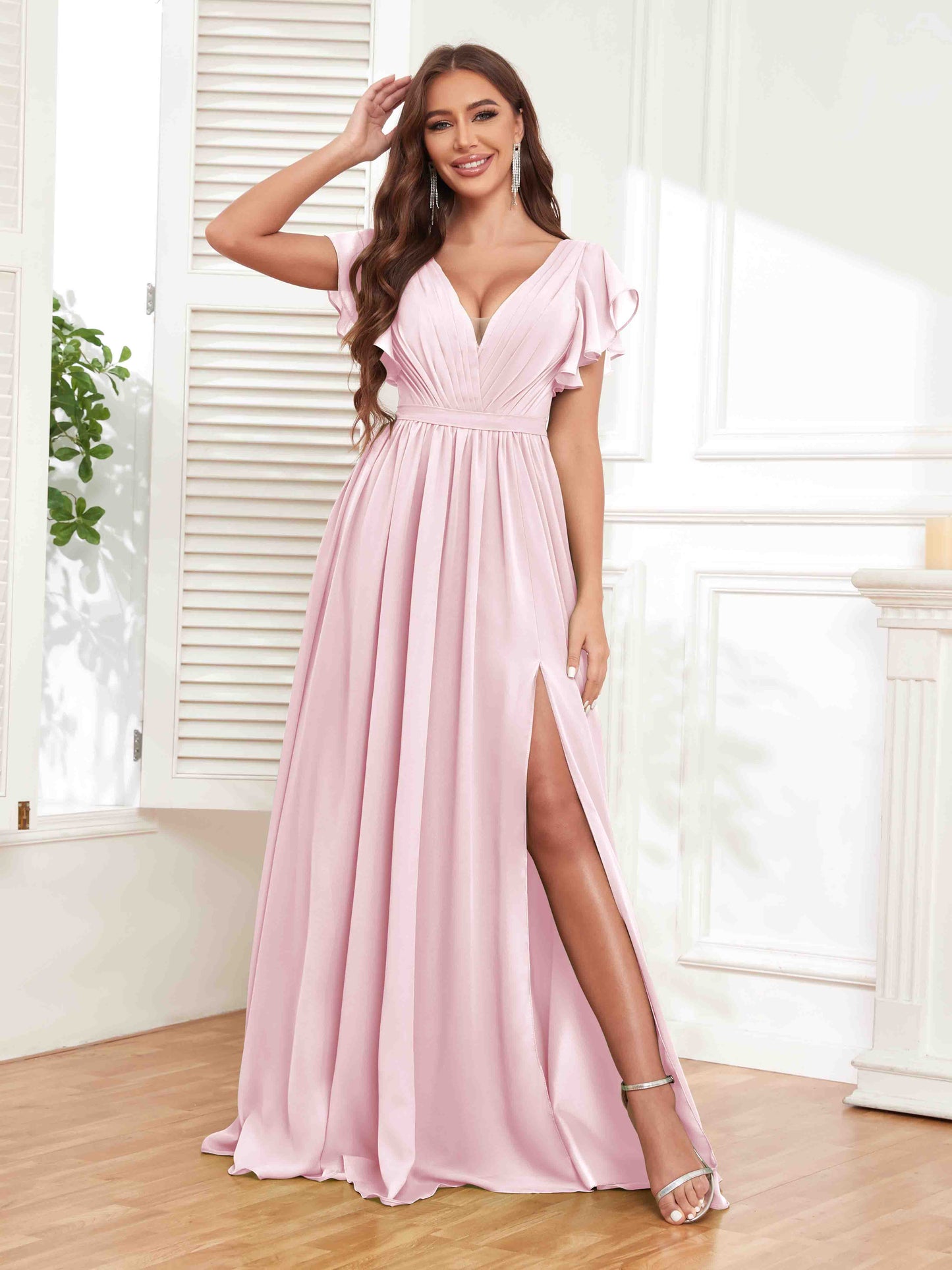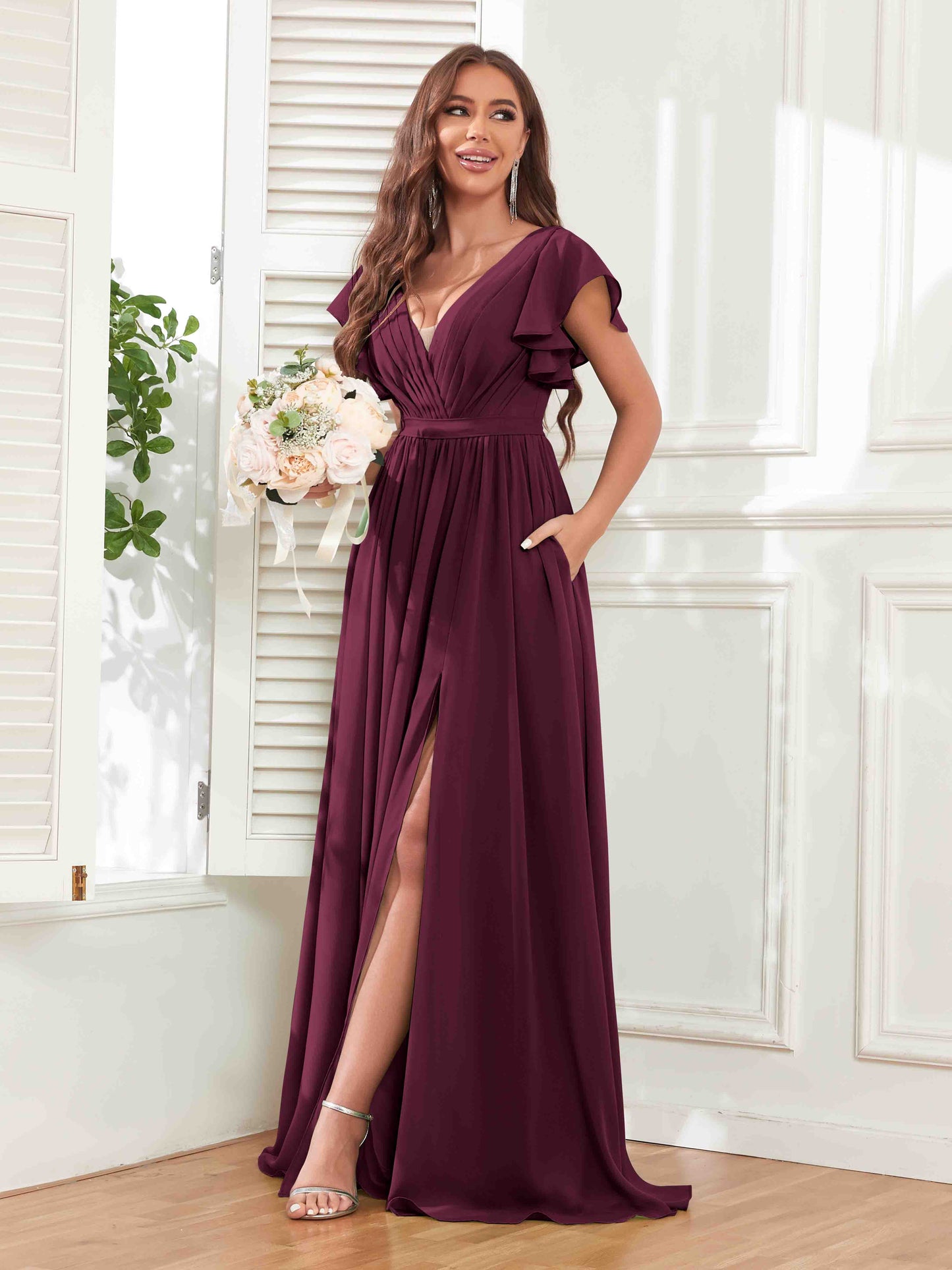 Stylish V Neck Short Sleeves Chiffon Bridesmaid Dresses UK