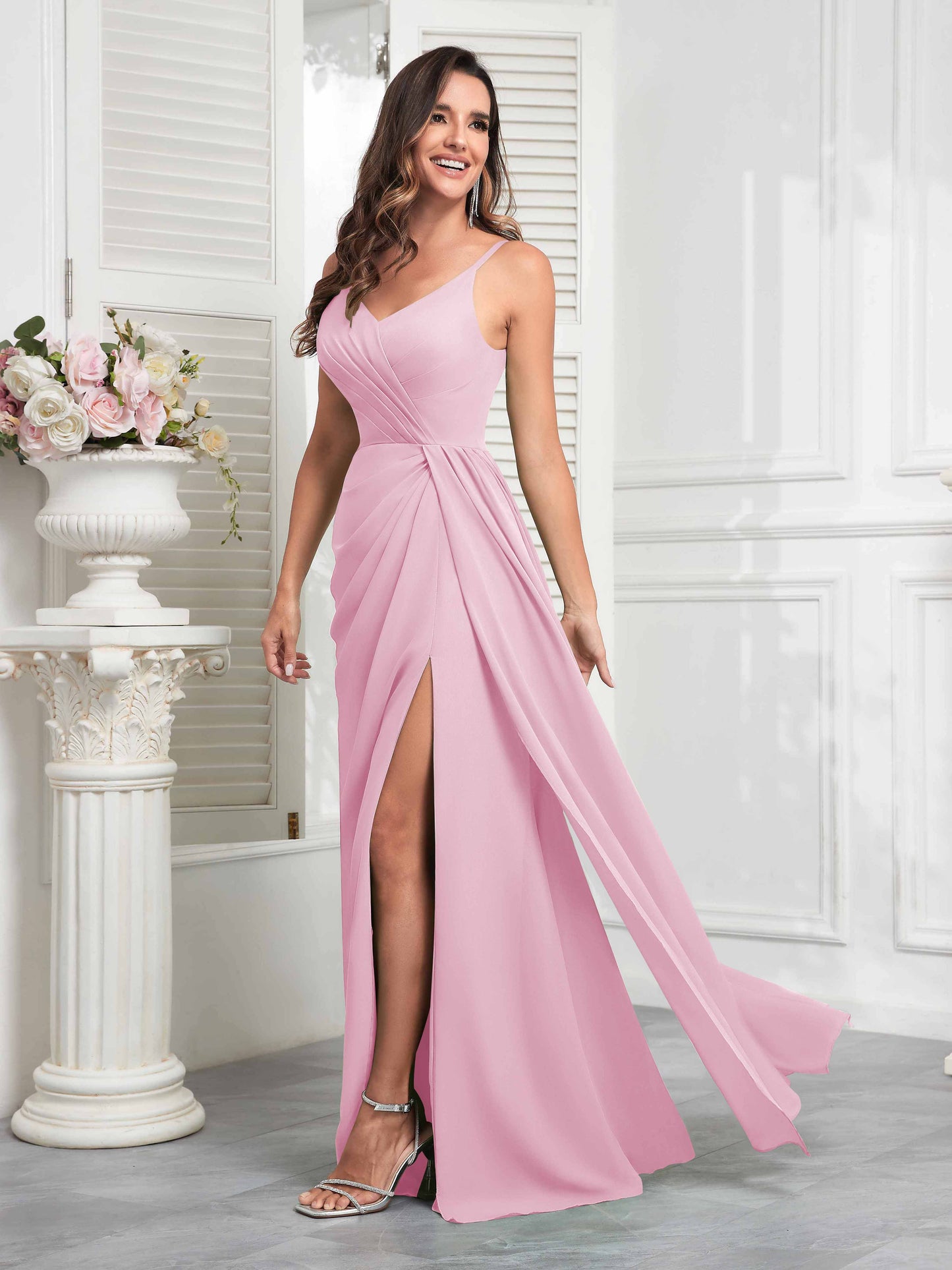Stylish V Neck Slit Sleeveless Pleated Maxi Chiffon Bridesmaid Dresses UK