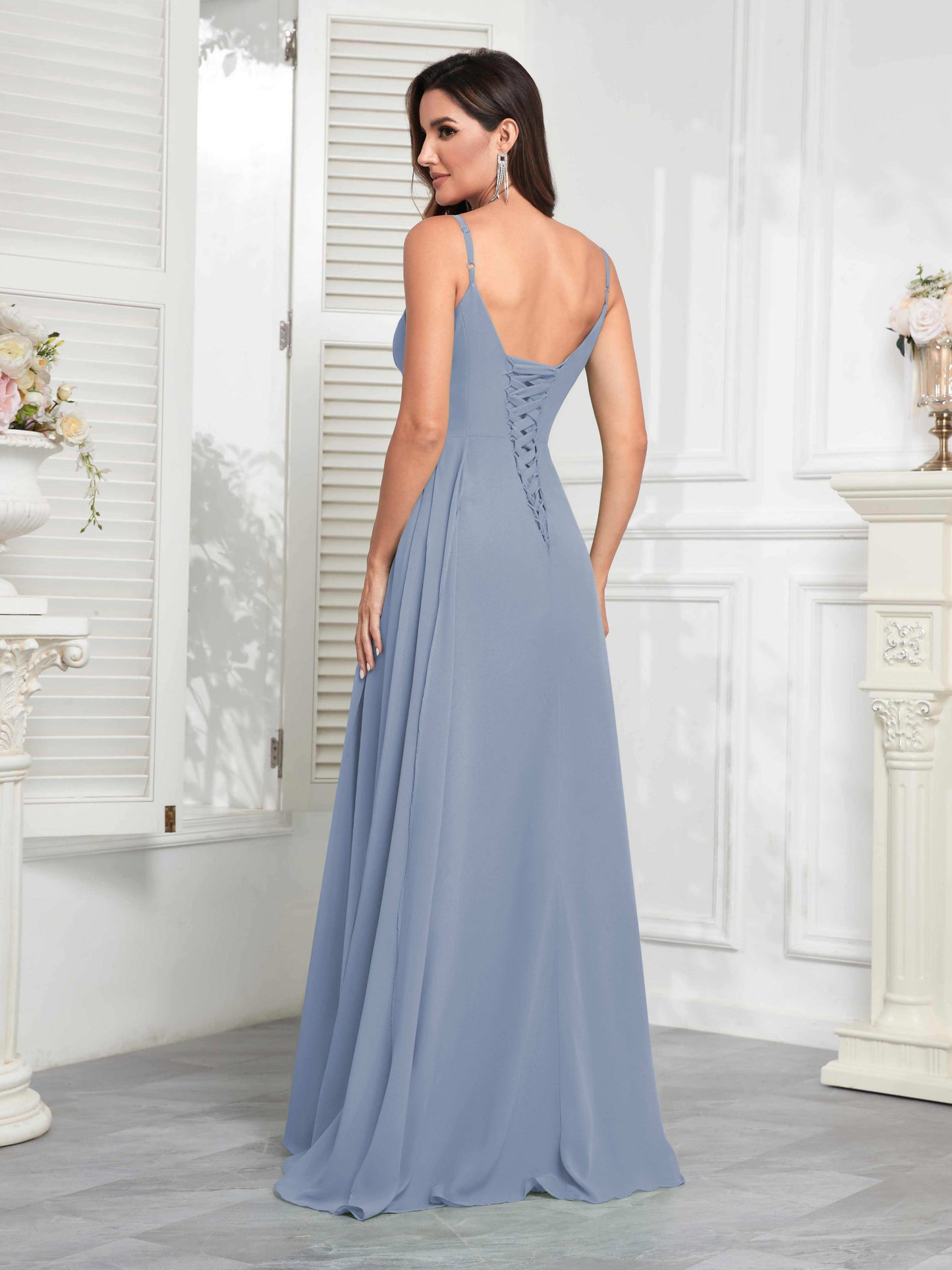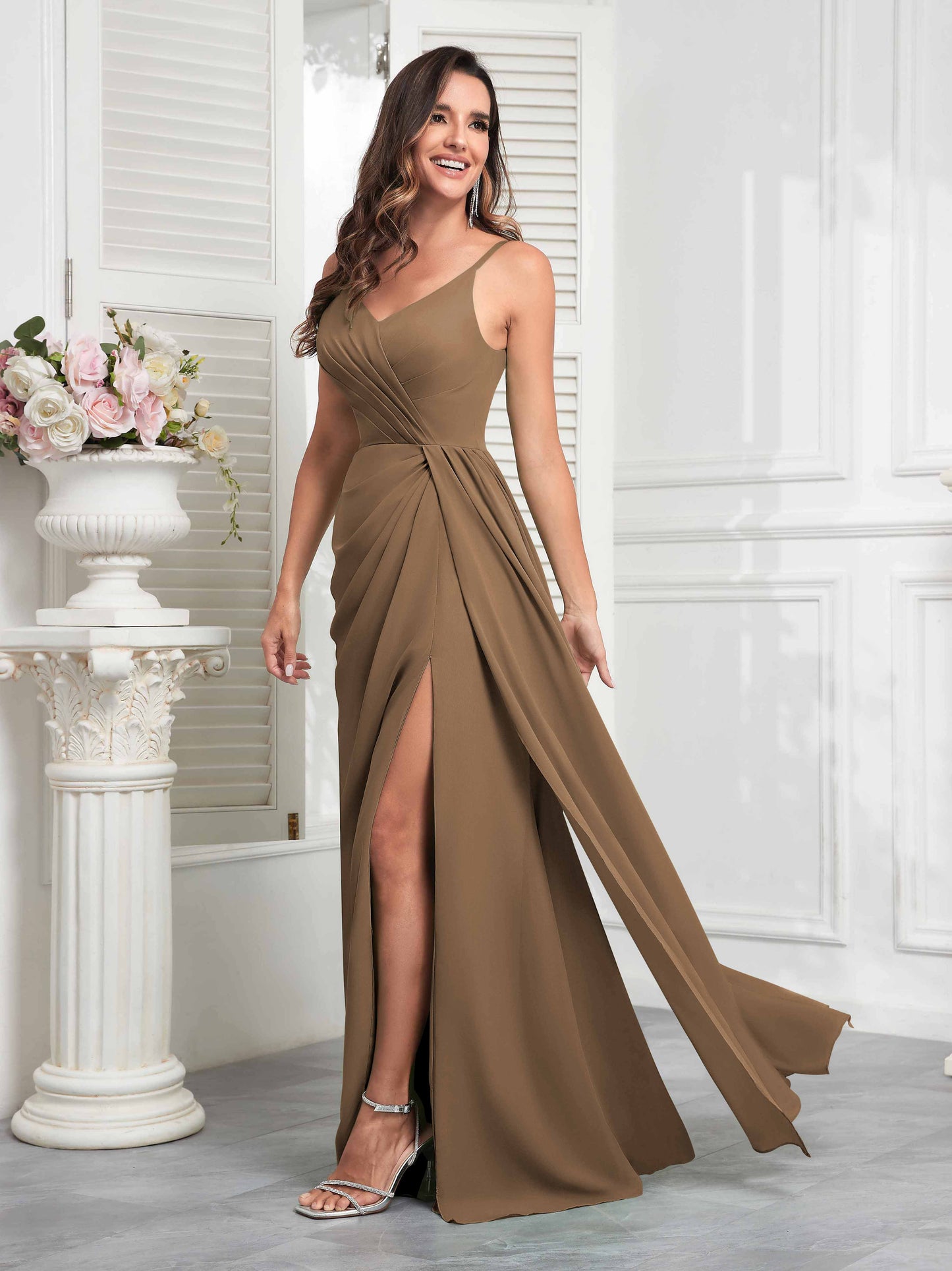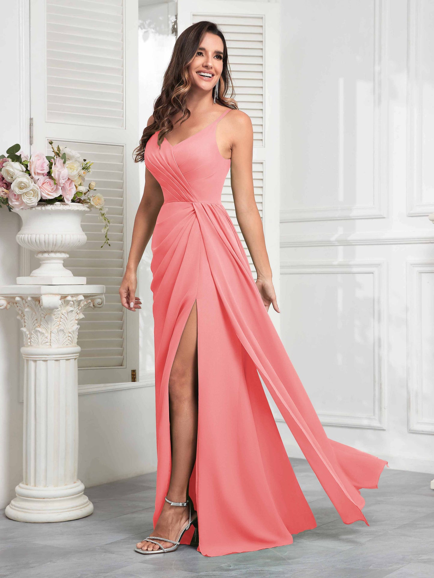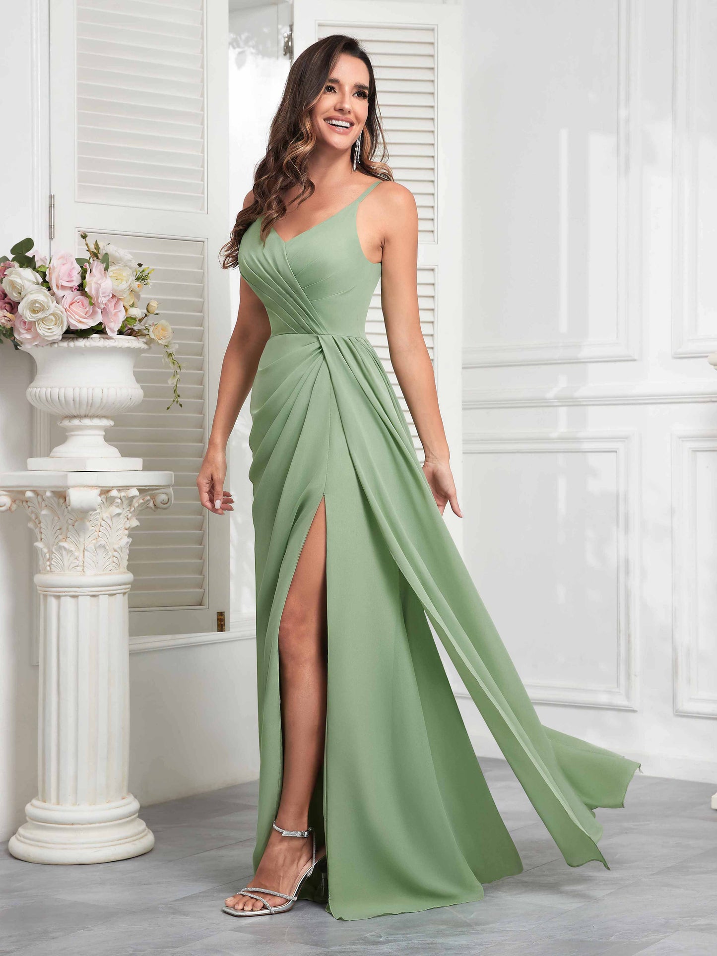 • Make a statement with Mollyevers' Stylish V-Neck Slit Sleeveless Pleated Maxi Chiffon Bridesmaid Dress. Featuring a flattering V-neck, elegant pleats, and a daring slit, this dress combines modern style with sophistication, ensuring your bridesmaids look chic and feel confident on your big day.