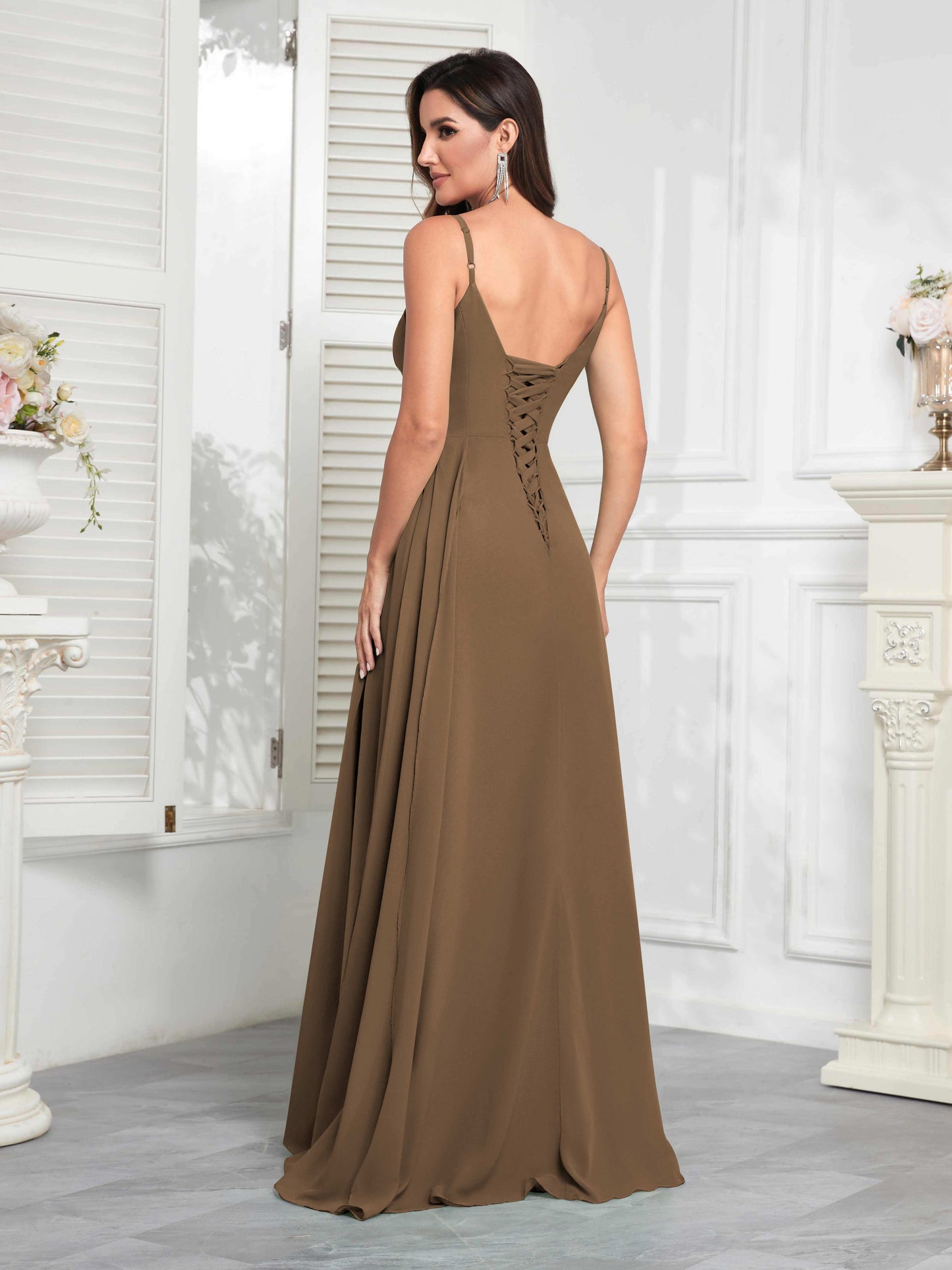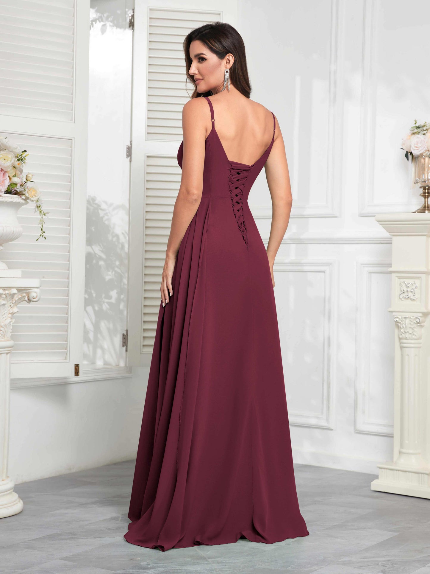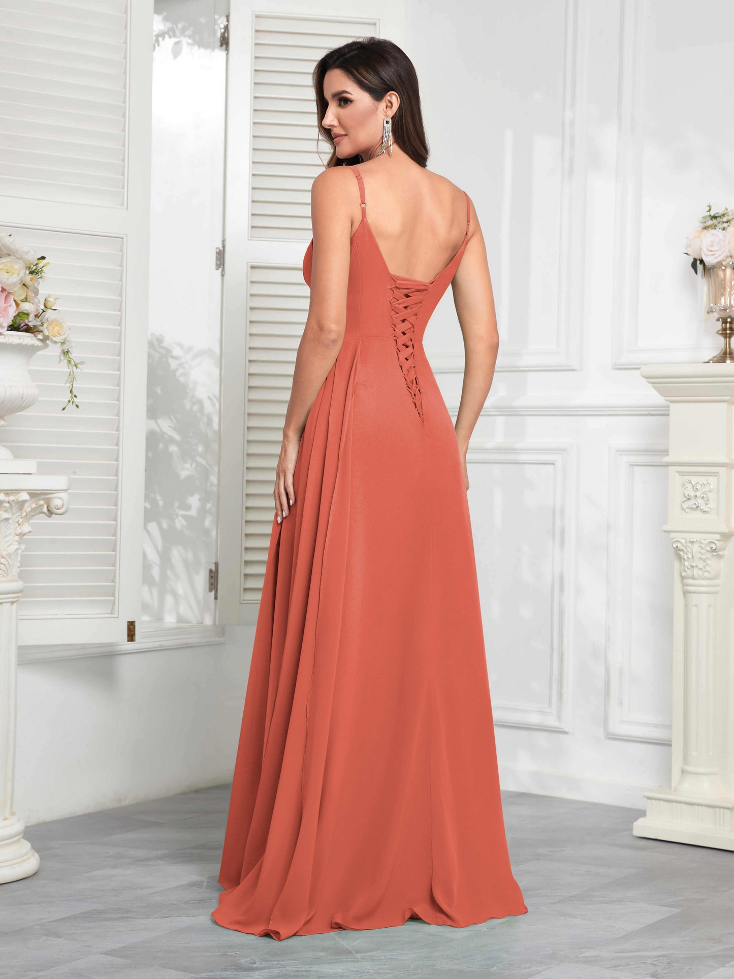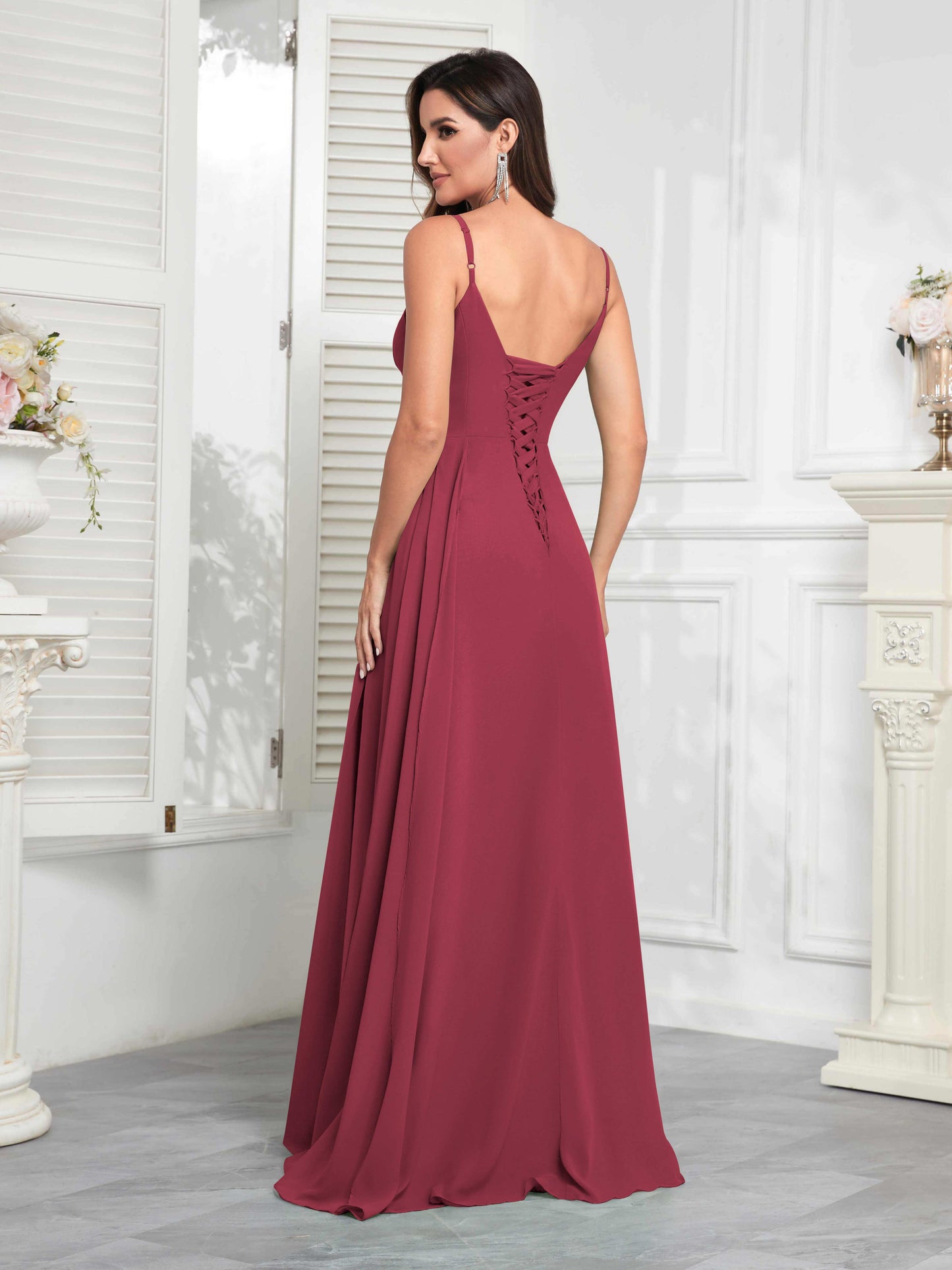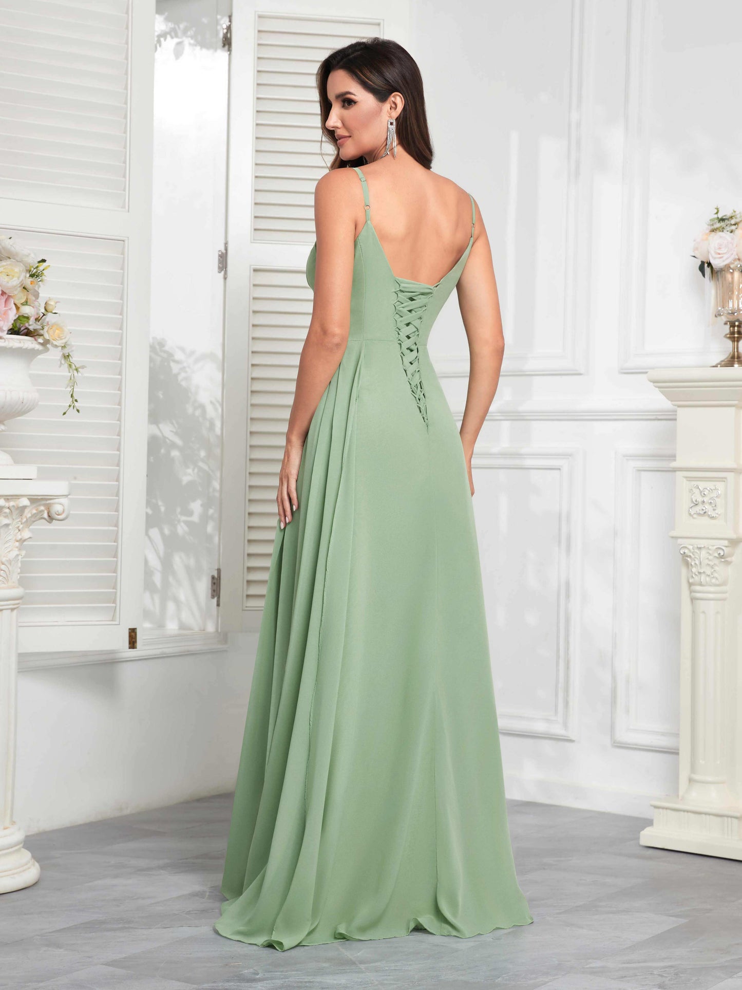 • Make a statement with Mollyevers' Stylish V-Neck Slit Sleeveless Pleated Maxi Chiffon Bridesmaid Dress. Featuring a flattering V-neck, elegant pleats, and a daring slit, this dress combines modern style with sophistication, ensuring your bridesmaids look chic and feel confident on your big day.