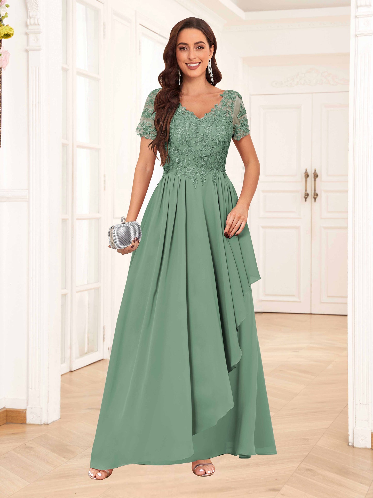 • Embrace timelessness with this back zip lace applique chiffon mother of the bride dress. Designed for UK plus-size women, this dress offers a classic and elegant look. Perfect for a traditional wedding, this dress will make you look effortlessly timeless.