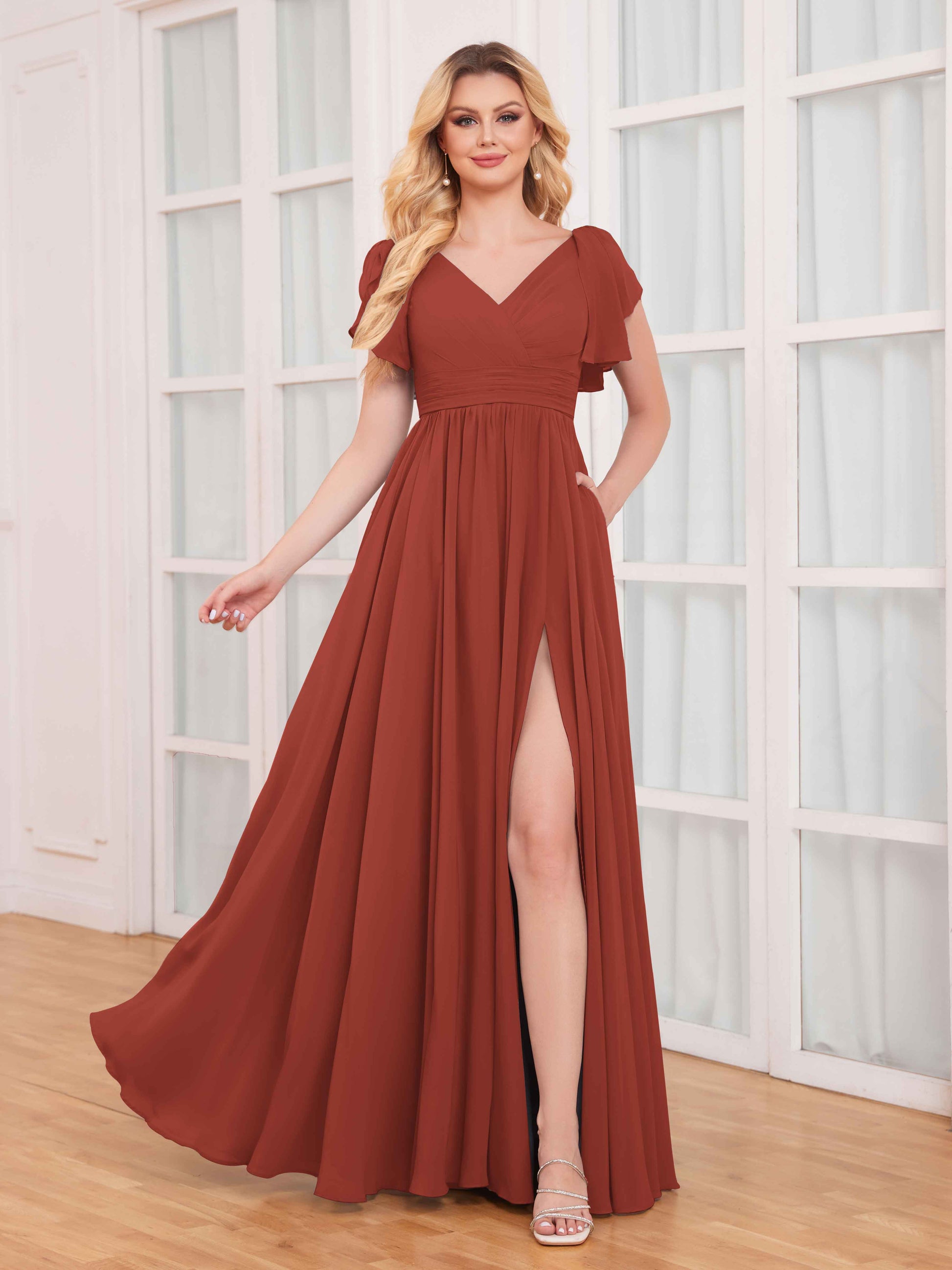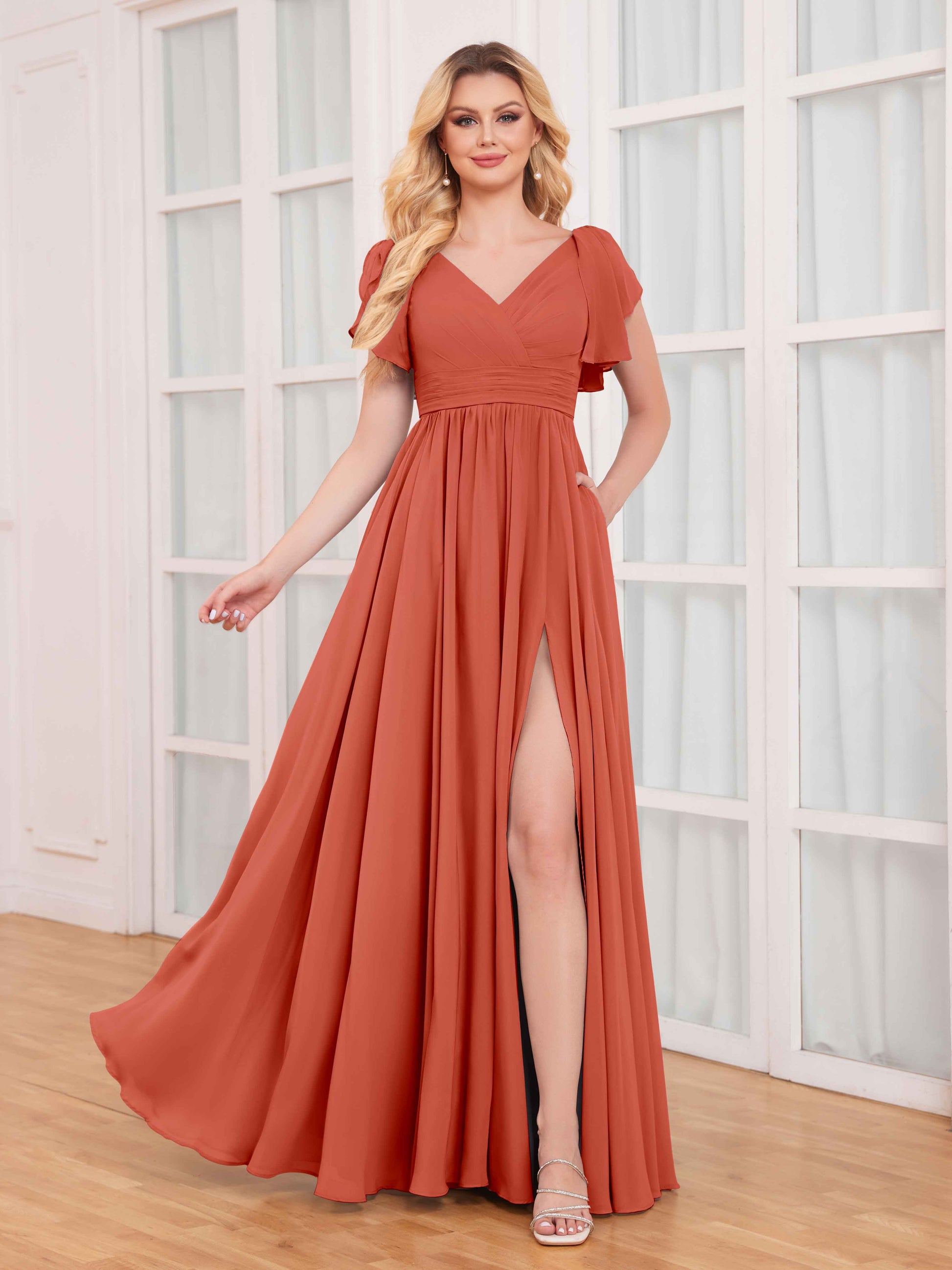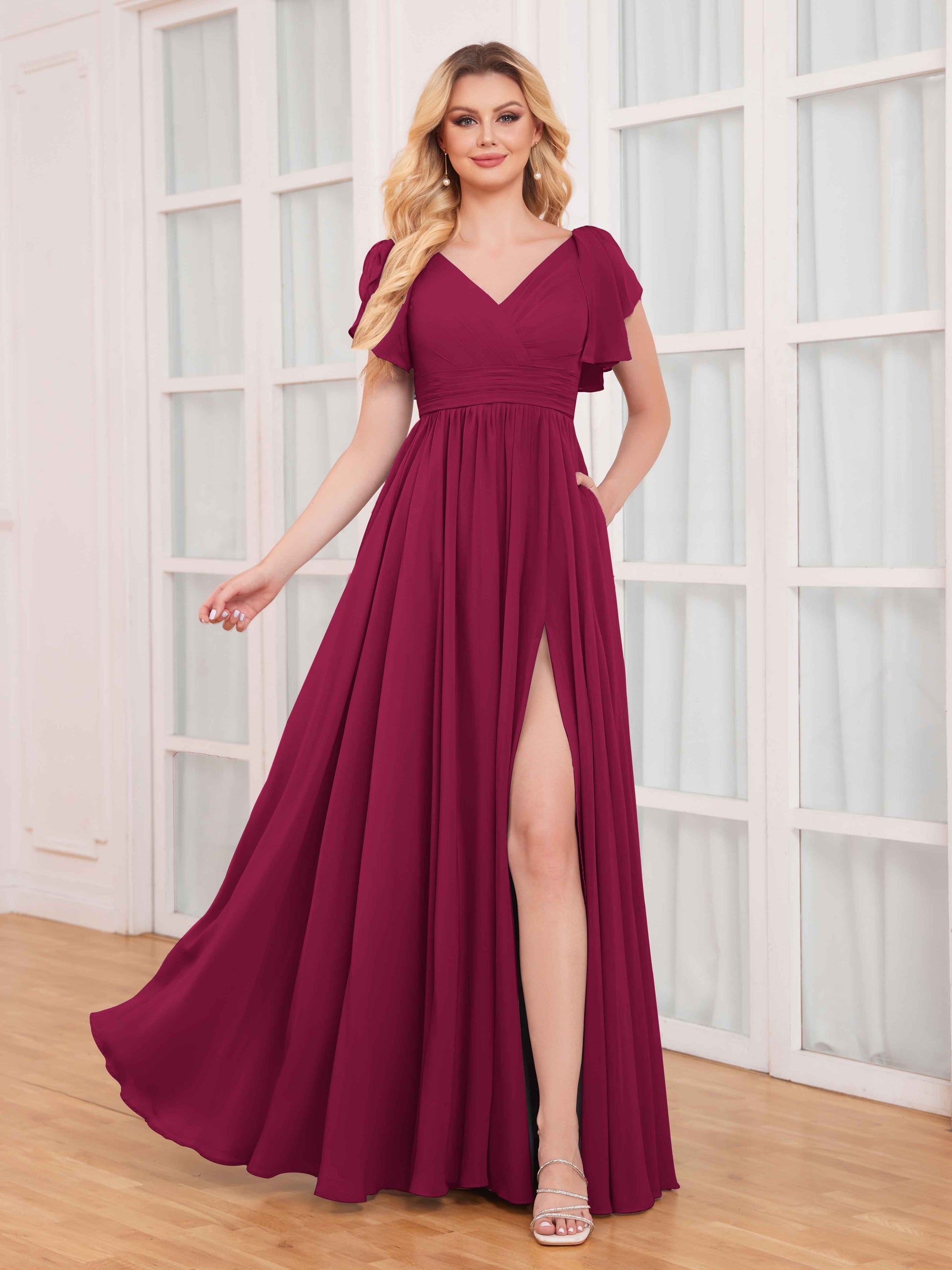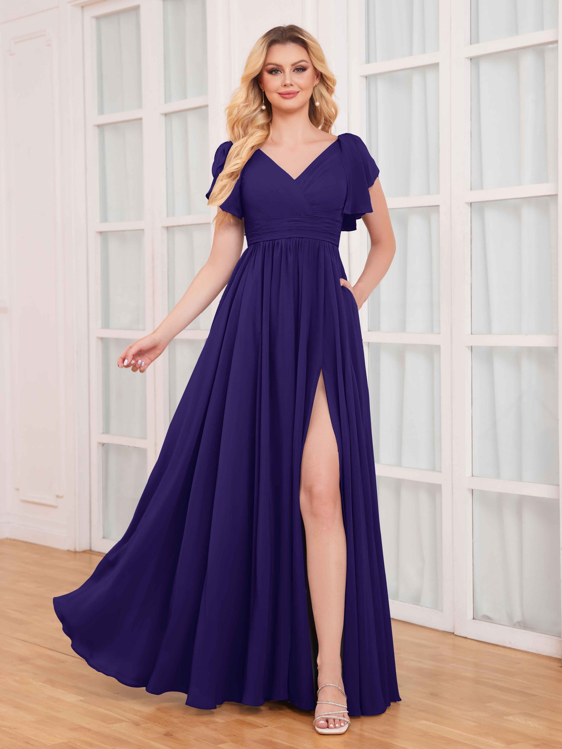 • These dresses feature timeless ruffles and short sleeves, adding a touch of femininity and charm. The striking slit adds an element of allure, while the chiffon fabric drapes beautifully, ensuring comfort and elegance.