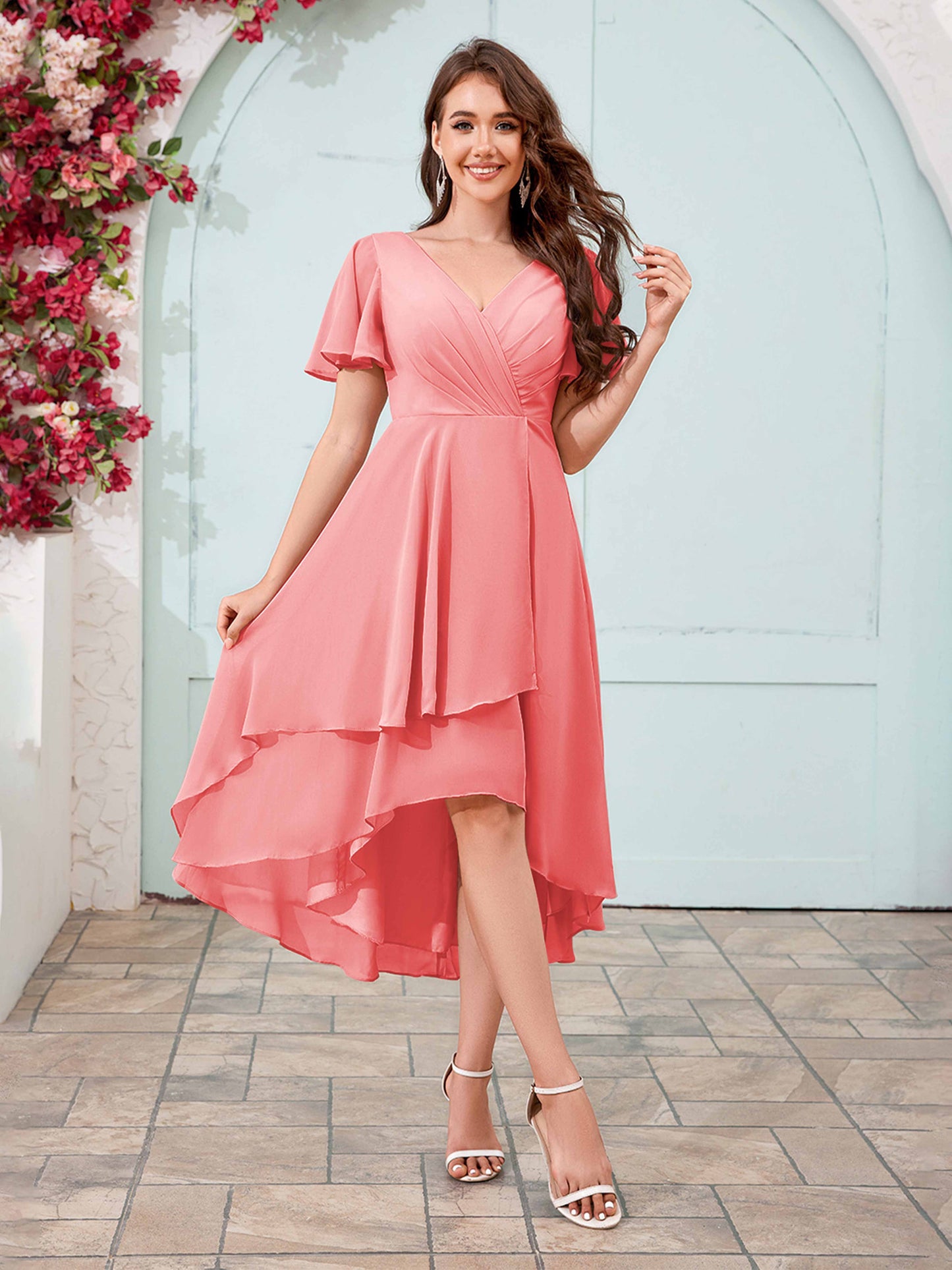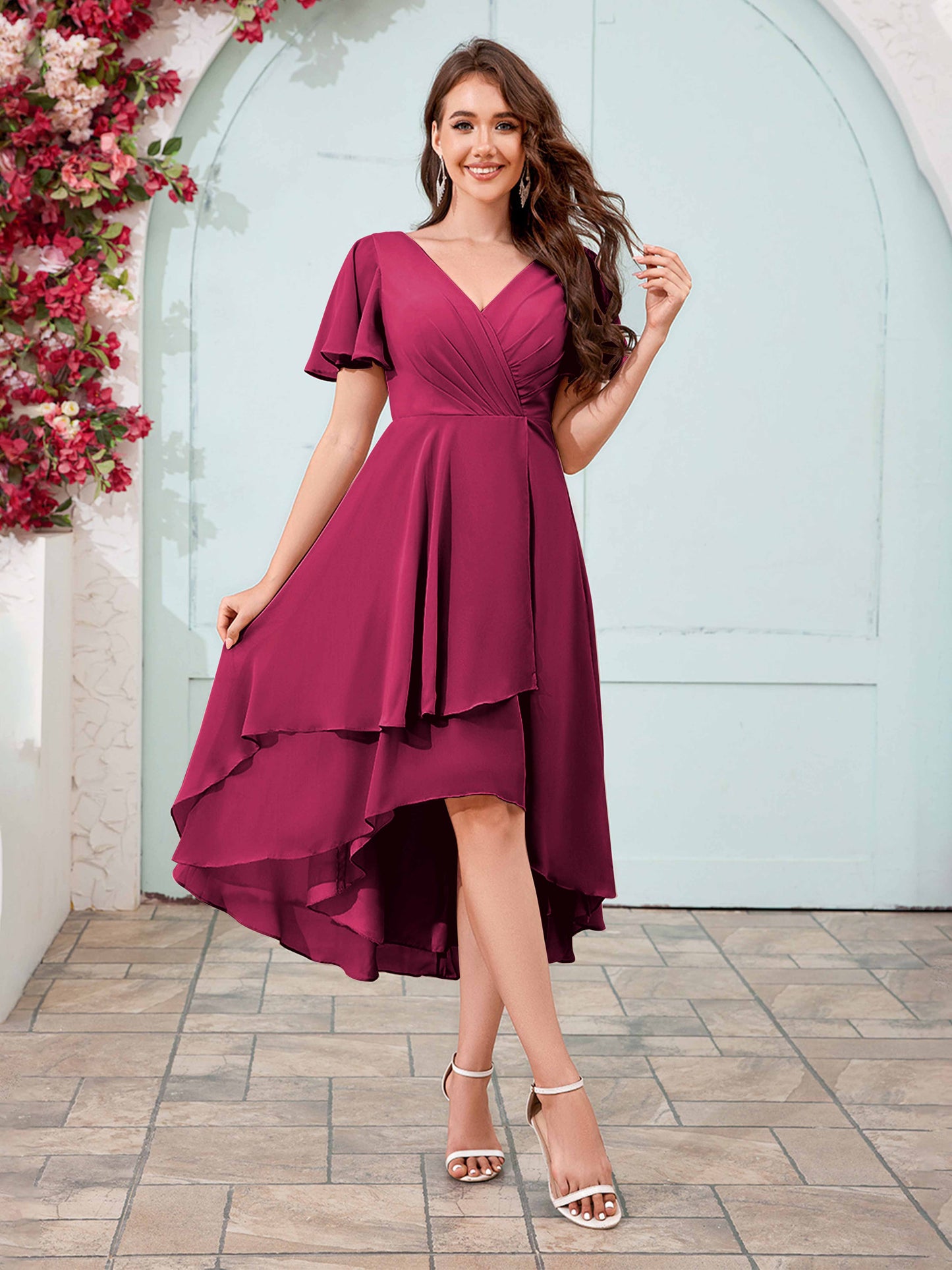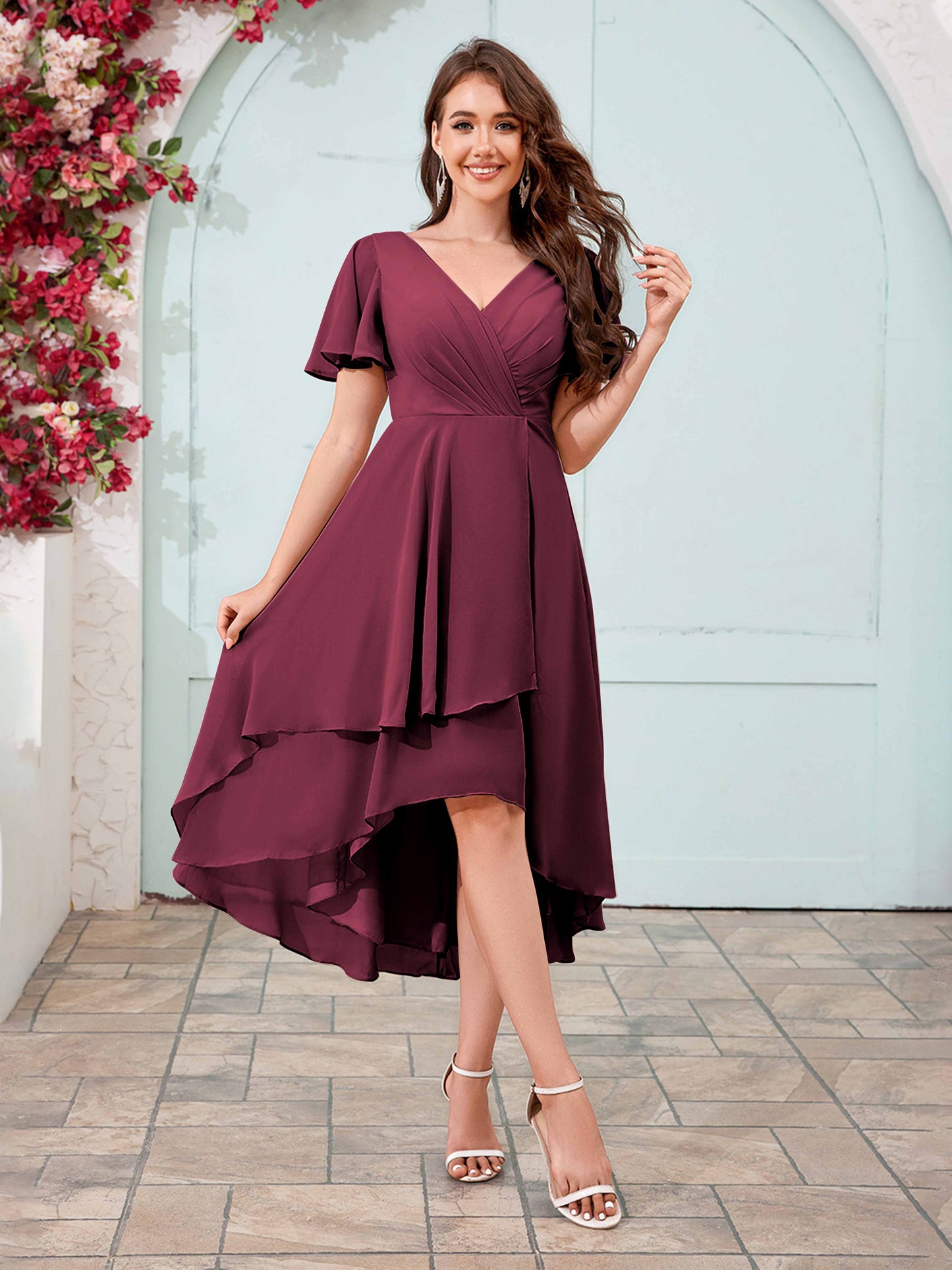 We picked this dress for a summer wedding, and it was perfect. The chiffon was so lightweight, keeping us cool even in the heat. The V-neck and ruching were super flattering, and the high-low hem added a stylish twist that made our photos stand out. The short sleeves were a nice touch for a bit of elegance without feeling too formal.