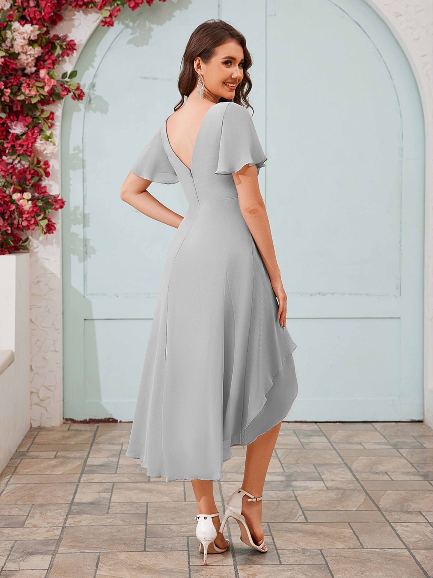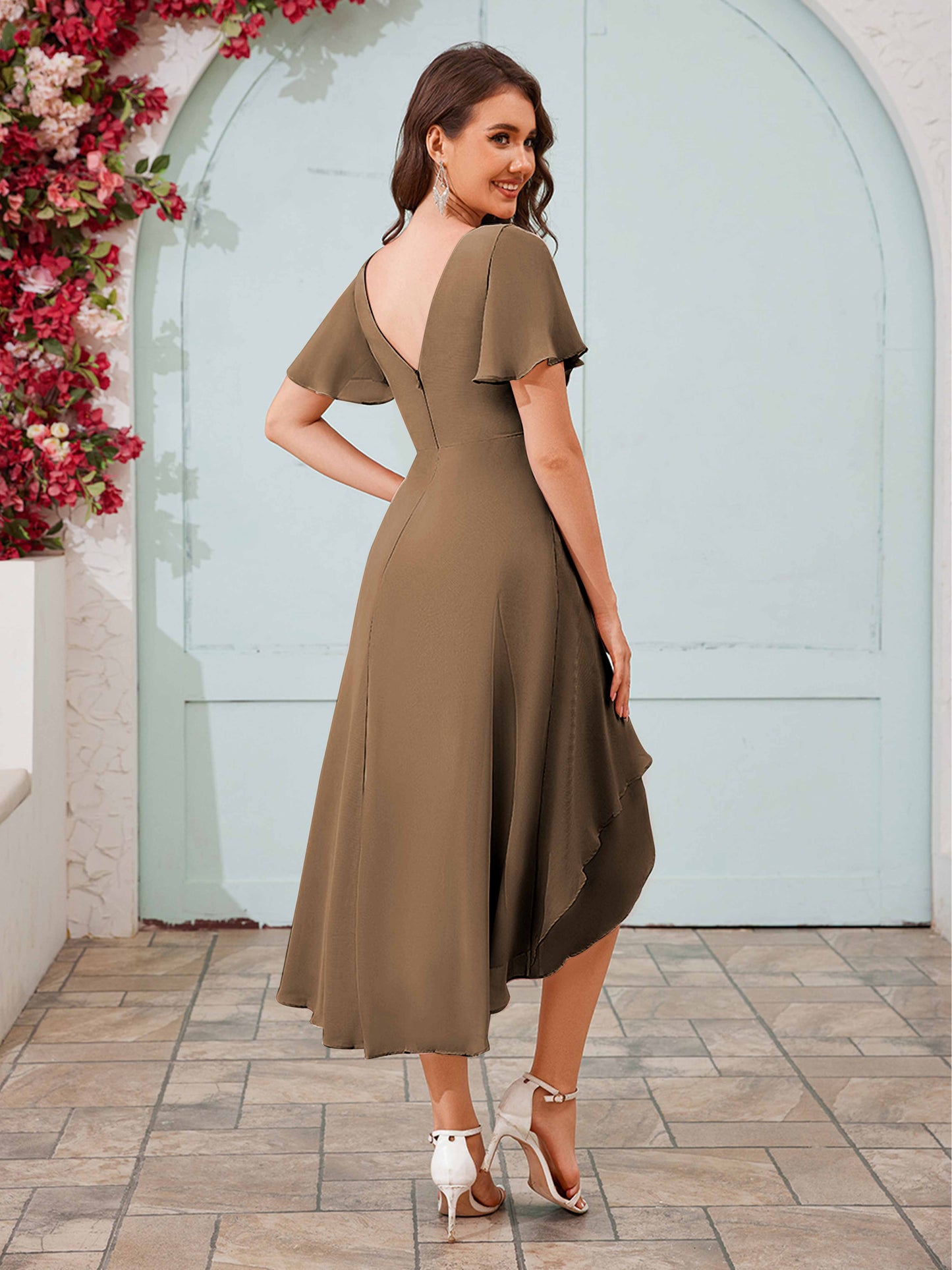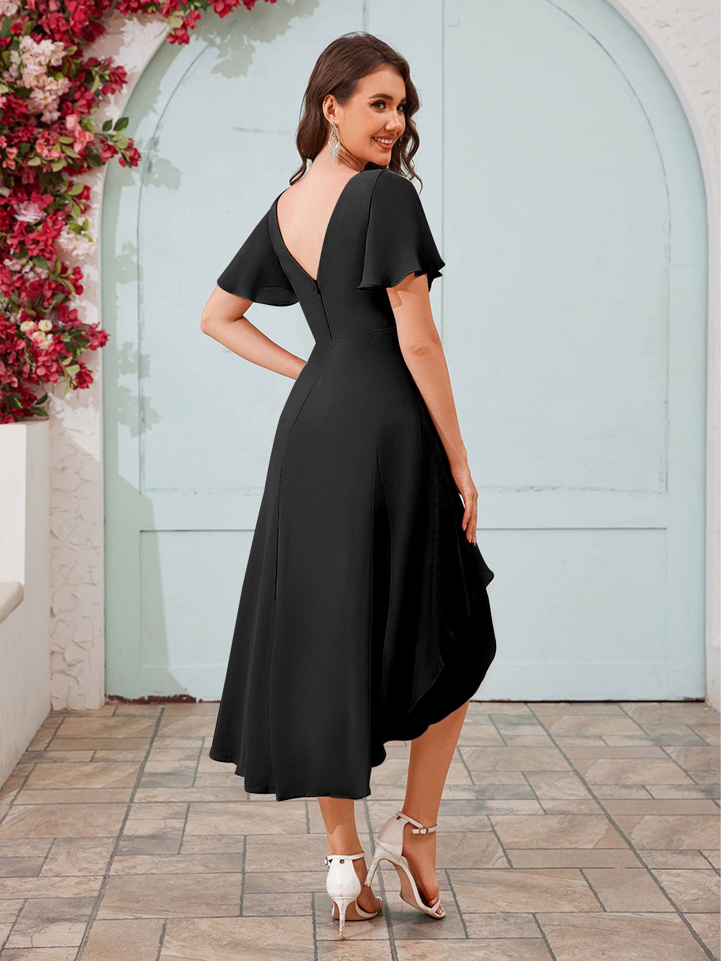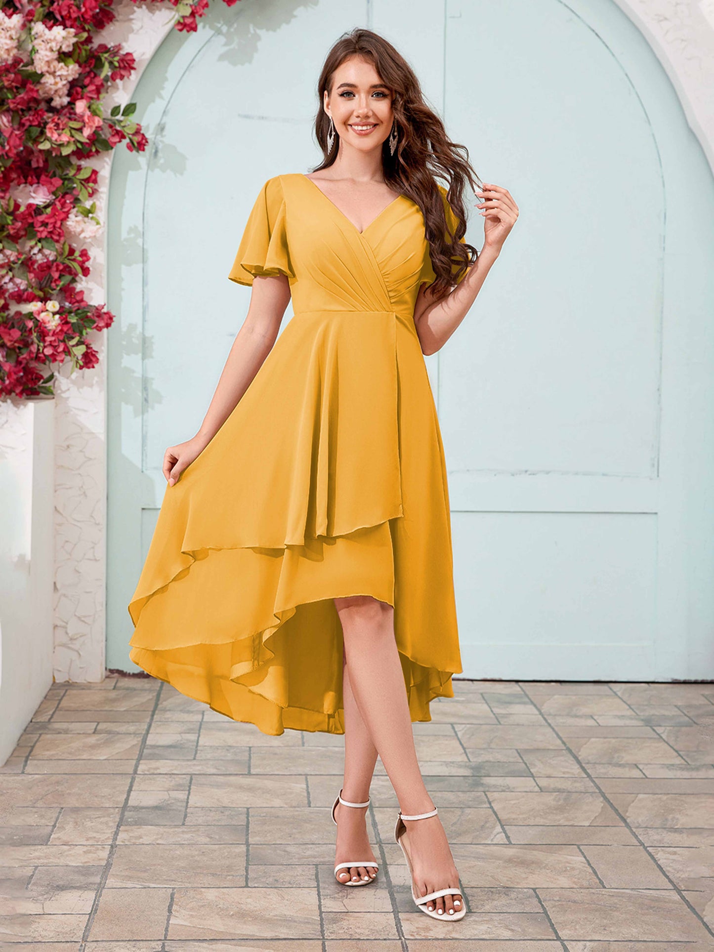 We picked this dress for a summer wedding, and it was perfect. The chiffon was so lightweight, keeping us cool even in the heat. The V-neck and ruching were super flattering, and the high-low hem added a stylish twist that made our photos stand out. The short sleeves were a nice touch for a bit of elegance without feeling too formal.