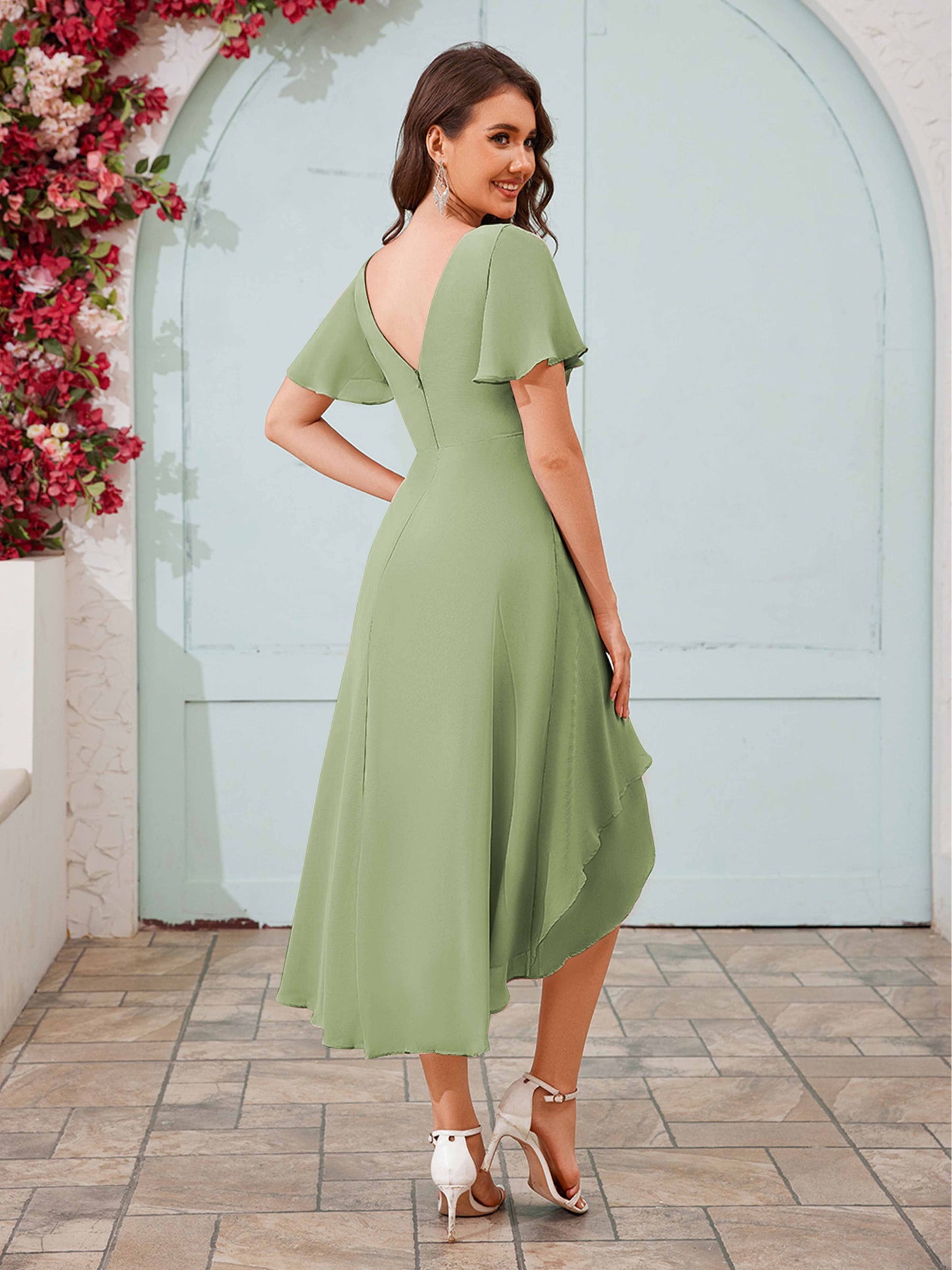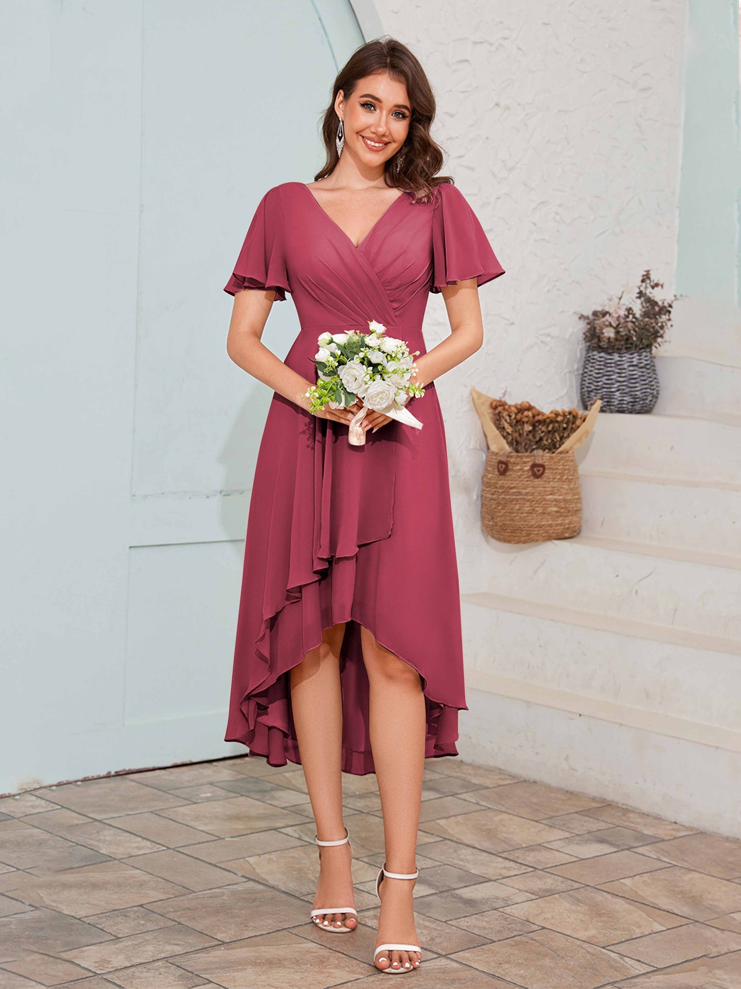 Trendy V-Neck Short Sleeves Ruched High Low Chiffon Bridesmaid Dresses UK