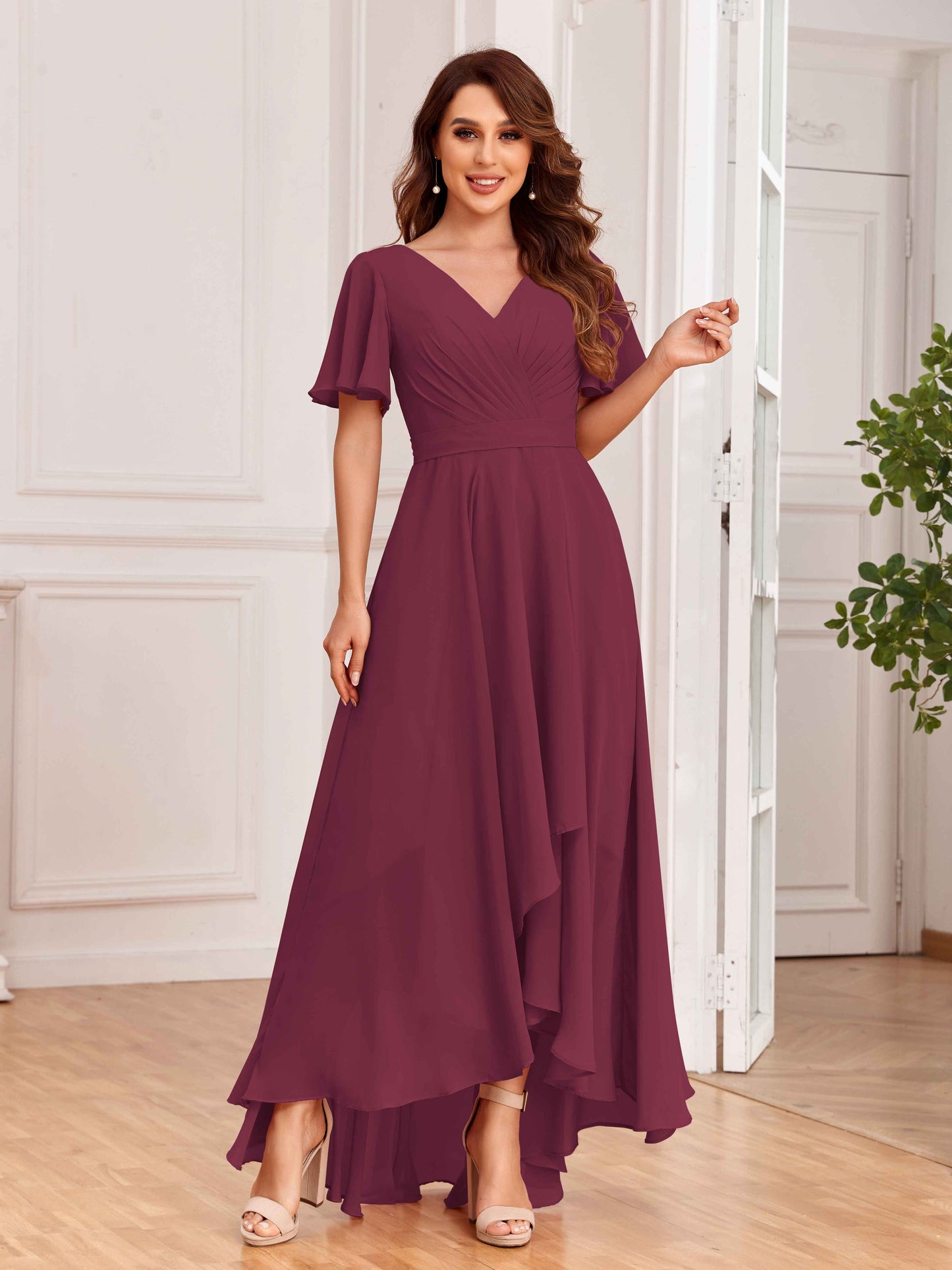 Upscale Short Sleeves Ruffles Lace Up Chiffon Bridesmaid Dresses UK